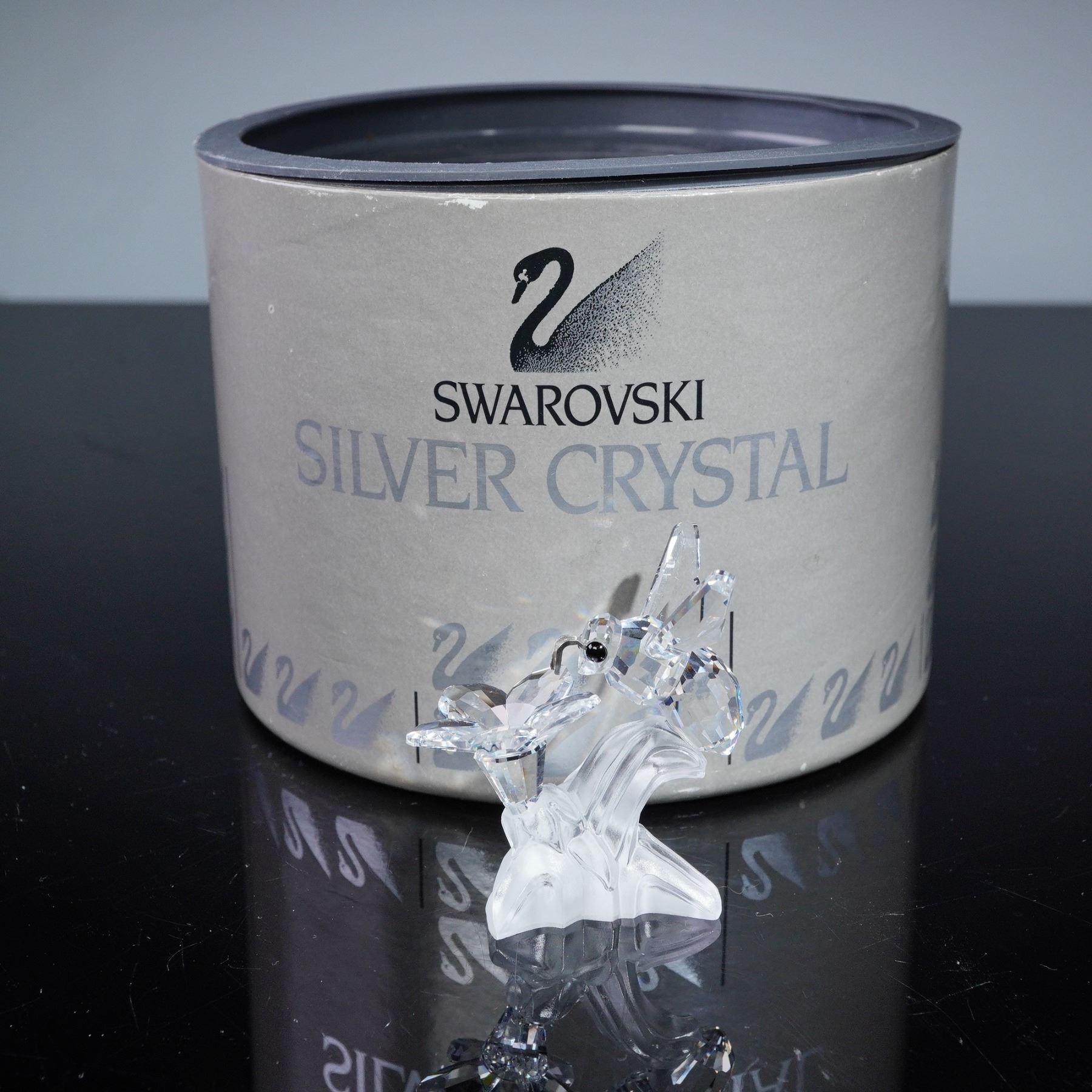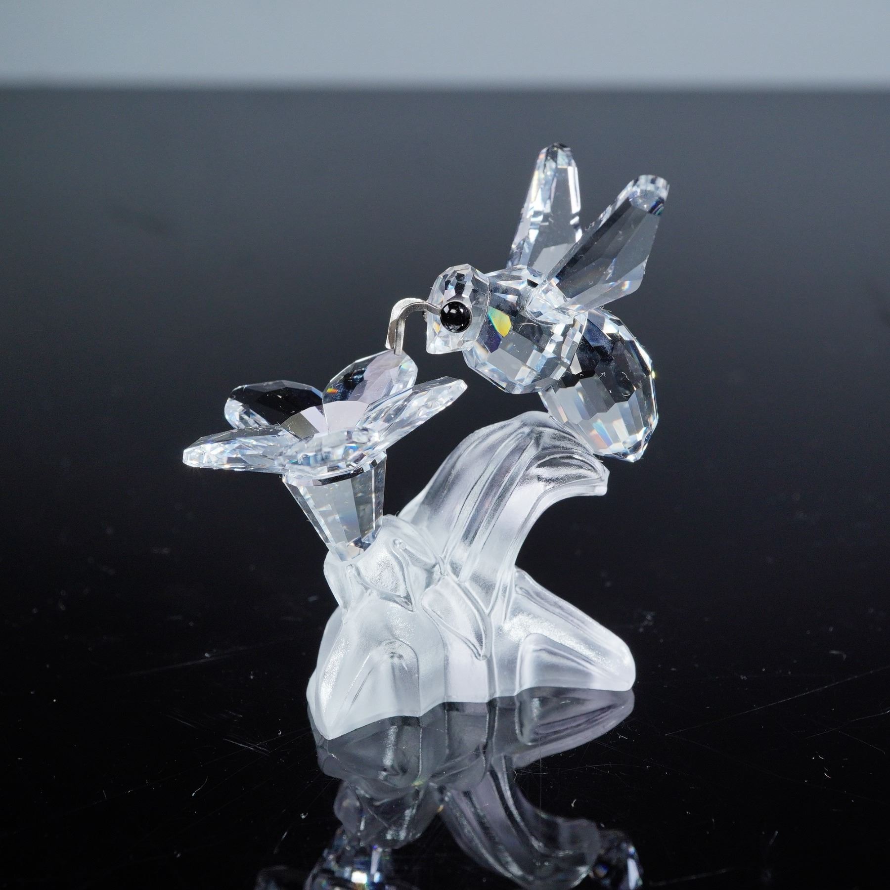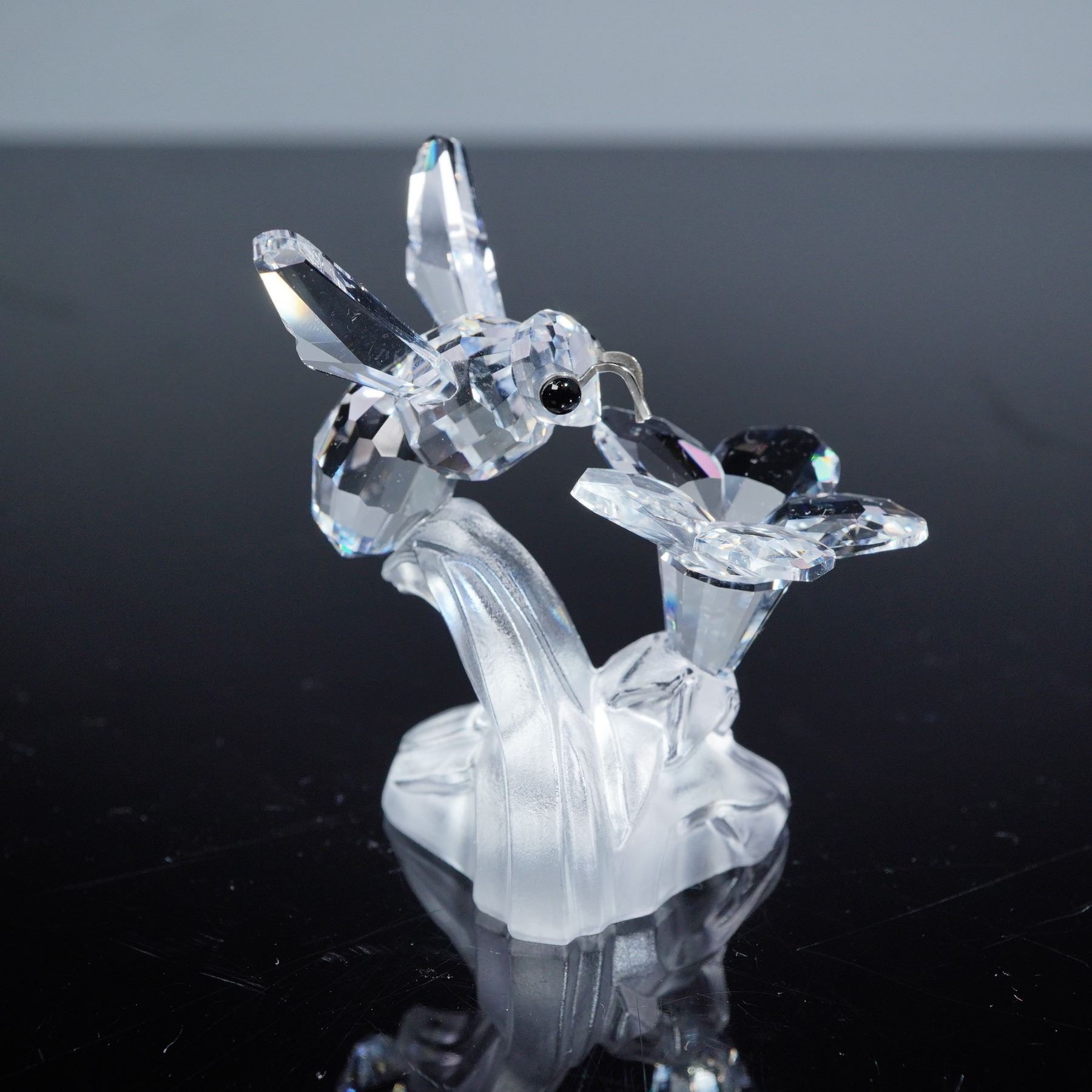 A Swarovski crystal figurine, model 166184, depicting a hummingbird. The faceted clear, colorless crystal hummingbird is shown hovering over and feeding from a flower, which is also crafted from clear crystal. The piece rests on a slightly frosted or satin-finished crystal base. It features small black accents for the hummingbird's eyes and a slender, metallic element for its proboscis. Swarovski etched backstamp.