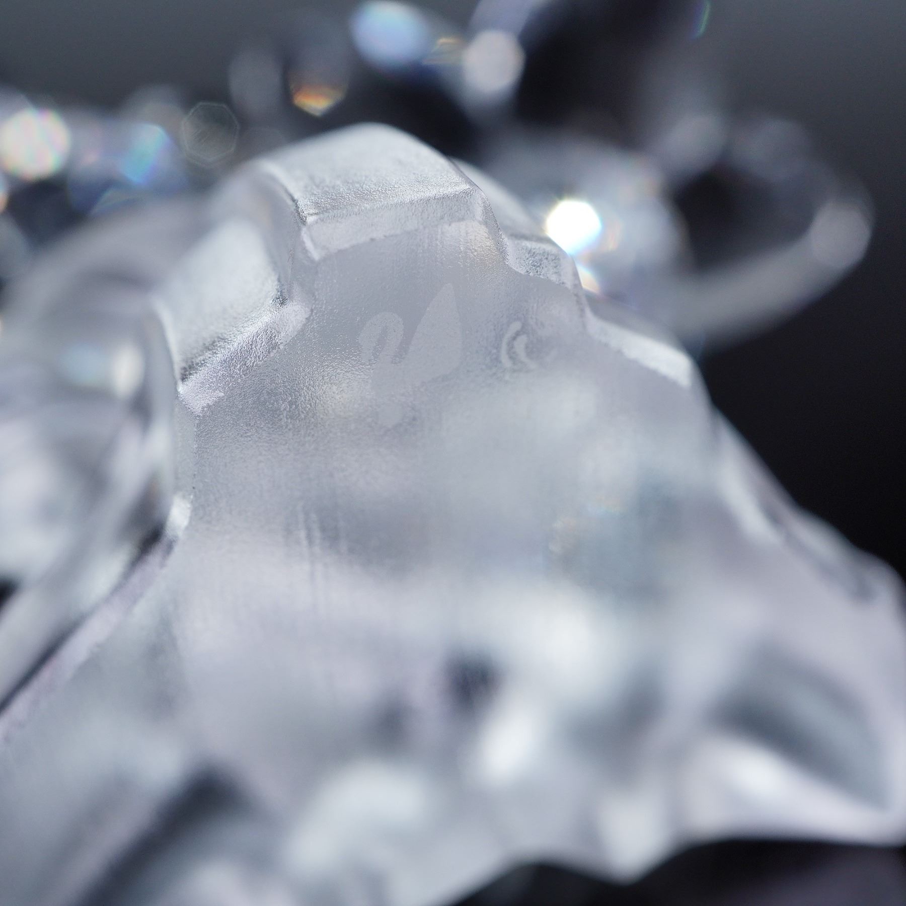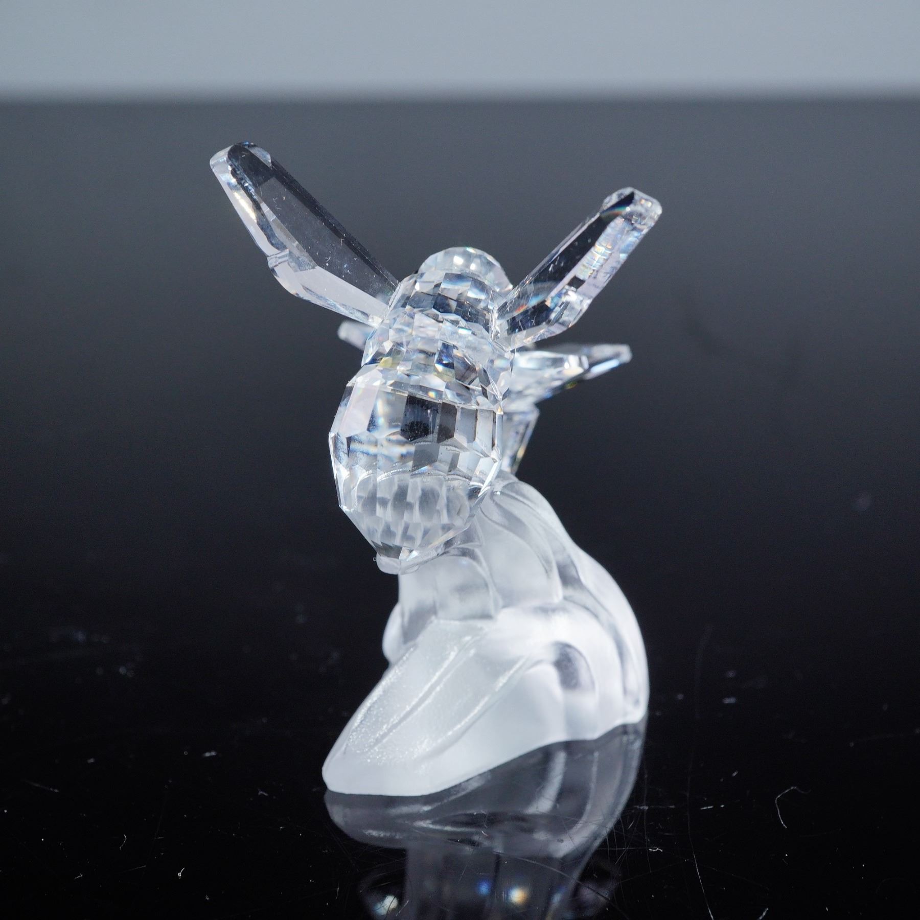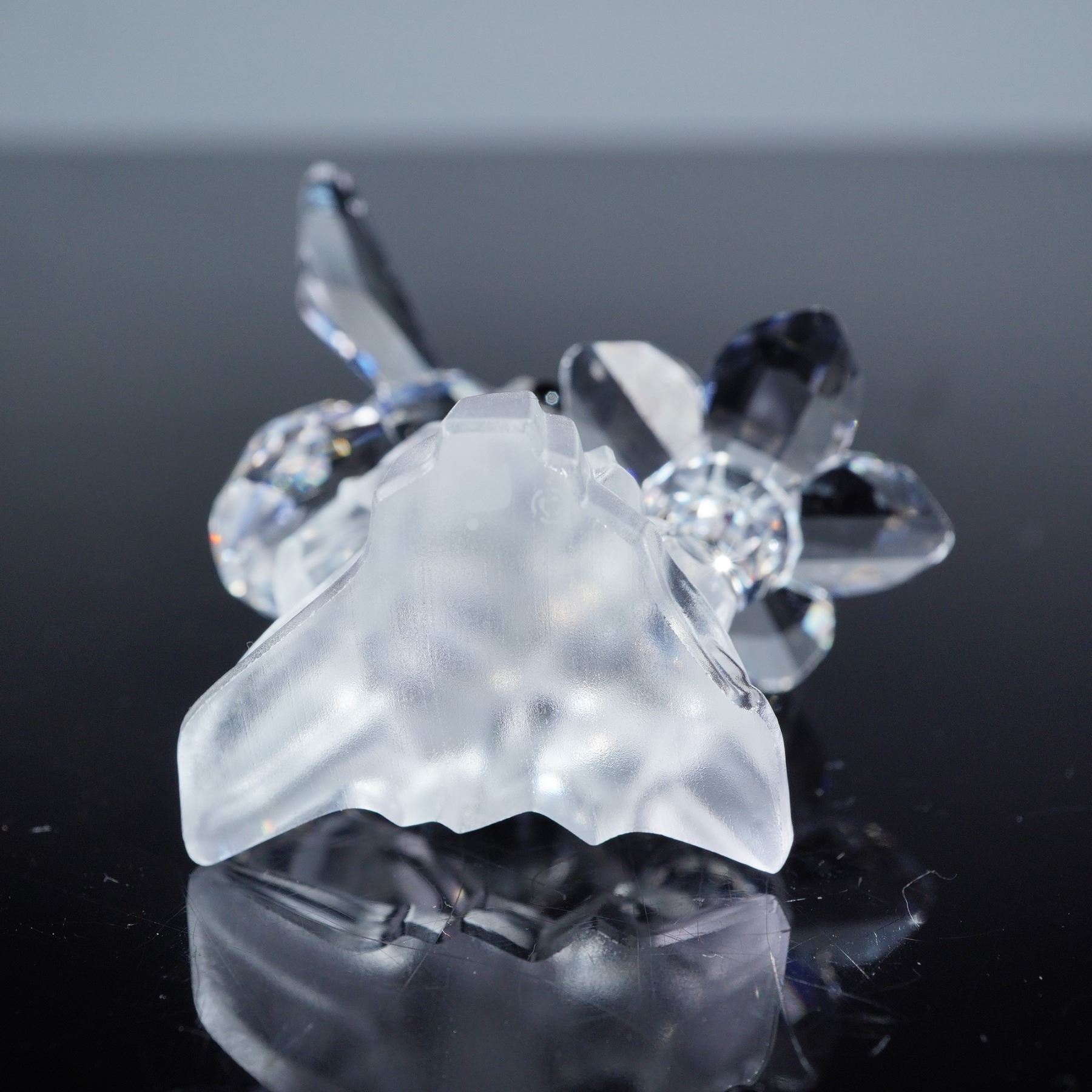 A Swarovski crystal figurine, model 166184, depicting a hummingbird. The faceted clear, colorless crystal hummingbird is shown hovering over and feeding from a flower, which is also crafted from clear crystal. The piece rests on a slightly frosted or satin-finished crystal base. It features small black accents for the hummingbird's eyes and a slender, metallic element for its proboscis. Swarovski etched backstamp.