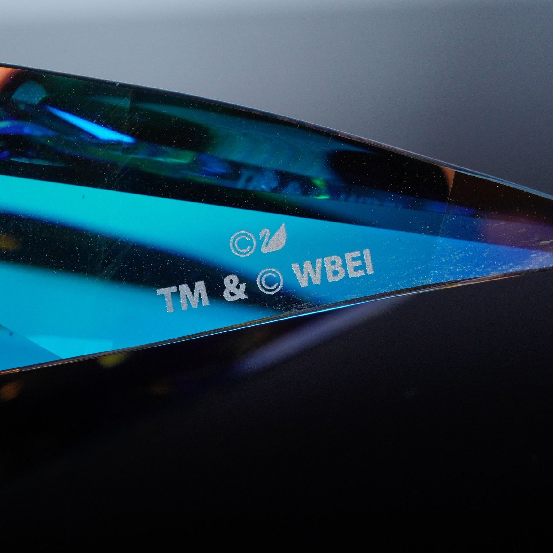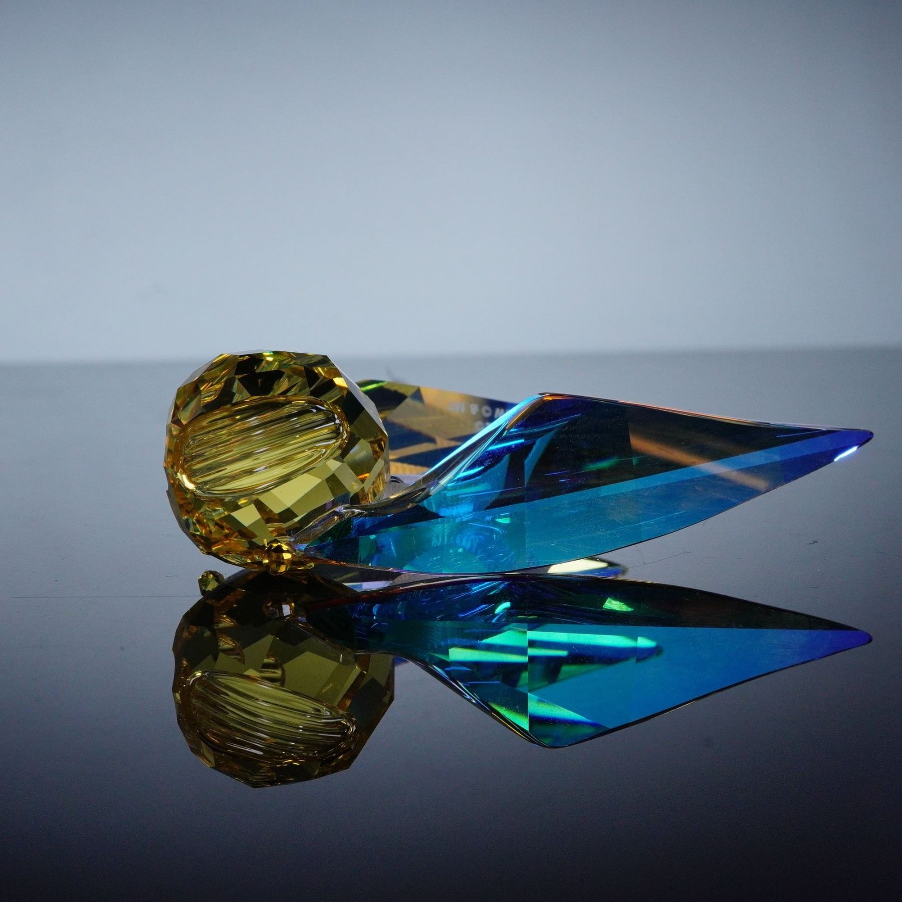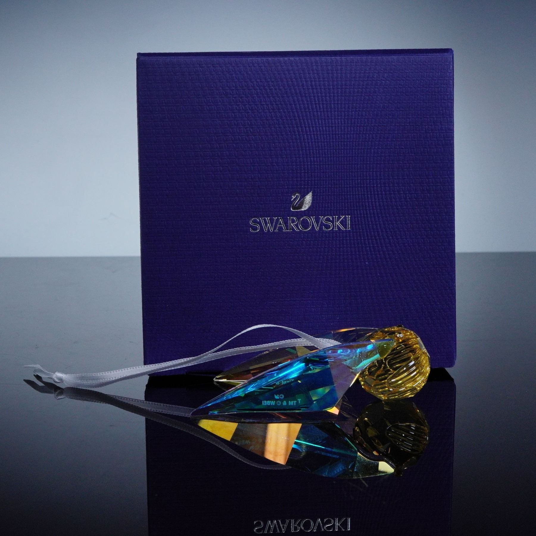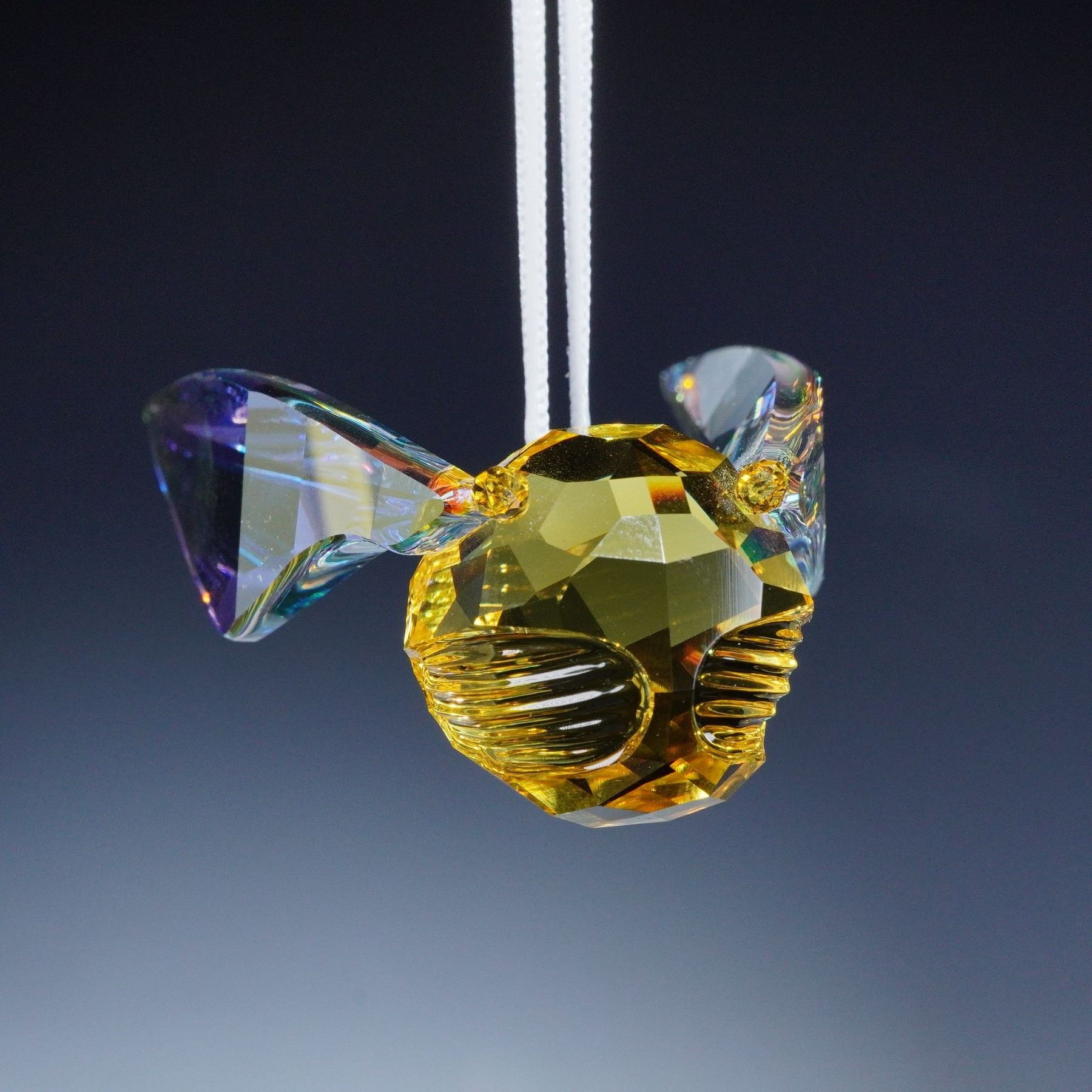 A captivating Swarovski crystal ornament depicting the Golden Snitch from the Harry Potter series. A beloved symbol of the wizarding world, the Golden Snitch is the enchanted Quidditch ball pursued by Seekers during the game. This design sparkles with a faceted golden crystal sphere complemented by iridescent wings finished in Swarovski's signature Aurora Borealis effect. Suspended from a white satin ribbon for display. The piece bears the Swarovski swan logo and Warner Bros. Entertainment markings. Includes original Swarovski box. Model 5506801.
