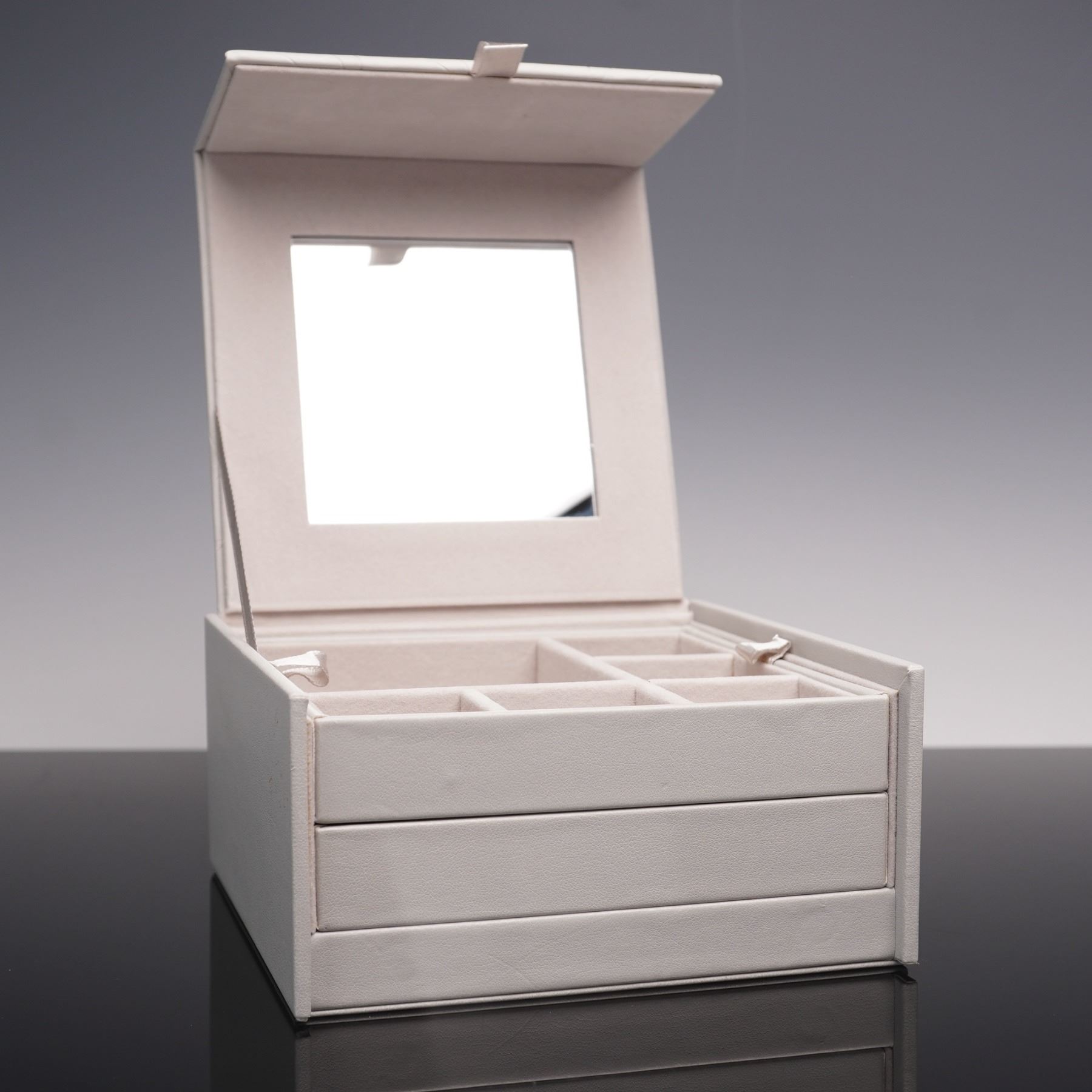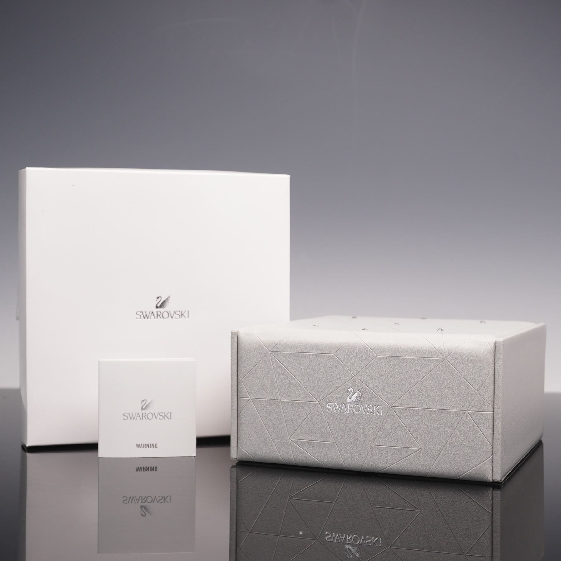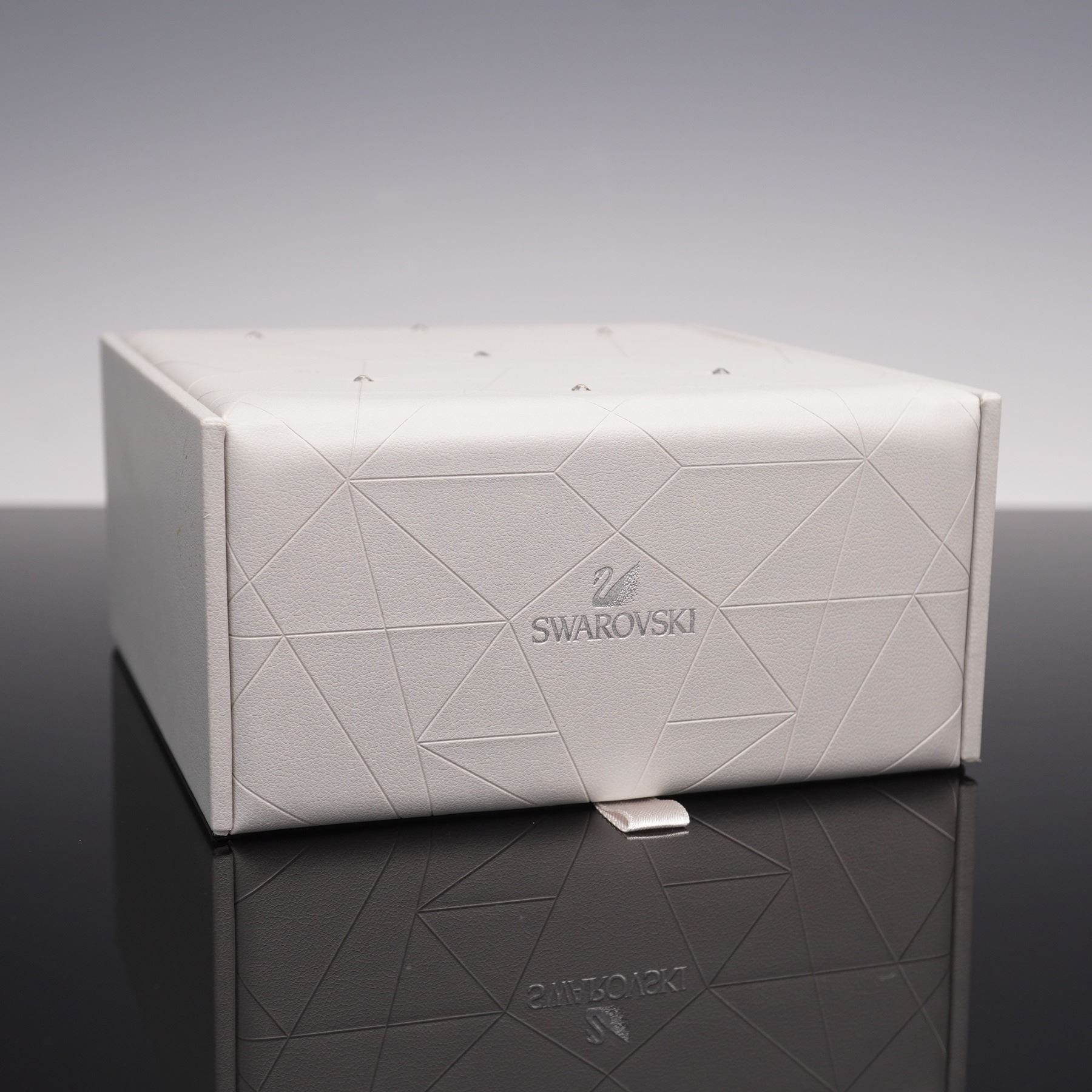This elegant Swarovski jewelry box is crafted in a soft gray finish with a subtle geometric pattern accented by the Swarovski swan logo in silver. The hinged lid opens to reveal a mirror, making it both functional and stylish. Inside, the box includes two removable compartment trays designed to neatly organize rings, earrings, necklaces, and other treasures. Swarovski backstamp. This item has its original box. Box measures: 5.75"L x 5.75"W x 2.75"H.