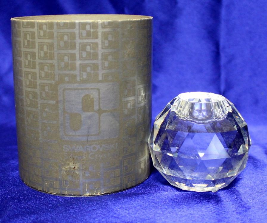 Swarovski King Global Candleholder is for 1 candle. Introduced in 1981 and retired in Dec 1988. Piece measures 2 3/8" in diameter. In original box and in excellent condition.