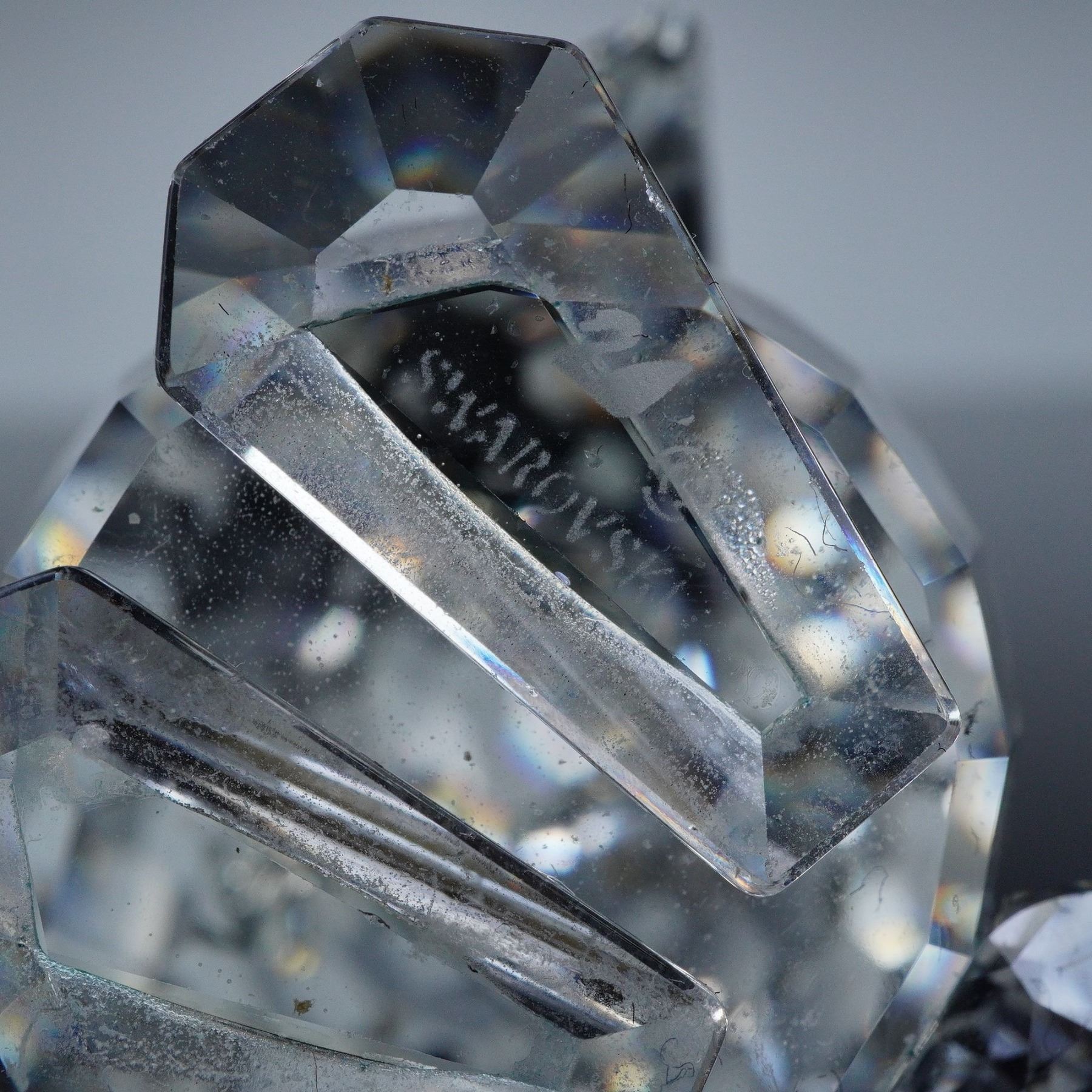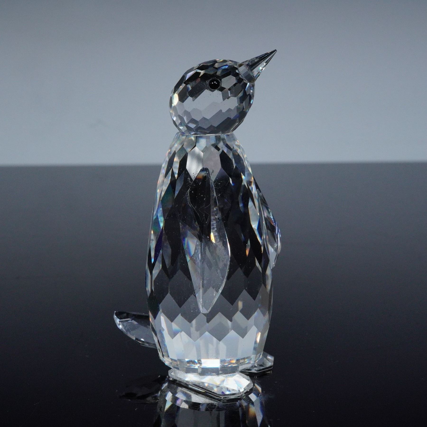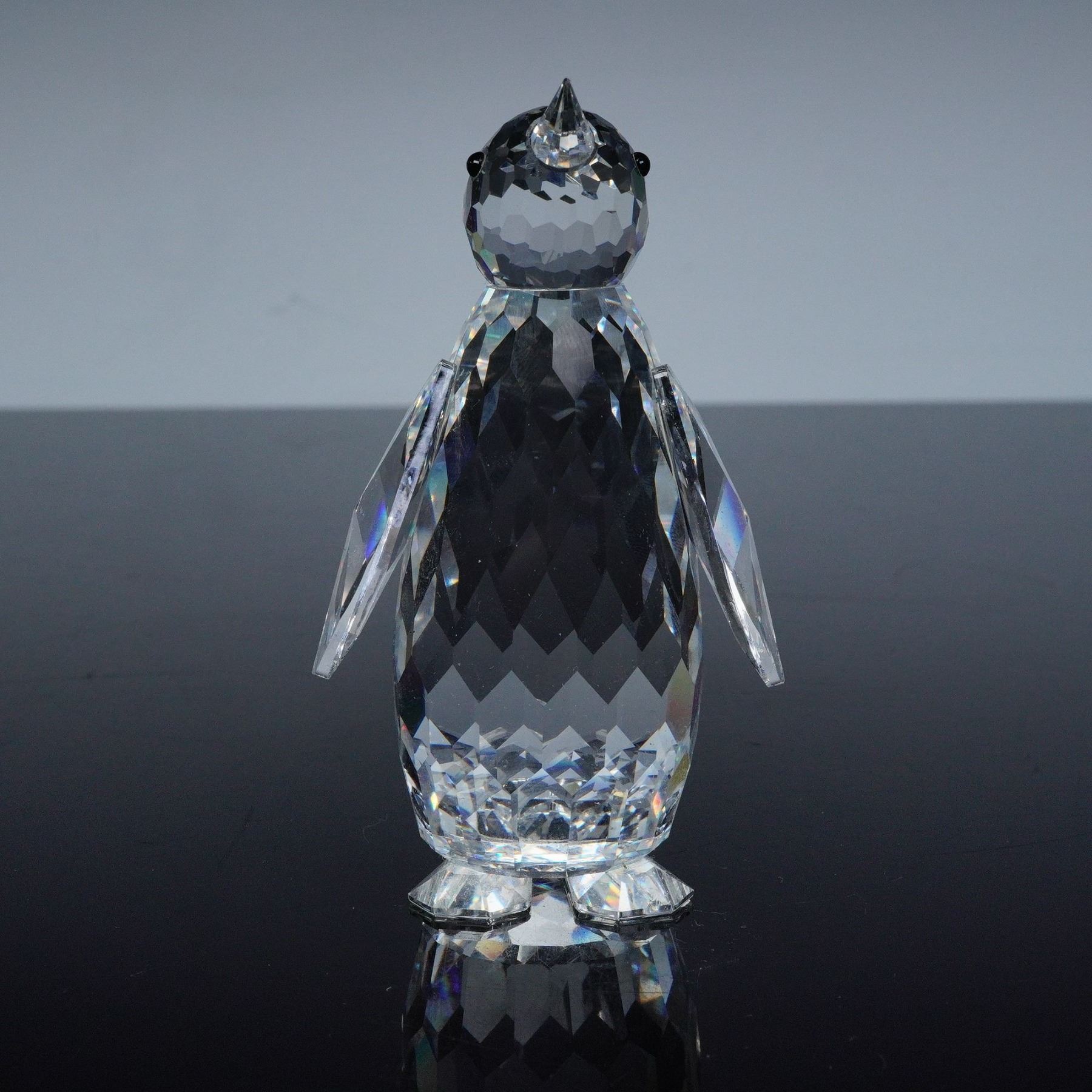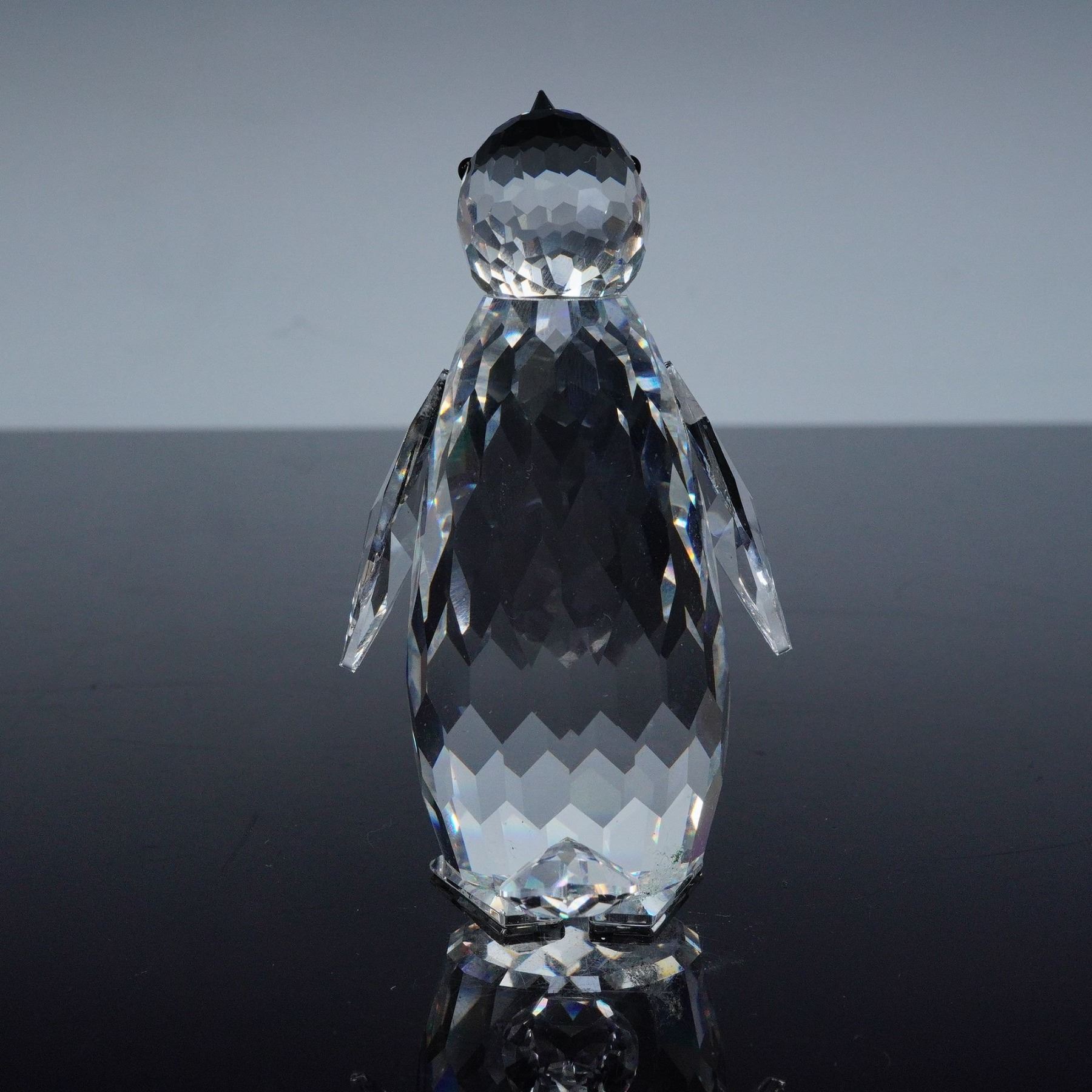 From the Kingdom of Ice & Snow collection, this elegant piece features a beautifully faceted clear crystal body with black crystal eyes and a pointed beak, capturing the graceful and endearing form of a penguin in fine detail. The figure displays expert craftsmanship and precise light refraction, typical of Swarovski artistry. Marked "Swarovski" on the base and presented with its original branded cylindrical box. Model No. 010008.