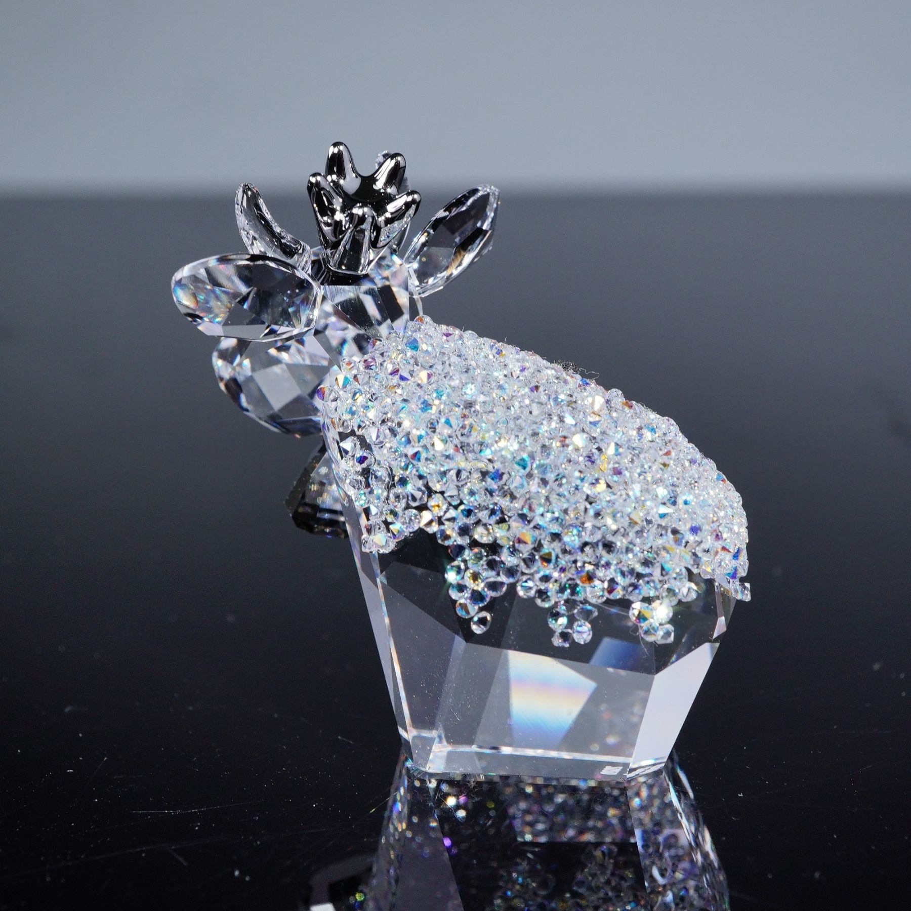 A Swarovski 'Birthday Princess Mo' crystal figurine, reference 5492750, issued as a Limited Edition in 2020. This modern decorative figurine depicts the stylized 'Mo' character, primarily composed of faceted clear crystal. The body is densely adorned with numerous small, round-cut crystals exhibiting an iridescent Aurora Borealis (AB) finish. The head, ears, and stylized antlers are crafted from larger, clear faceted crystal components, accented by small black elements. Swarovski etched backstamp.