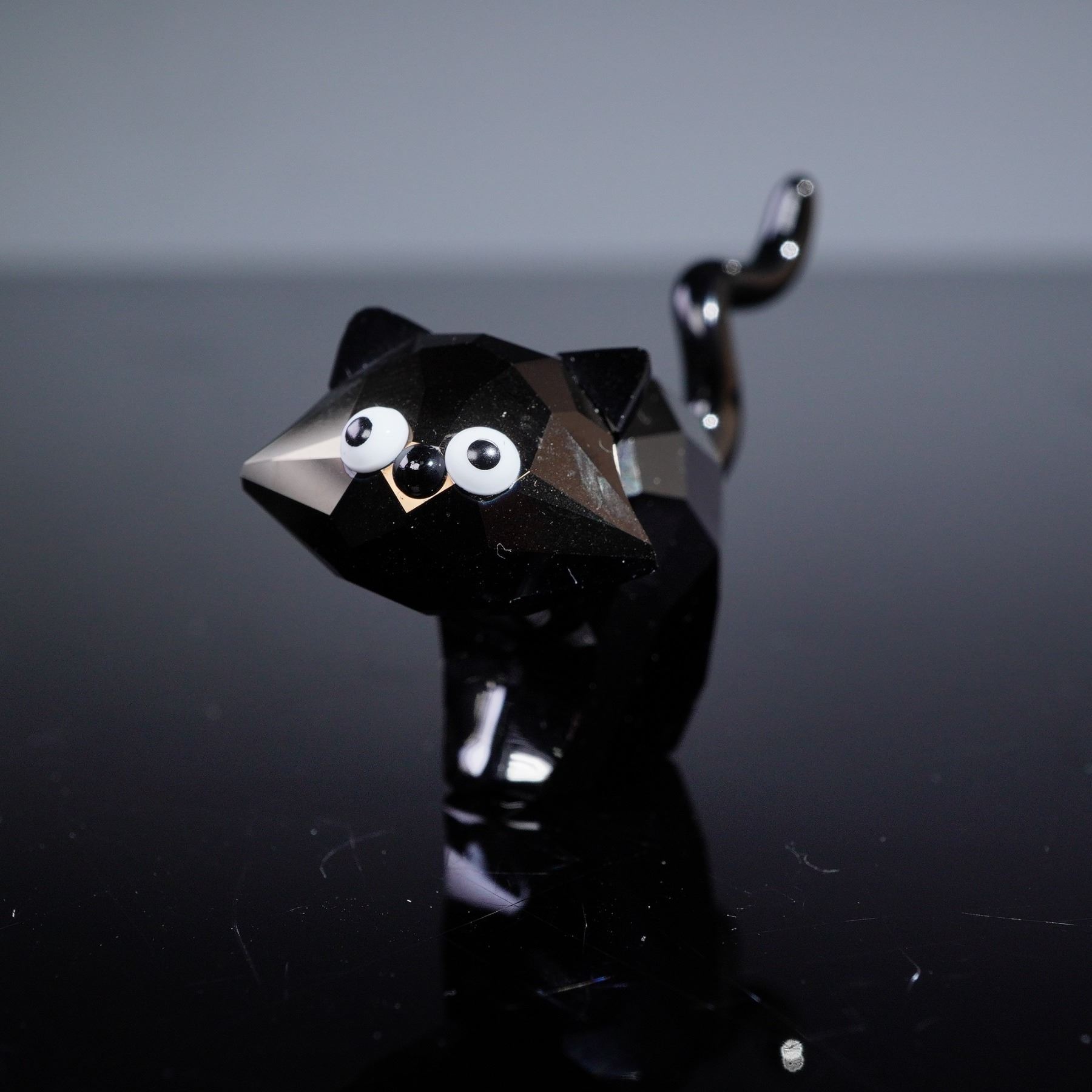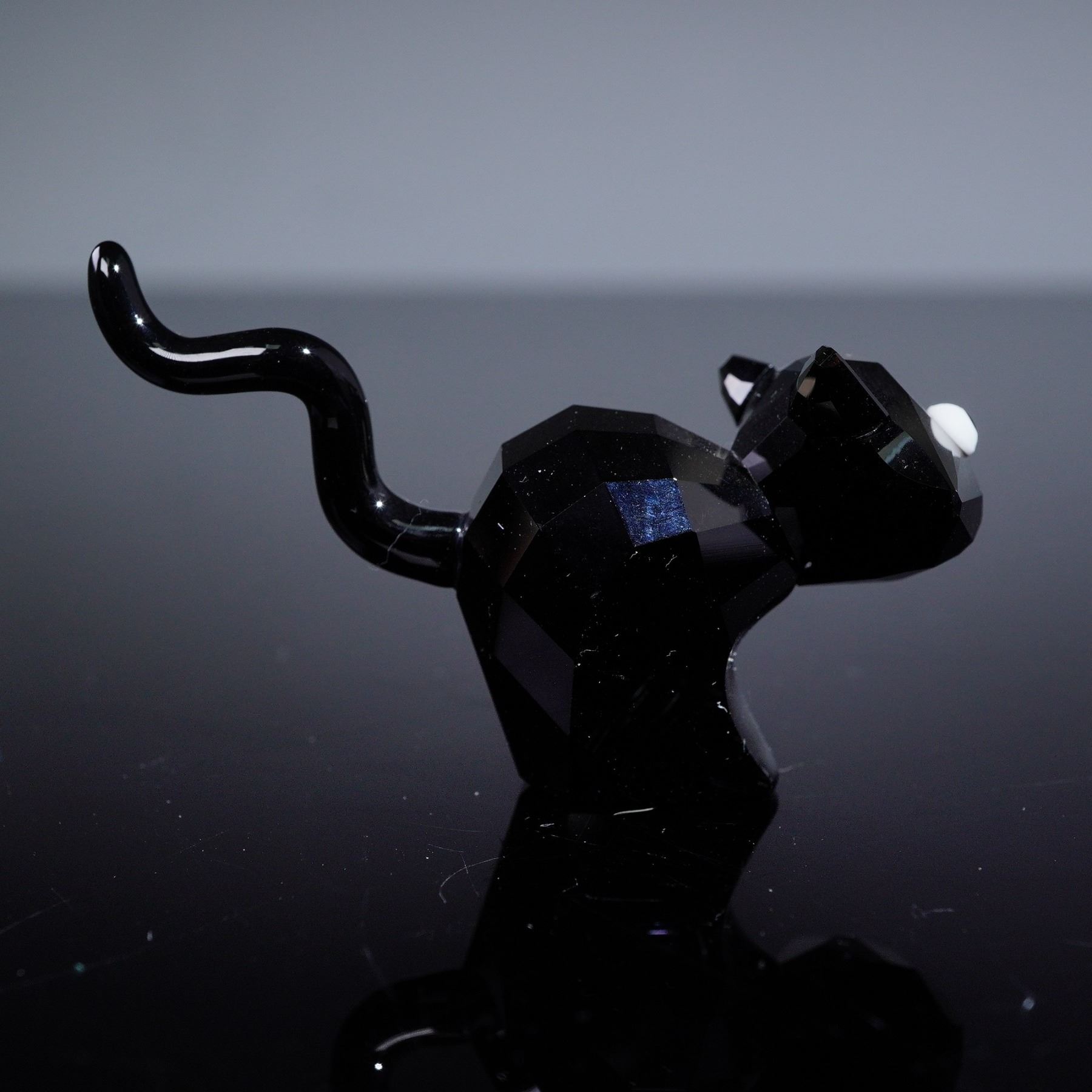 A Swarovski Lovlots 'Theo the Cat' Limited Edition figurine, dating from 2009. This highly stylized figurine depicts a black cat, crafted from faceted black crystal with a glossy finish. The body is composed of numerous geometric facets, while the raised tail is smooth and curved. It features round, opaque white eyes with black pupils. Swarovski etched backstamp.