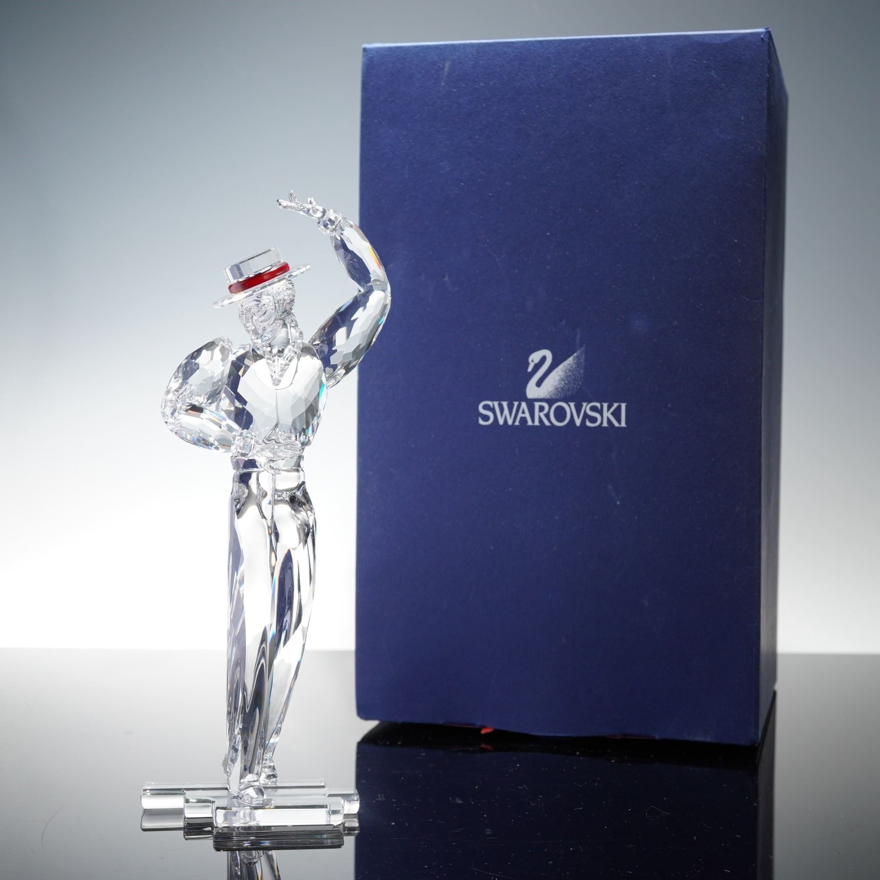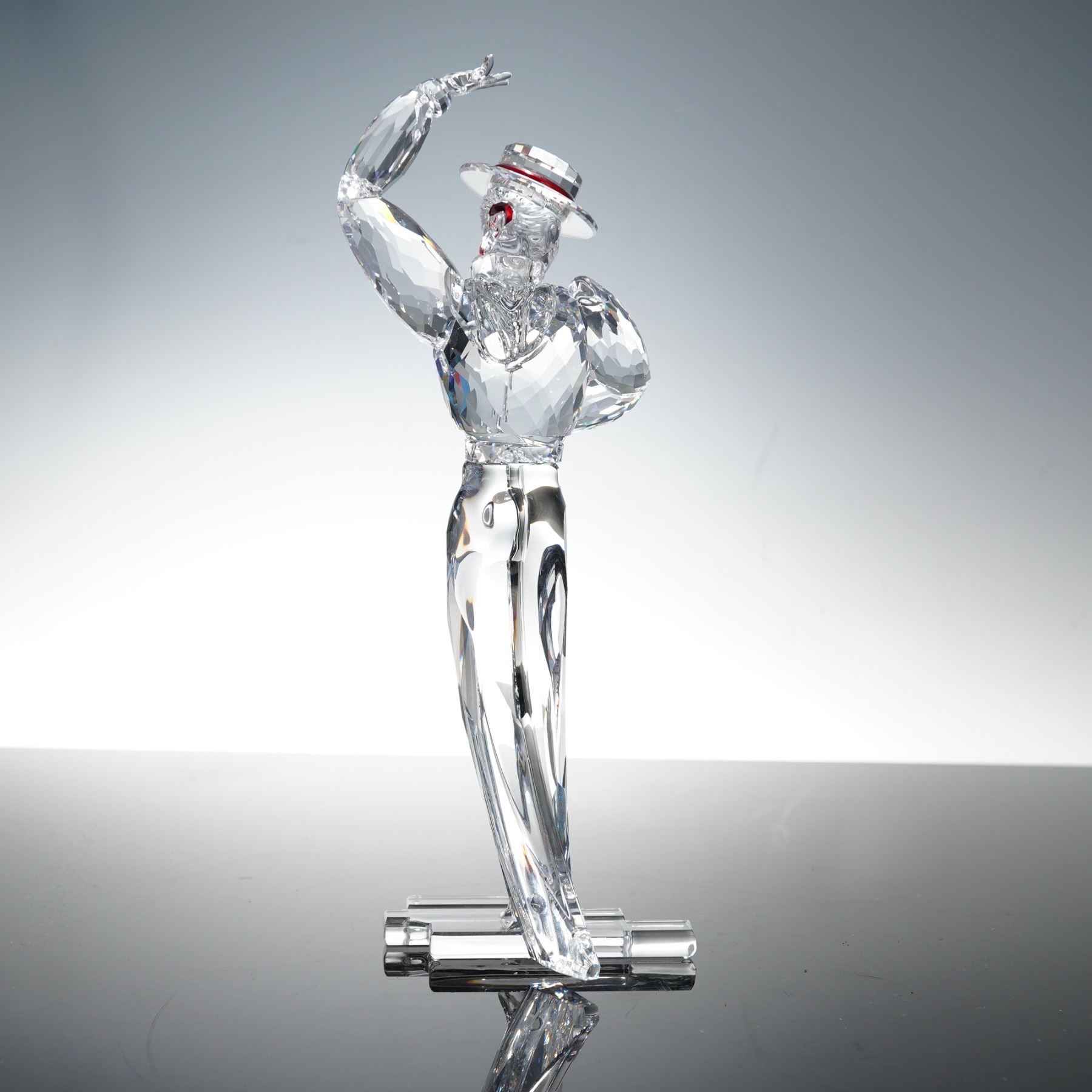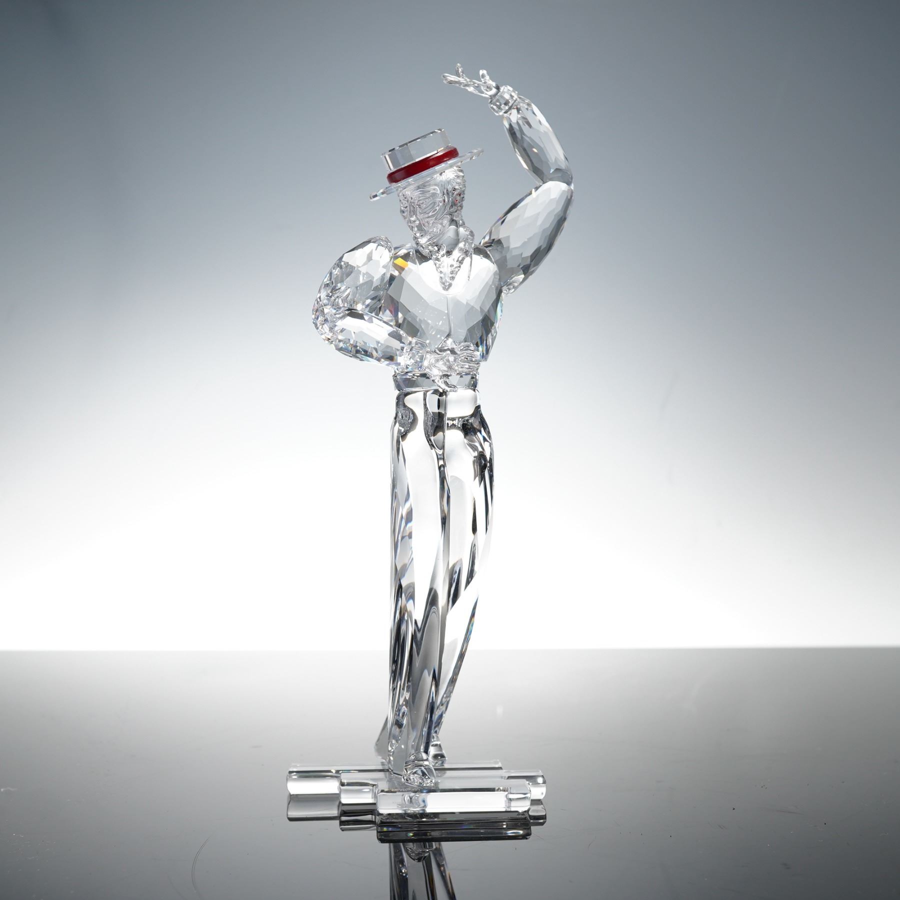 A dazzling crystal figurine from the "Magic of Dance" series, depicting Antonio in a graceful mid-dance pose. The piece showcases exquisite faceting throughout the clear crystal form, with detailed sculpting that captures the rhythm and elegance of movement. Accented by a translucent hat band in deep red, the figure stands poised atop a clear rectangular base. Includes the original Swarovski box and bears the signature swan logo etched at the base. Model No. 606441.