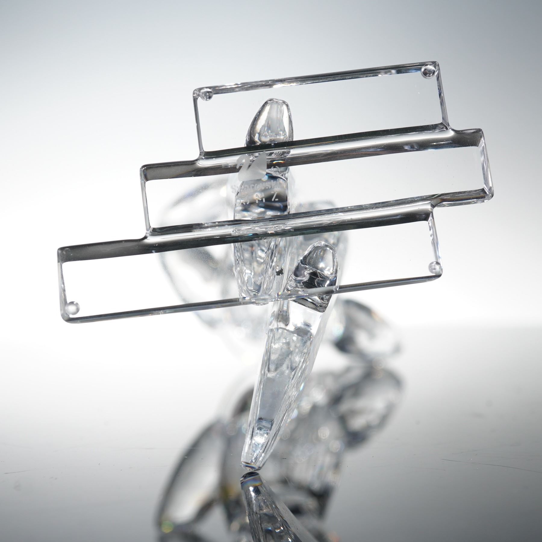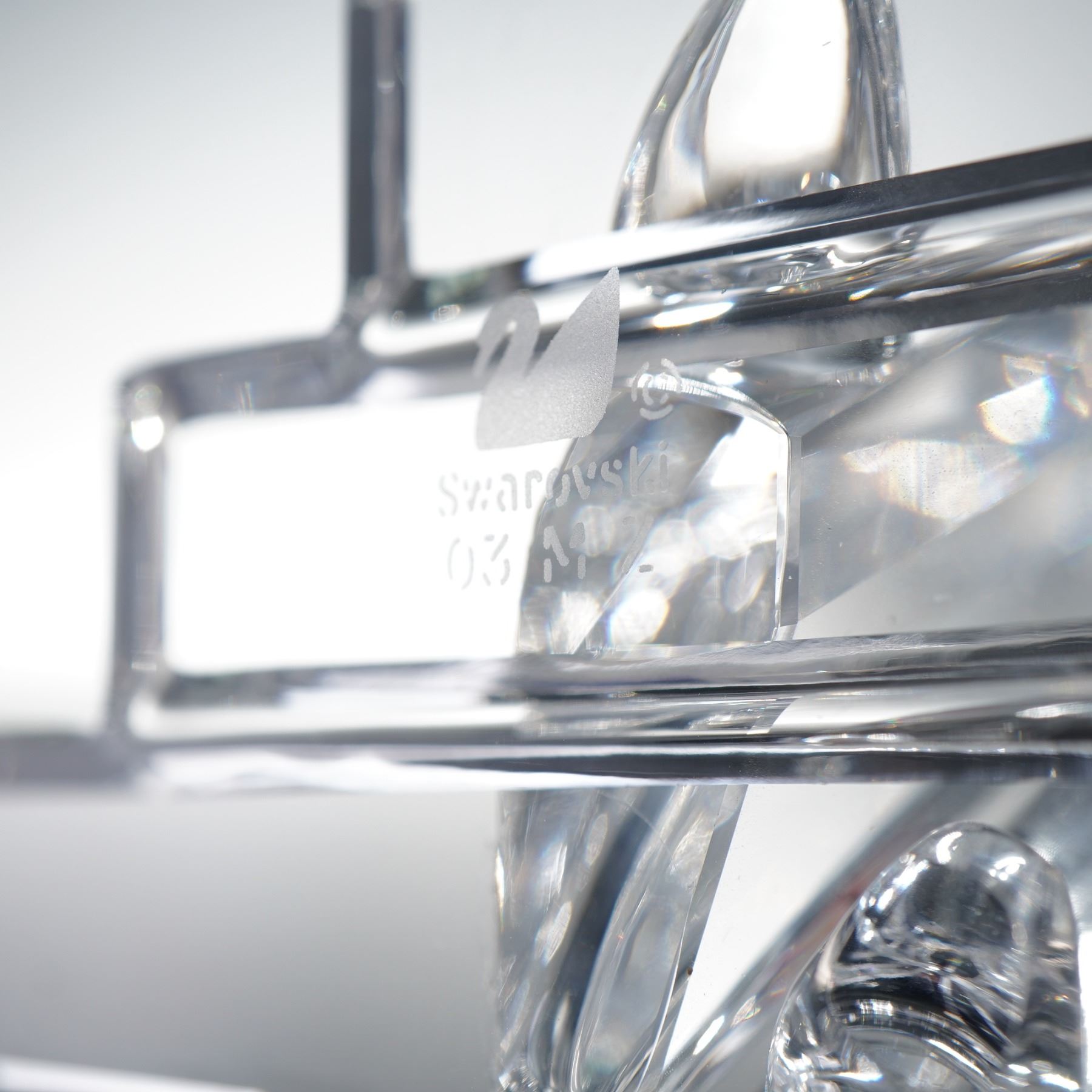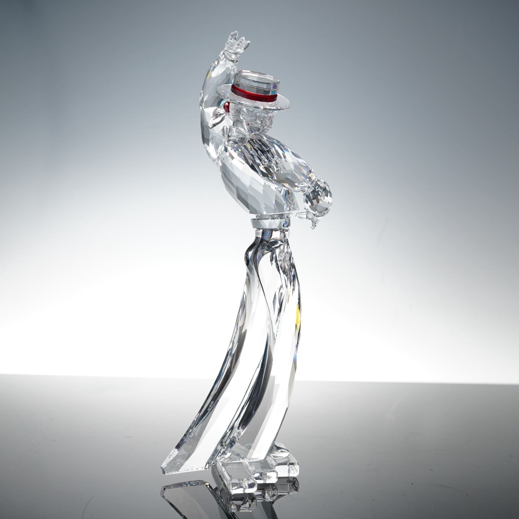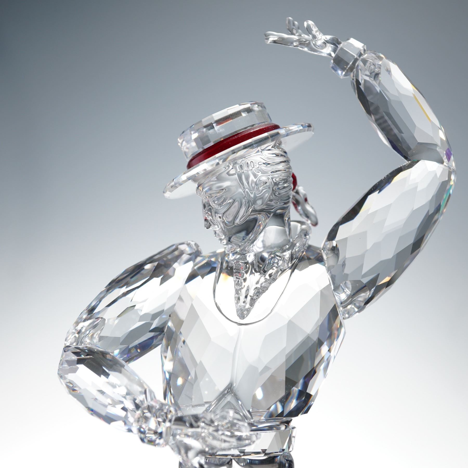 A dazzling crystal figurine from the "Magic of Dance" series, depicting Antonio in a graceful mid-dance pose. The piece showcases exquisite faceting throughout the clear crystal form, with detailed sculpting that captures the rhythm and elegance of movement. Accented by a translucent hat band in deep red, the figure stands poised atop a clear rectangular base. Includes the original Swarovski box and bears the signature swan logo etched at the base. Model No. 606441.
