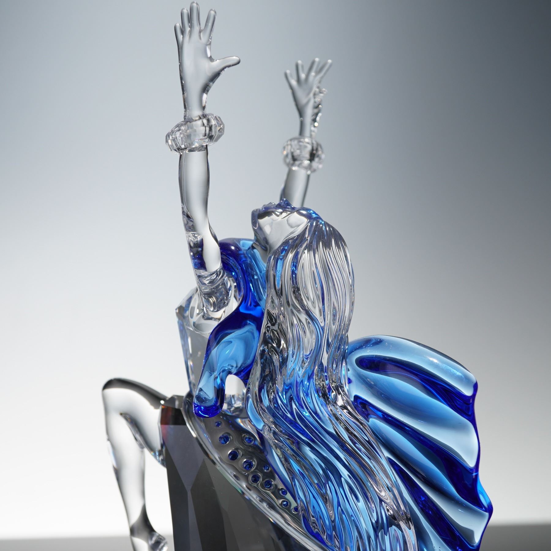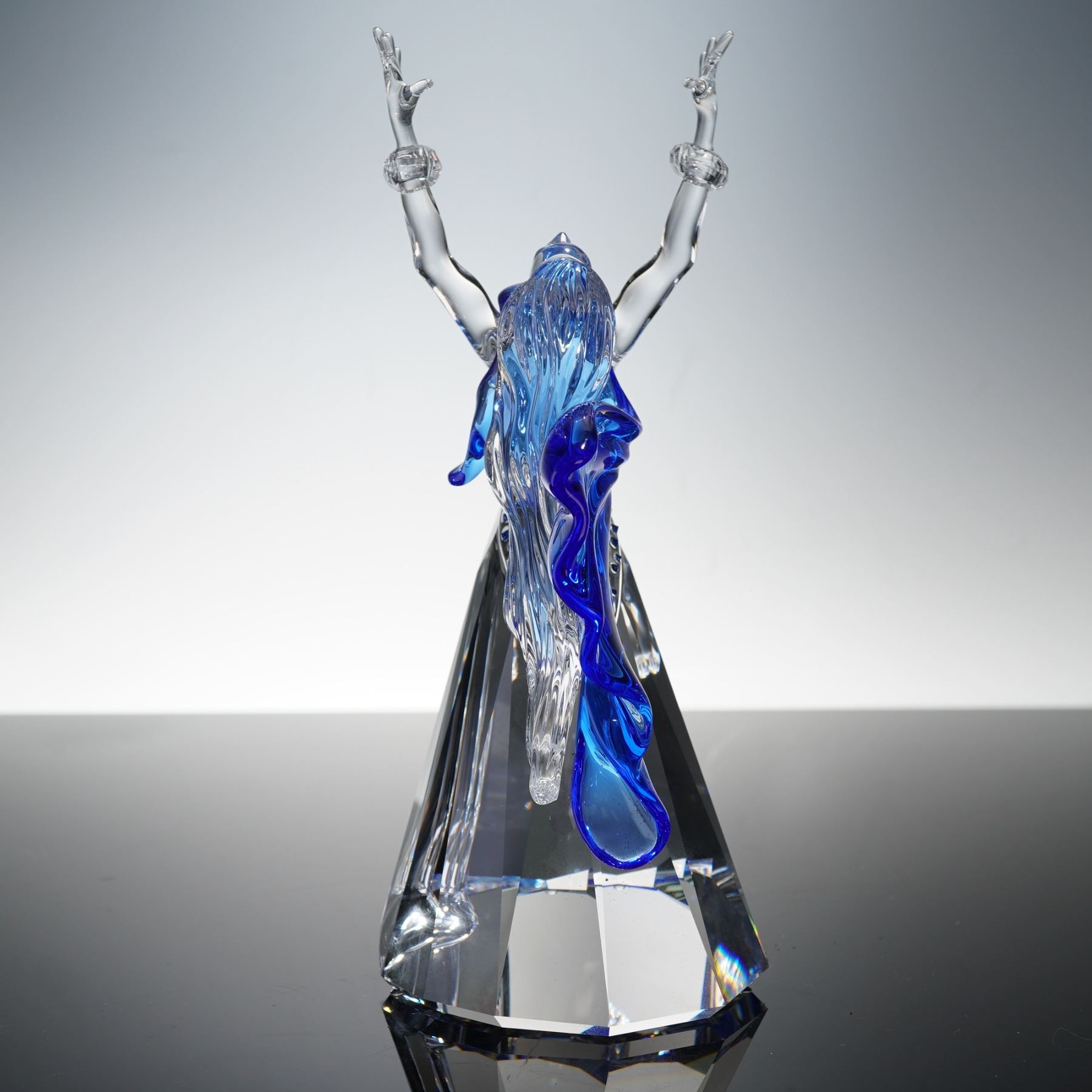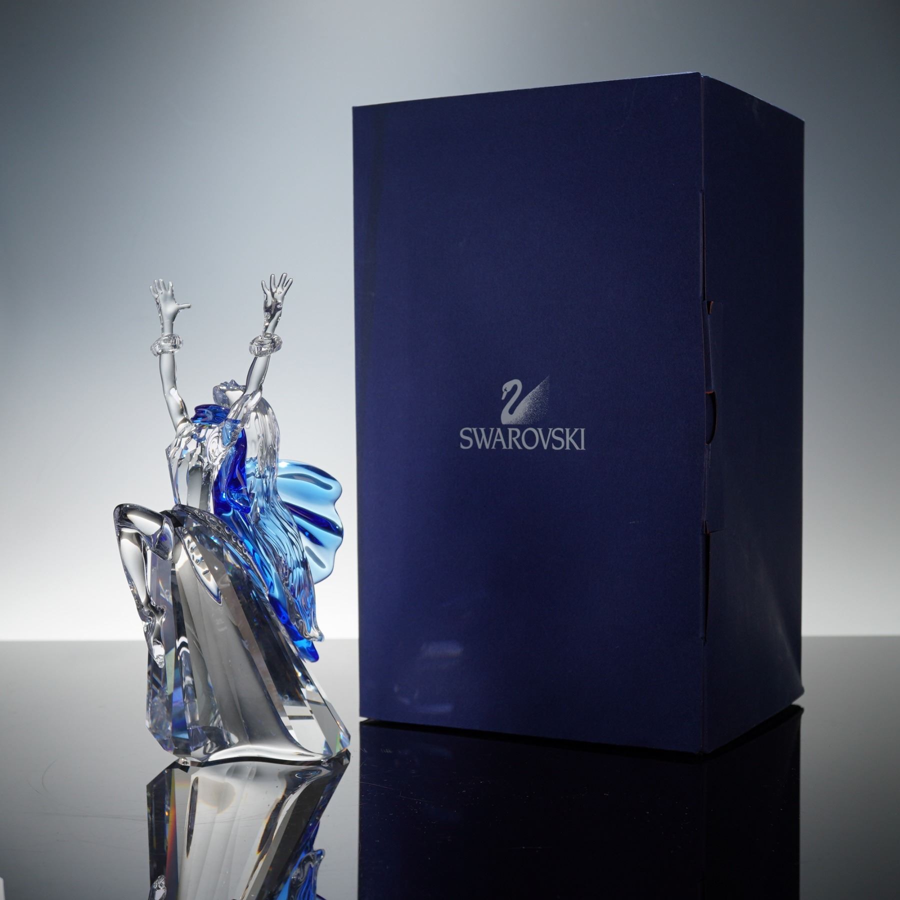Rendered in clear and deep blue crystal with intricate detailing that conveys elegance and movement. The figure is posed dramatically with arms raised, flowing hair, and a billowing cape of translucent blue, mounted on a faceted crystal base that enhances light reflection and depth. Includes original Swarovski packaging and bears the etched Swan logo and markings on the base. Model No. 279648.