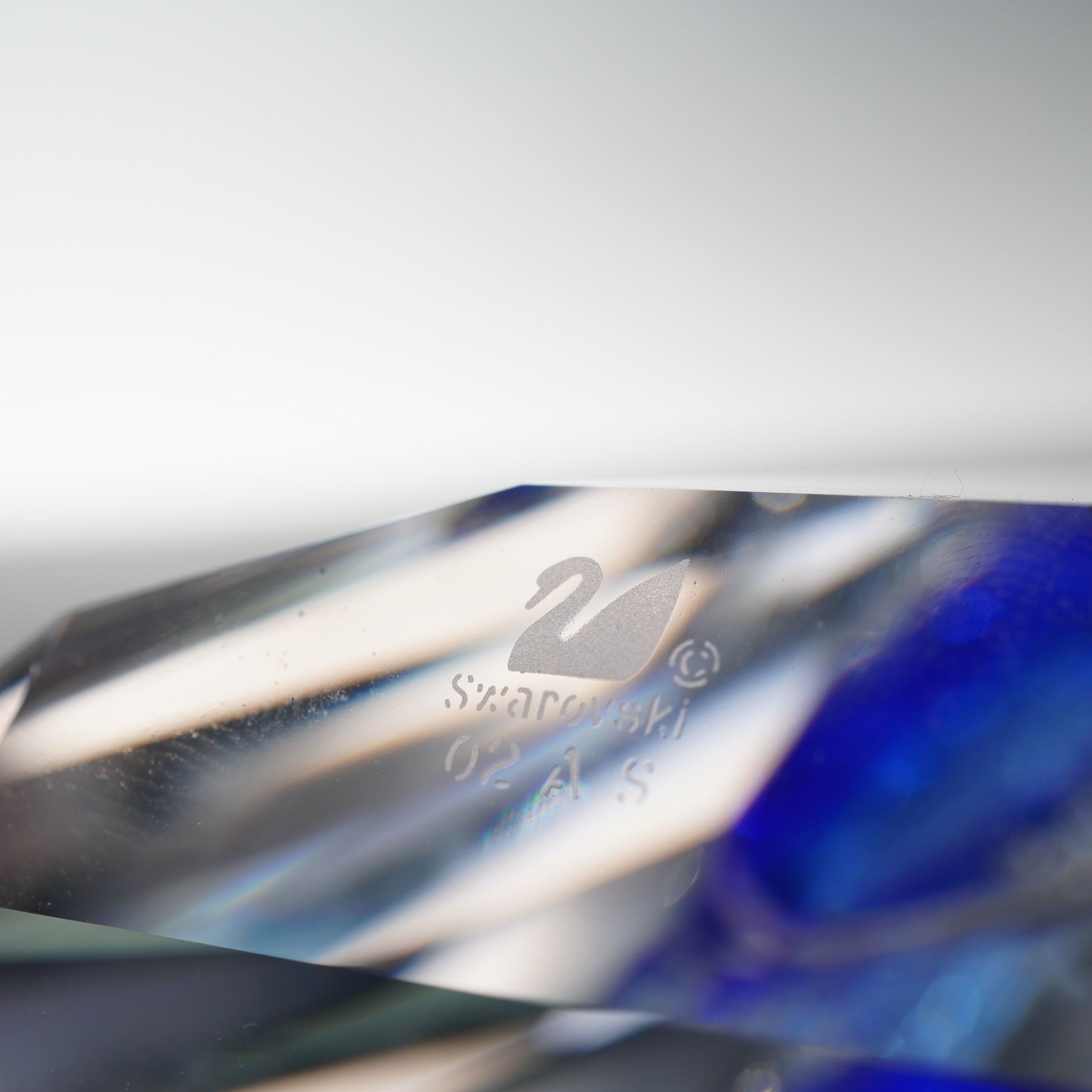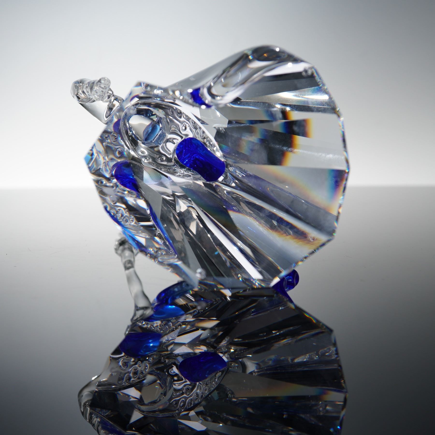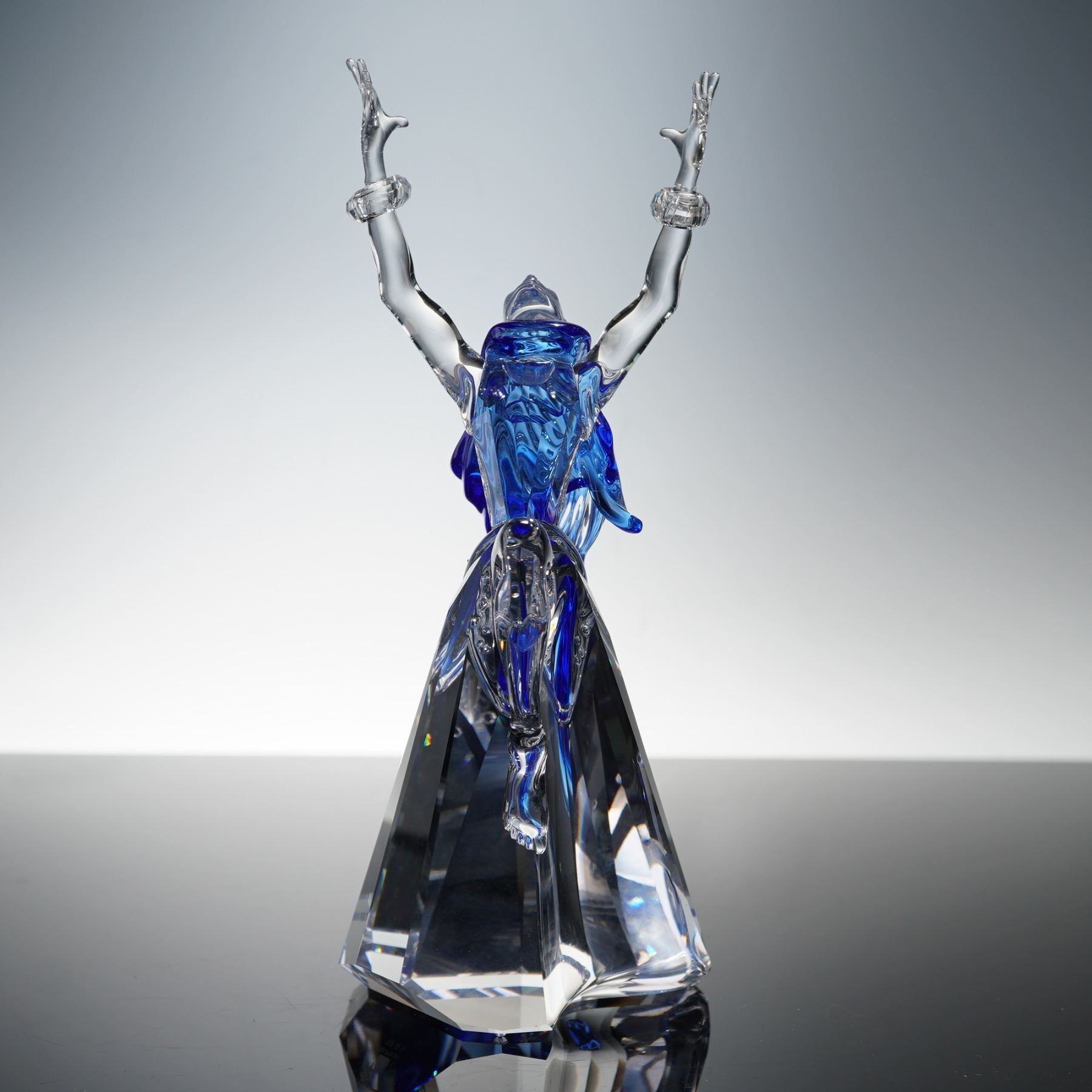Rendered in clear and deep blue crystal with intricate detailing that conveys elegance and movement. The figure is posed dramatically with arms raised, flowing hair, and a billowing cape of translucent blue, mounted on a faceted crystal base that enhances light reflection and depth. Includes original Swarovski packaging and bears the etched Swan logo and markings on the base. Model No. 279648.