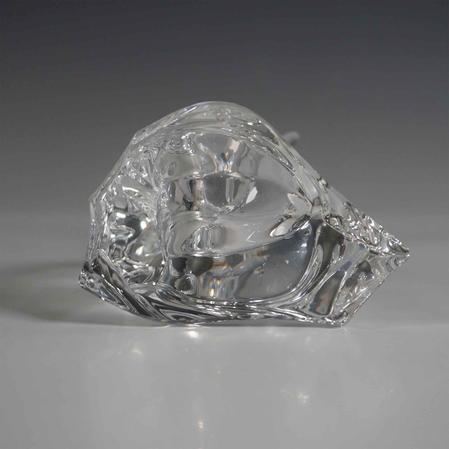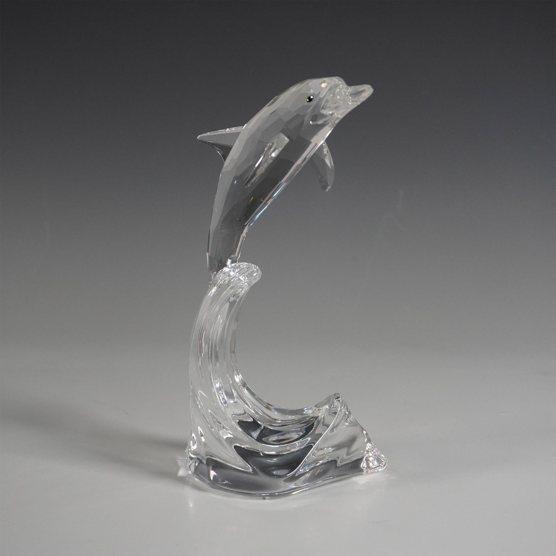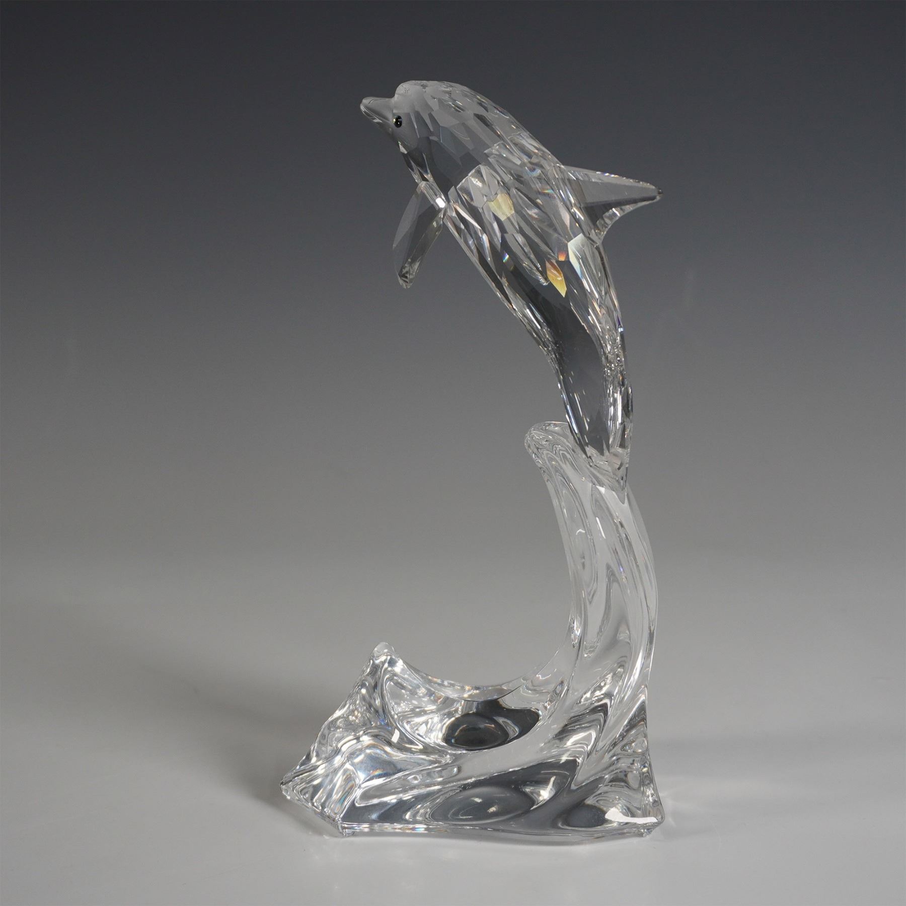A stunning Swarovski Maxi Dolphin on Wave Base crystal figurine, expertly crafted in precision-cut clear crystal. This dynamic sculpture captures the elegance and grace of a leaping dolphin, with a faceted body that reflects light beautifully. The dolphin is poised above a smooth, clear crystal wave base, adding a sense of movement and fluidity. A highly collectible piece, showcasing Swarovski’s renowned artistry and craftsmanship. 221628.