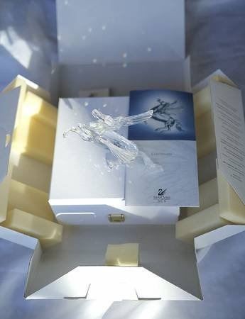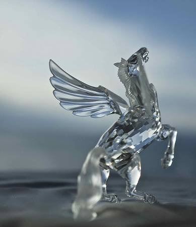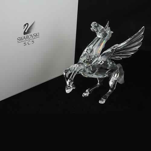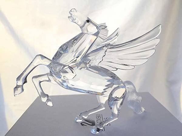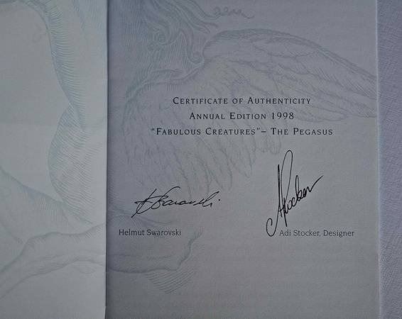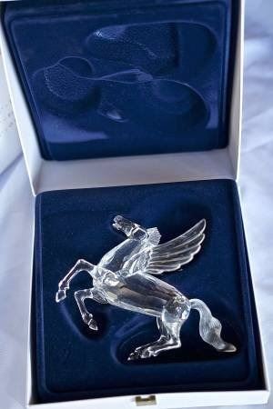 Swarovski Pegasus, the final piece from the "Fabulous Creatures" trilogy for the members of the Swarovski Crystal Society (SCS) Members in 1998. Pegasus Latin: Pegasus, Pegasos) is one of the best-known creatures in Greek mythology. He is a winged divine stallion crafted by the genius talent of Adi Stocker, Swarovski's epic designer. He has perfectly captured the Pegasus symbolism in the finest crystal. The powerful stance is stunning with the precision of detail in the clear crystal, a matted tail, and a mane. The addition of Tabac's eyes creates a lifelike and mesmerizing figure. Without a doubt, I believe, this is one of the most superb pieces from the Swarovski collection. "Pegasus" was also commemorated amongst the stars as the constellation of the same name. I bring you an undiscovered fortune as this Swarovski Pegasus is signed by the designer, making it a truly authentic one-of-a-kind treasure. The value is far beyond what a "non-signed" one is worth. If you command the best and want to have a true collectible this piece will surpass your highest expectations.