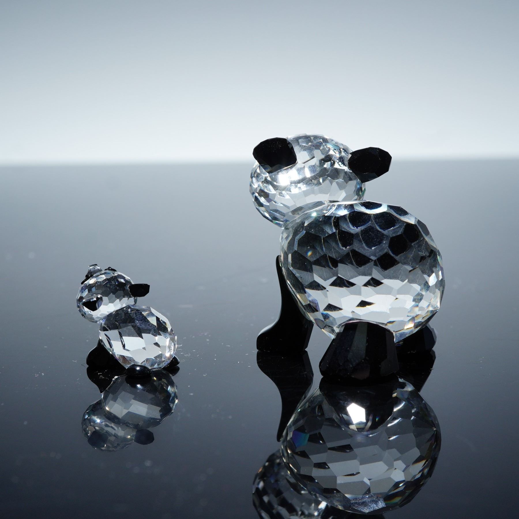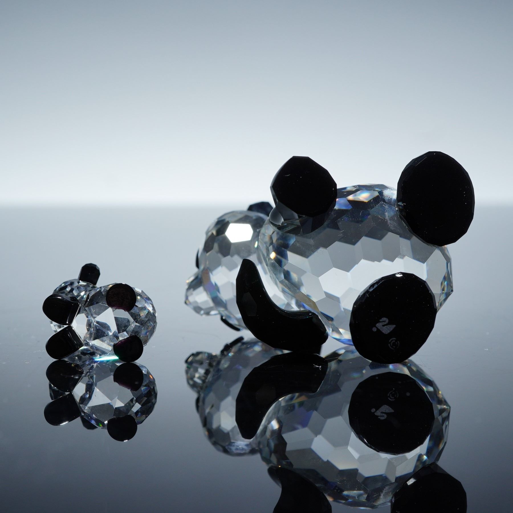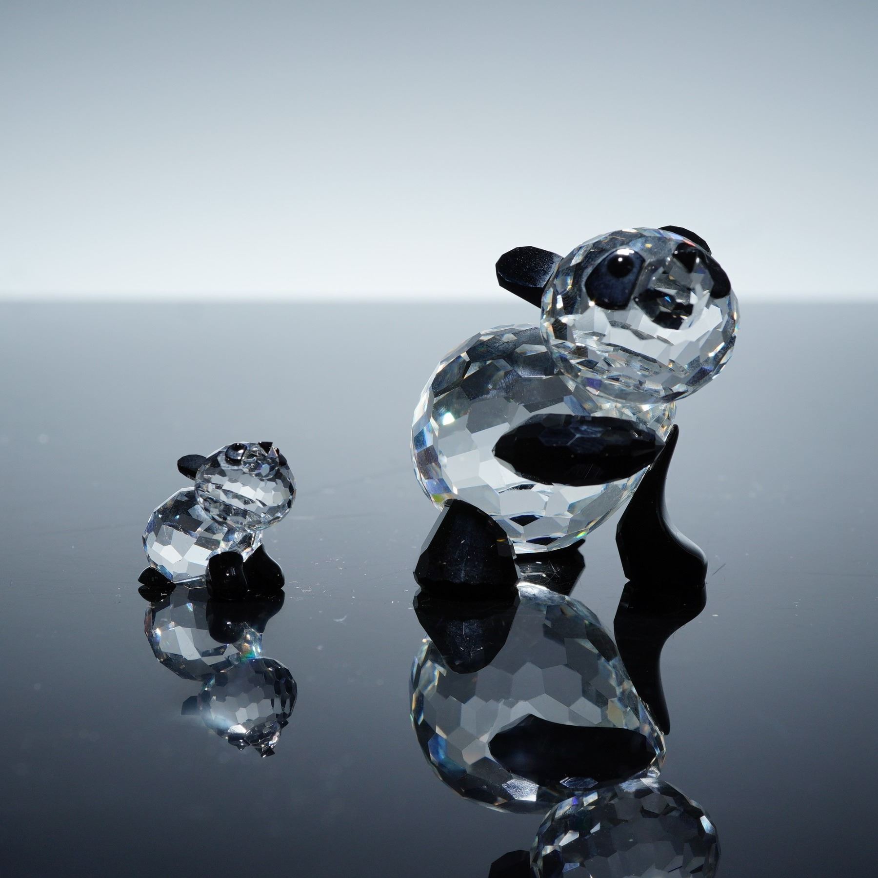 The Mother Panda (181080), is crafted from faceted clear crystal with black crystal accents forming the ears, limbs, and eye patches, giving it a lifelike yet elegant presence. The Baby Panda (181081), is similarly fashioned in faceted clear crystal with black details, complementing the larger figure in a playful and tender pose. Both figurines display the Swarovski back stamp, underscoring their authenticity and collectible value. Together, this pair captures the gentle bond between mother and child in sparkling detail.