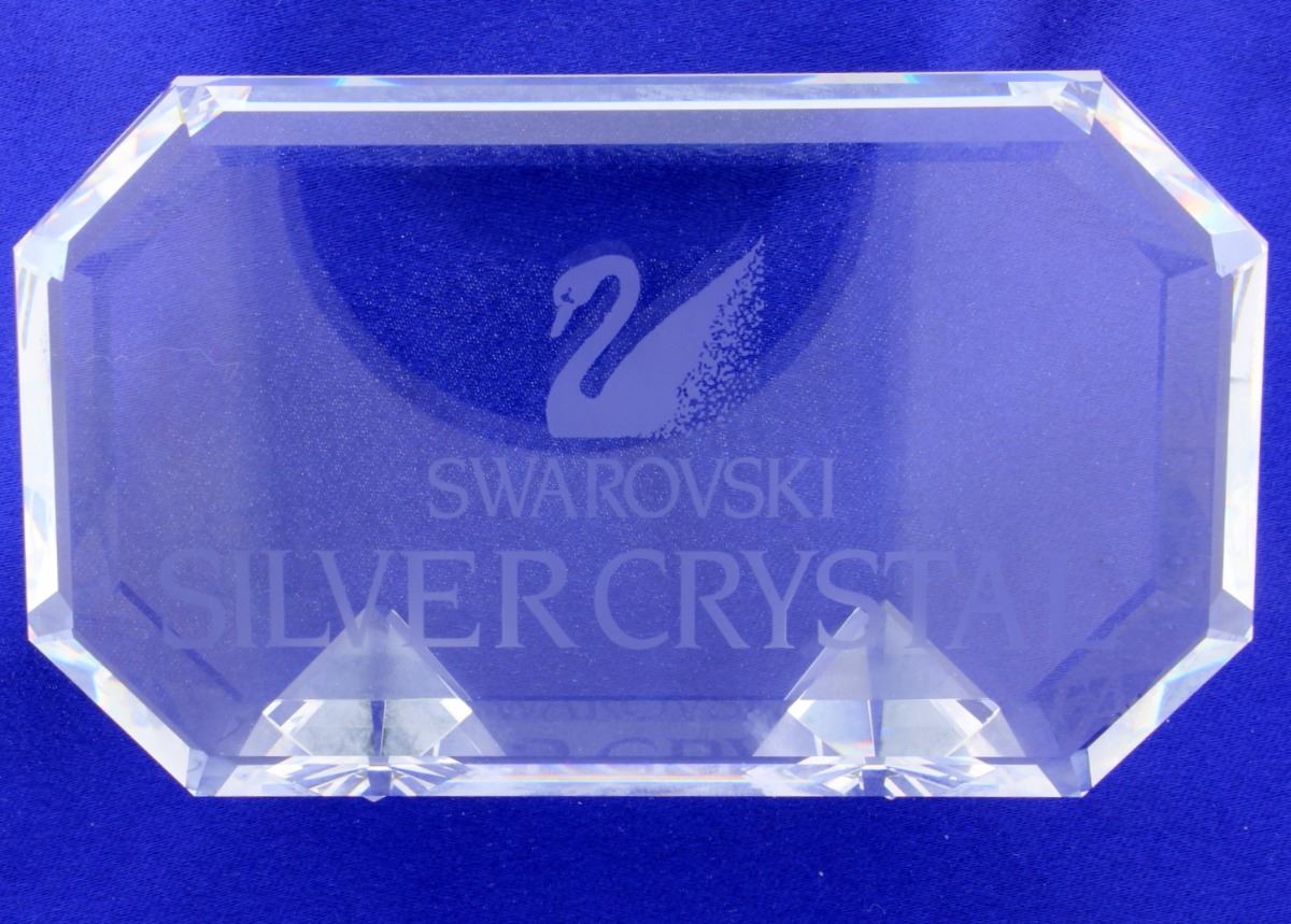 Swarovski Rectangular Crystal Plaque is 4 3/8" long. This plaque was issued with two small triangular feet. Mark etched on the front. This is clear crystal with frosted etching. Introduced in 1993. No box or papers but in excellent condition.