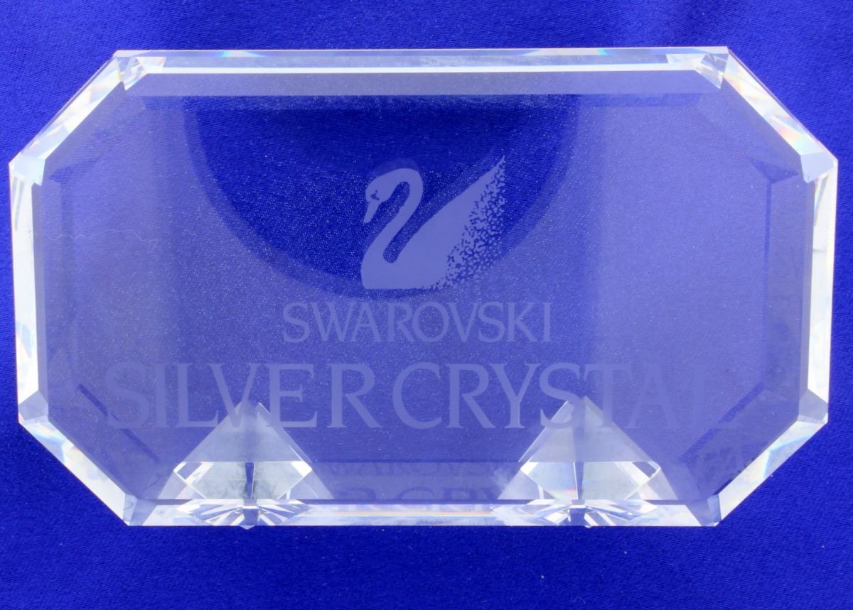 Swarovski Rectangular Crystal Plaque is 4 3/8" long. This plaque was issued with two small triangular feet. Mark etched on the front. This is clear crystal with frosted etching. Introduced in 1993. No box or papers but in excellent condition.