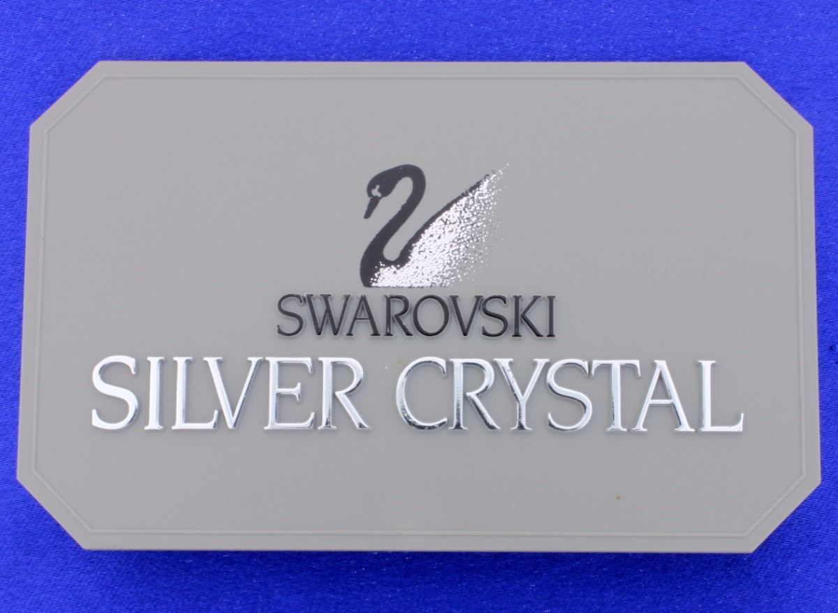 Swarovski Rectangular Plastic Dealer Display Plaque is 4 1/8" long. This is a plastic dealer display plaque. The colors used are gray, silver, and black. Introduced in 1988. No box or papers but in excellent condition.