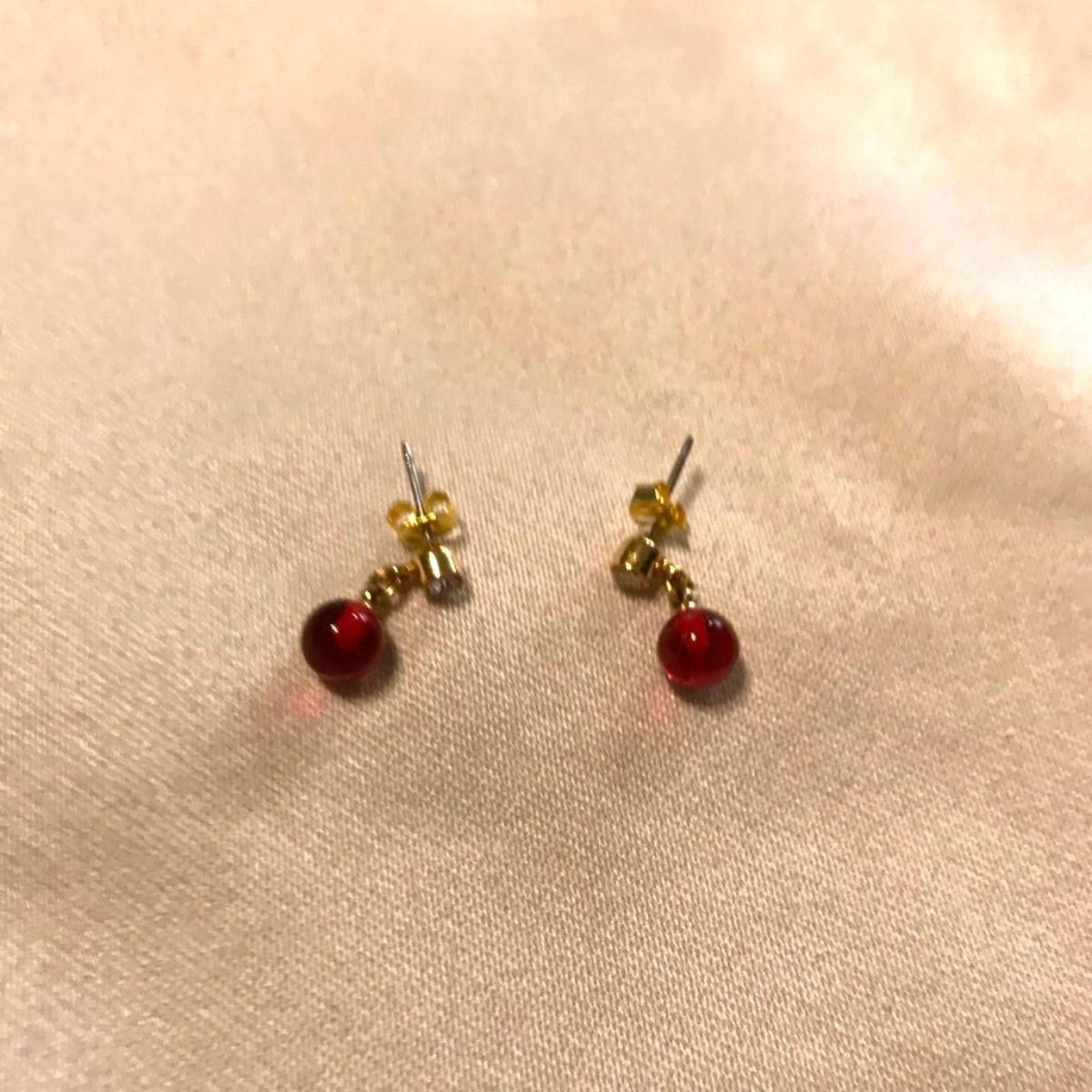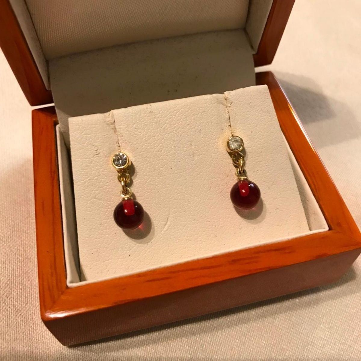 Swarovski red berry 5mm round crystals dangle from clear Swarovski crystals inset into gold plated post earrings. 5/8" L.