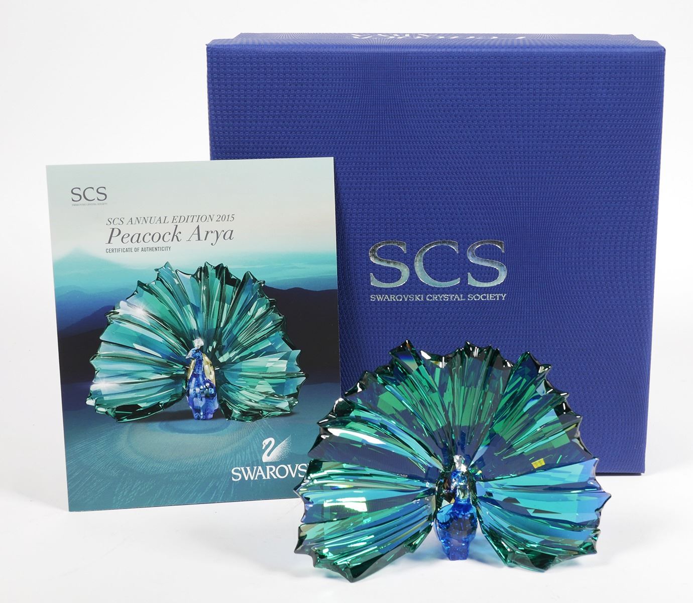 Retired Swarovski Crystal Society Annual Edition 2015 Peacock Arya figurine 5063694. Only available in 2015 and exclusively to SCS members, limited to one piece per member. Mint in box. See photos for more details on condition. Please see our other lots from a huge estate collection of rare and hard to find large Swarovski SCS and small Swarovski Silver figurines.