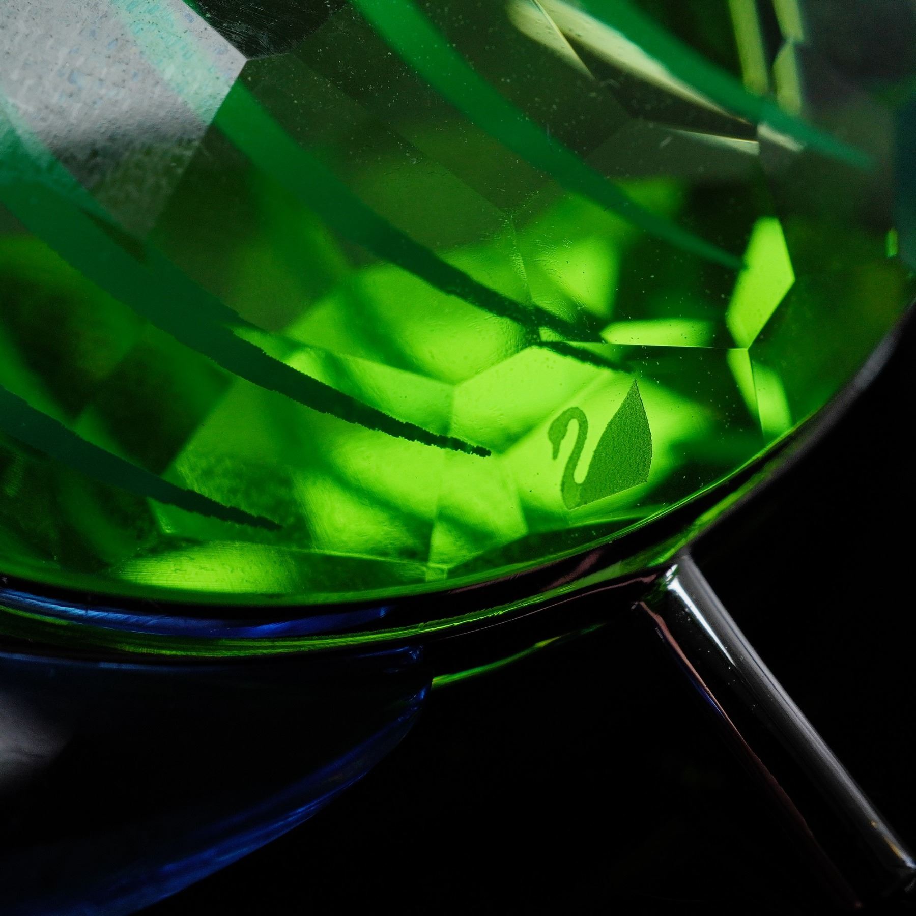 This piece is crafted from clear faceted crystal with light blue accents on the body and dorsal fin, complemented by a pale yellow crystal tail. The figurine features black crystal eyes for added detail and rests on a frosted crystal base with a small bubble element to suggest an aquatic environment. Comes with the original Swarovski box.
