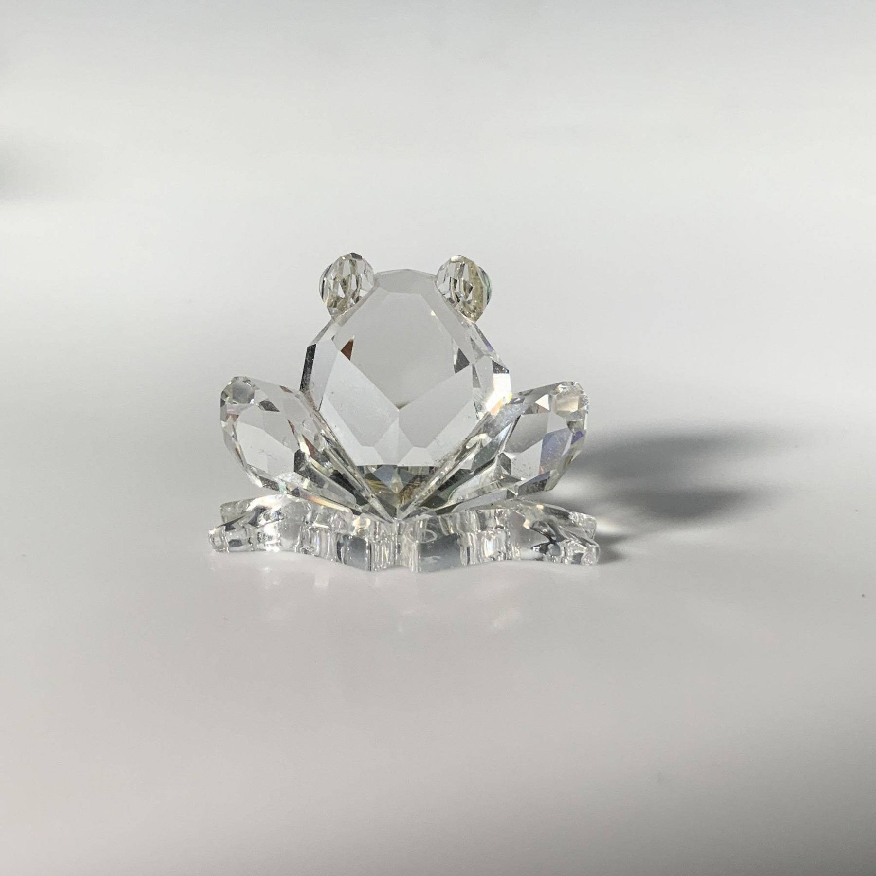A delightful clear faceted figure of a frog with iridescent and black eyes. Part of the In The Secret Garden series. Swarovski marking. This item has its original box: 3.25"W x 2.5"H. Artist: Gabriele Stamey