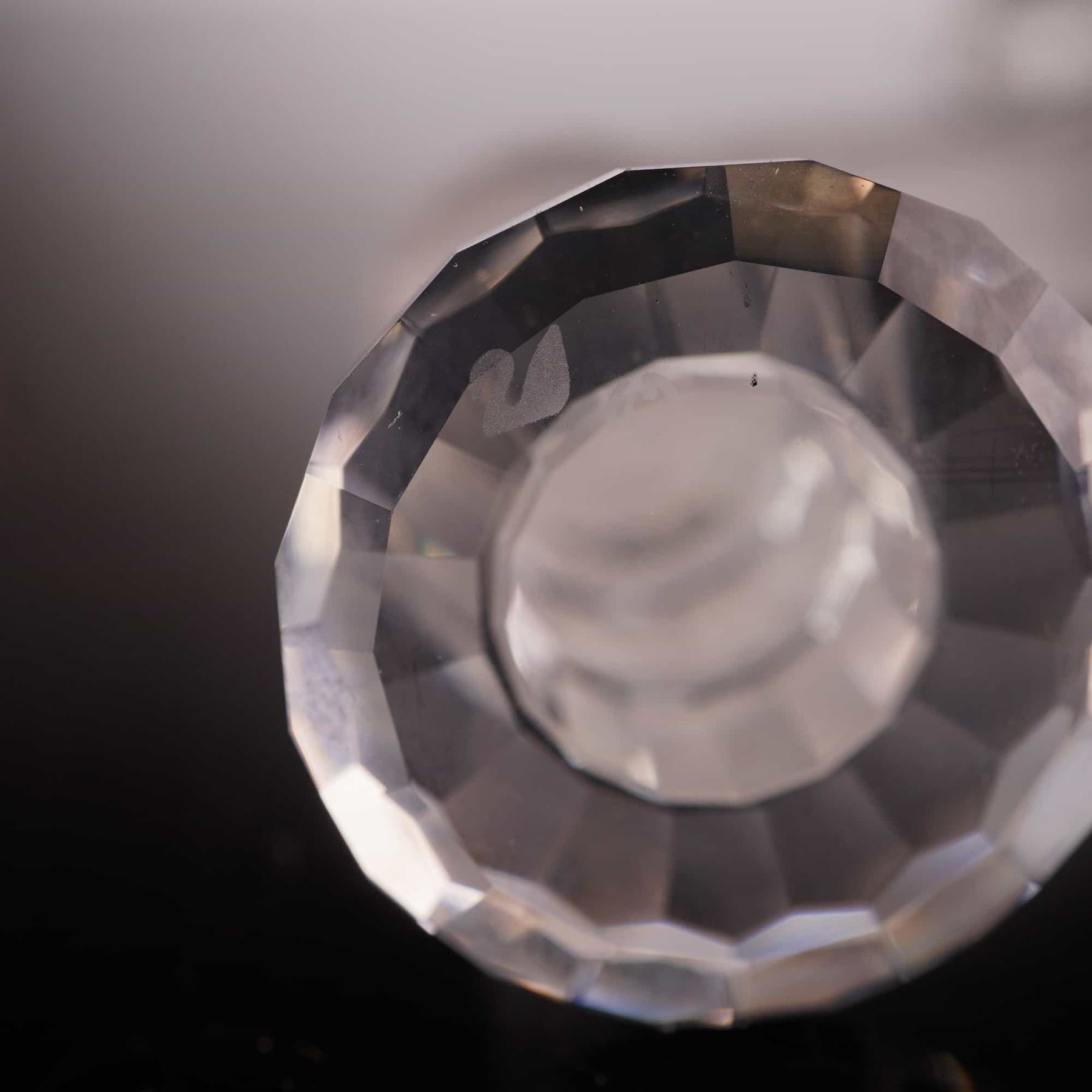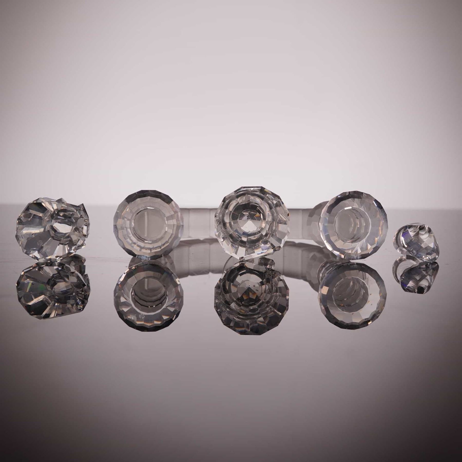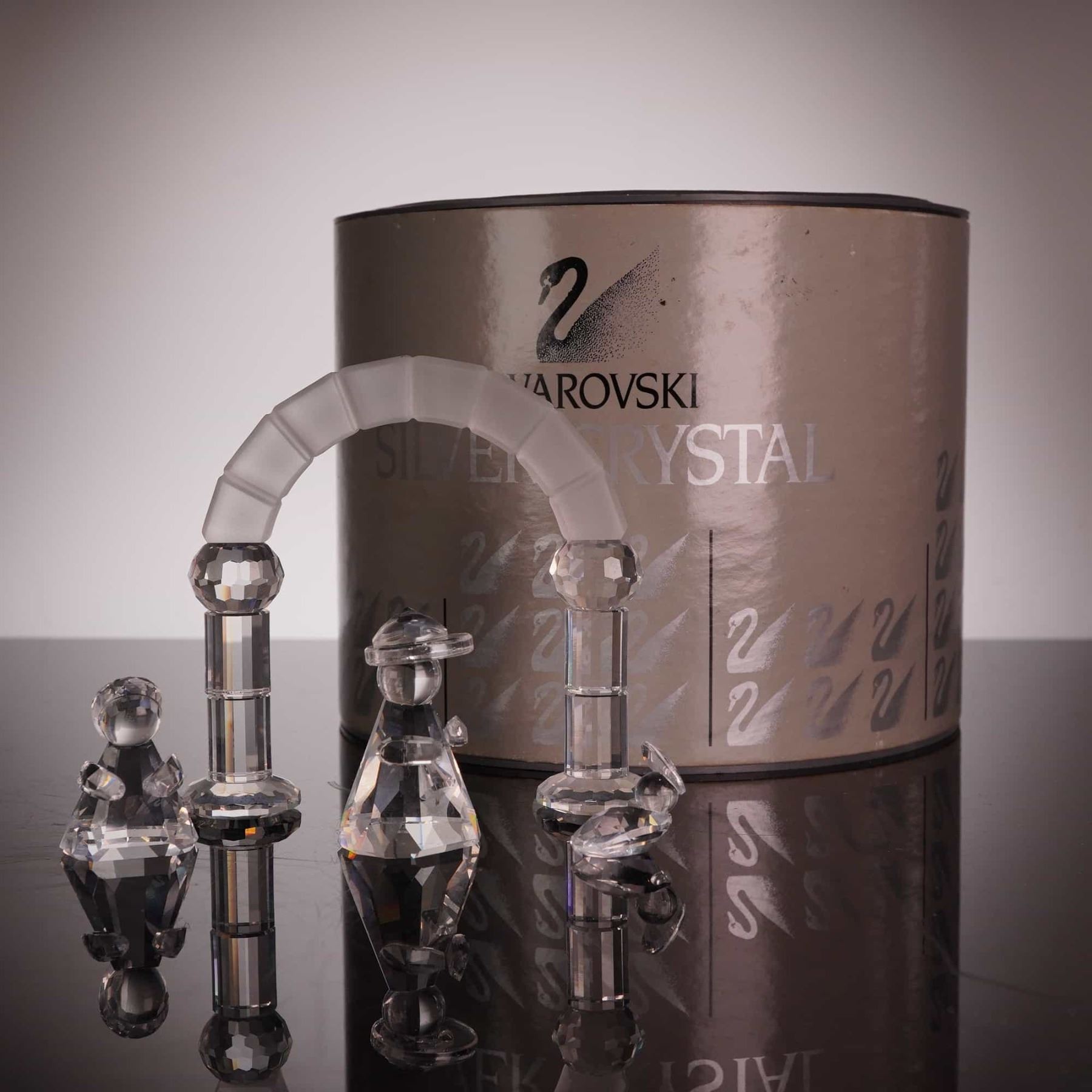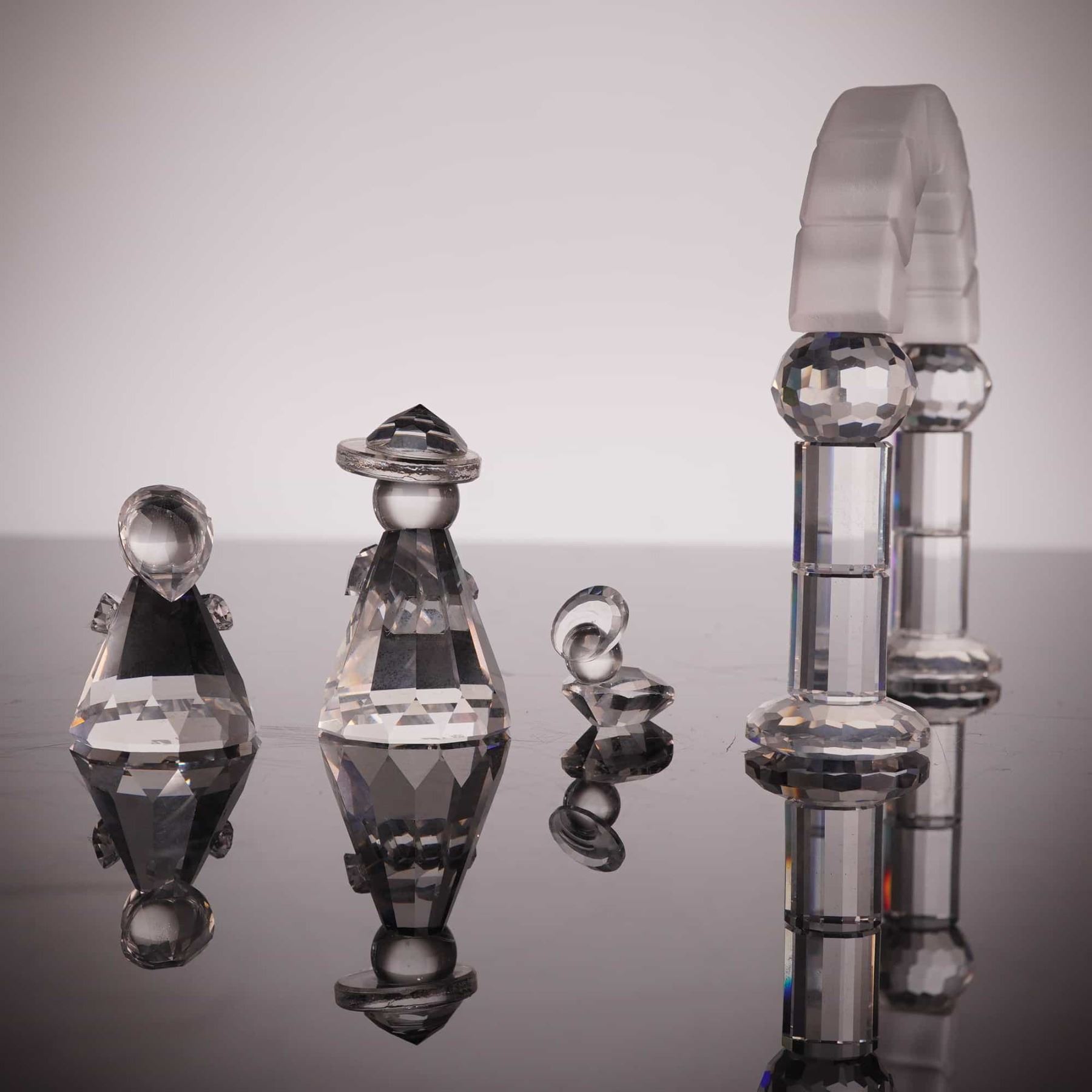 A four-piece Swarovski Silver Crystal Mini Nativity set comprising Mary, Joseph, and the infant Jesus in a manger, together with a frosted crystal arch. The figurines are crafted from precision-cut faceted clear lead crystal, while the arch features a frosted finish resting upon two faceted pillars. Each piece is marked with the acid-etched Swarovski swan logo to the underside. This set, model number 200132 or 153974, is part of the Silver Crystal collection and includes the original cylindrical manufacturer's packaging. Height of arch: 3.75 inches.