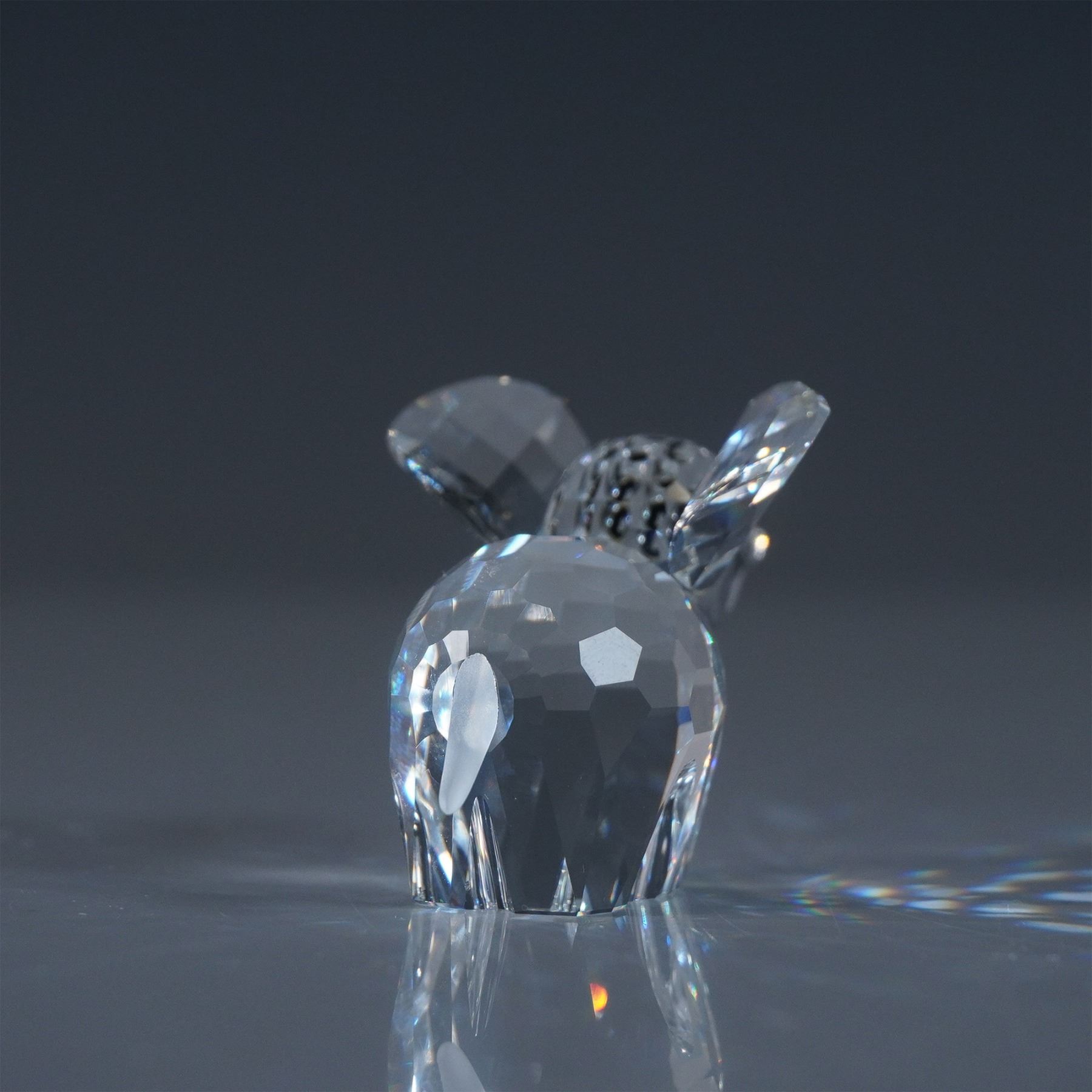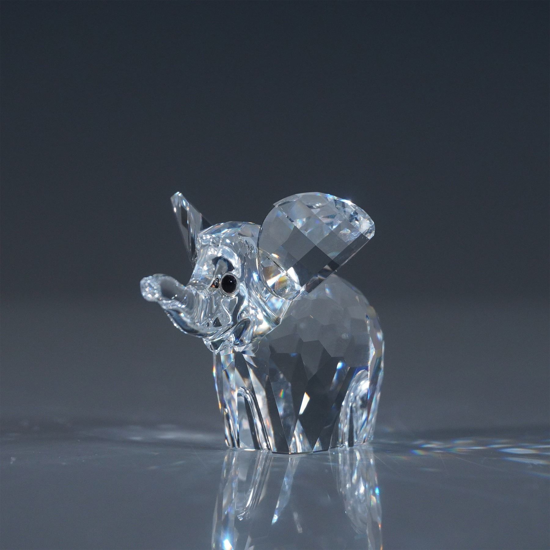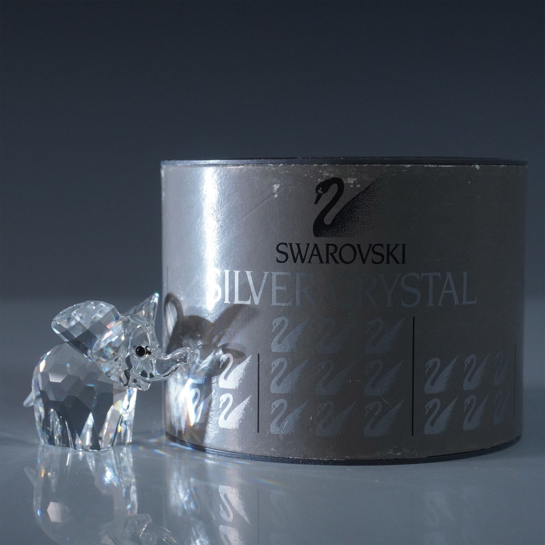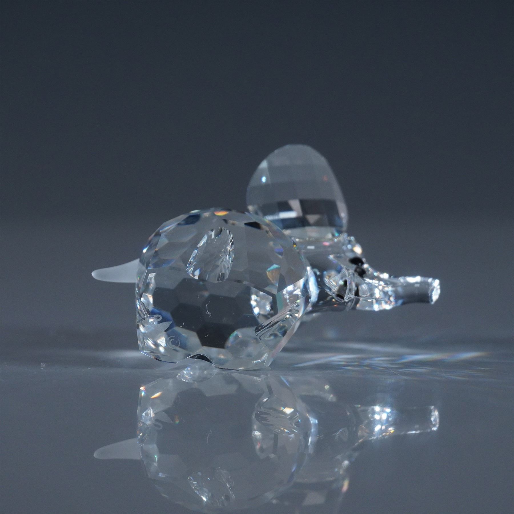 This charming Swarovski Crystal Small Elephant figurine is a beautifully crafted piece showcasing the playful and gentle nature of this majestic animal. Measuring 1.25"H, the figurine features a faceted crystal body, large expressive ears, and a raised trunk symbolizing good luck. The black crystal eyes add character and depth to the design, while the frosted crystal tail enhances its lifelike appeal. This collectible comes with its original box, measuring 2.5"H x 3.25" in diameter. A delightful addition for any Swarovski collection, this figurine bears the Swarovski acid-etched logo, ensuring authenticity and expert craftsmanship.