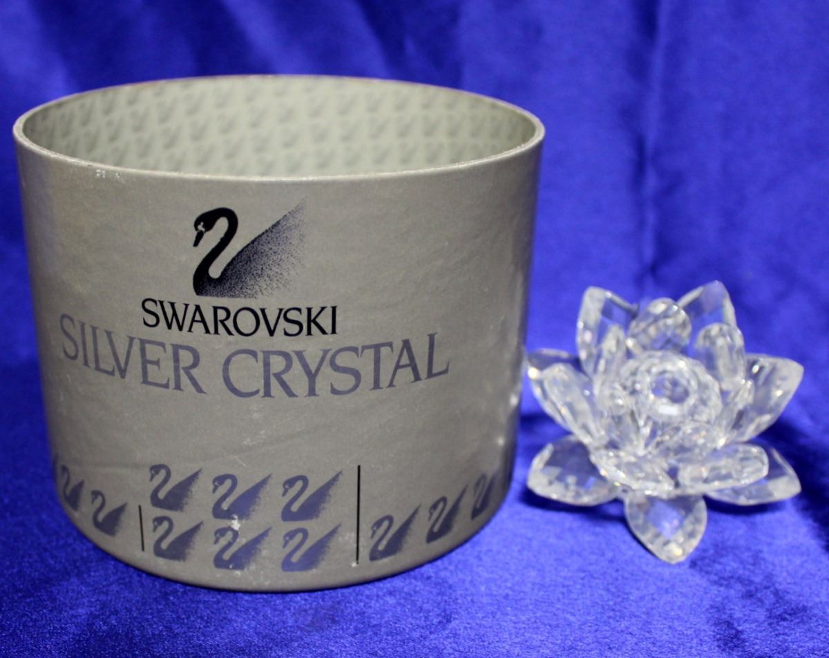 Swarovski Small Water Lily Candleholder measures 3" in diameter. This is part of "Our Candleholders" theme group. Made for 1 candle, hole only. There is a small round disk floweret, crystal in the bottom an the feet are faceted. The round disk floweret in the bottom is discontinued. Introduced in 1985. In original box and in excellent condition.