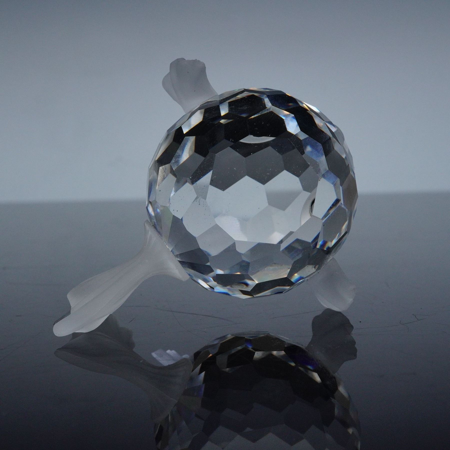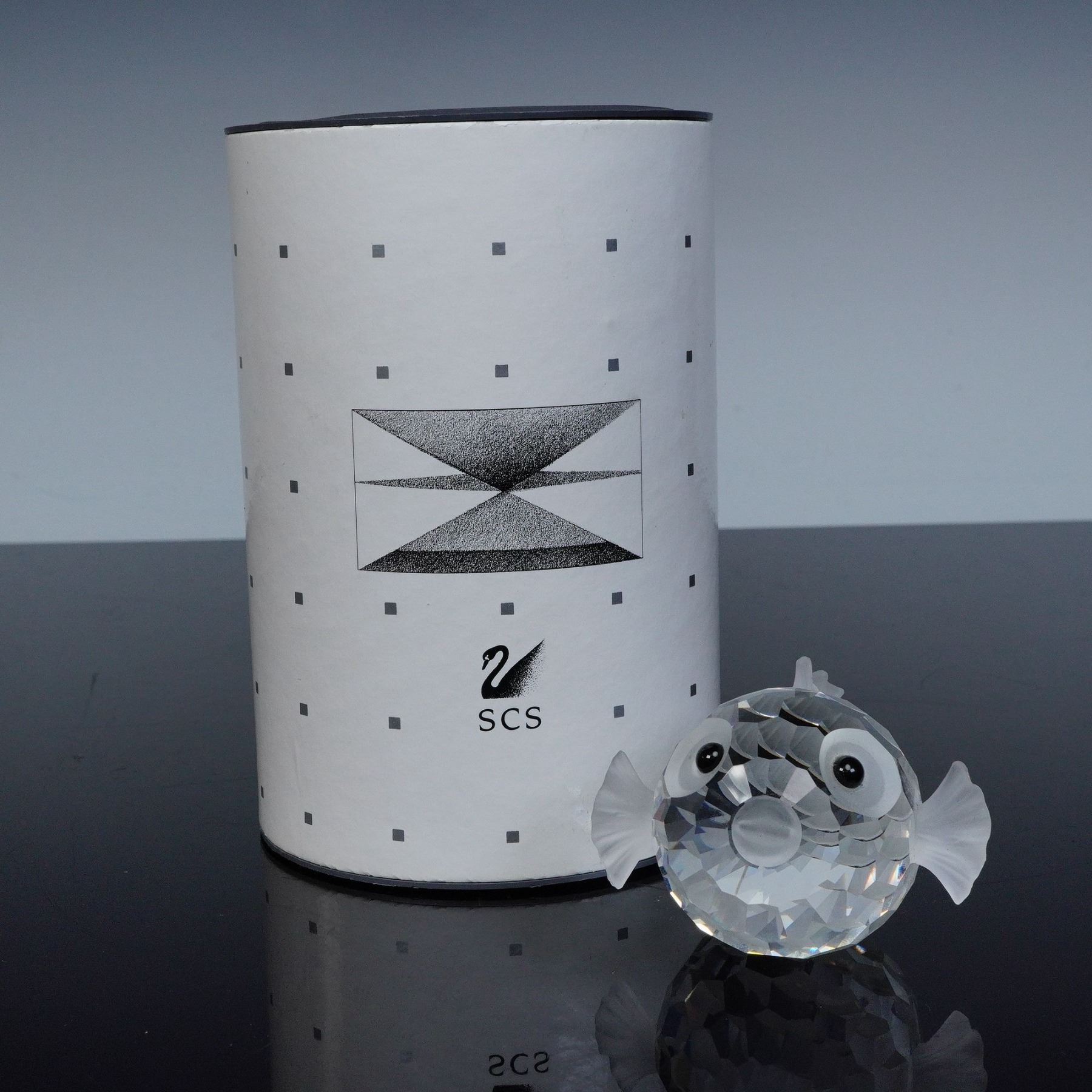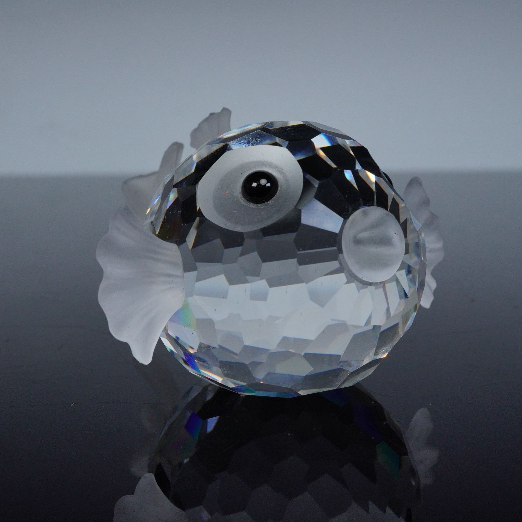 This charming crystal sculpture captures a whimsical blowfish with a round, faceted clear crystal body that reflects light brilliantly from every angle. Frosted crystal accents form its fins, tail, and puckered mouth, while large expressive eyes lend a delightful character to the piece. The figurine bears the etched Swarovski swan logo on the underside, denoting authenticity. Includes its original SCS cylindrical box packaging. Model number 010013.