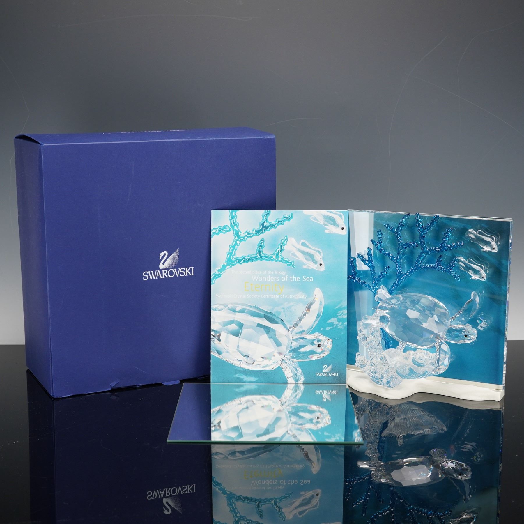 A striking crystal composition depicting a graceful sea turtle gliding through an underwater world of coral and fish. This masterfully crafted glass sculpture features a faceted turtle rendered in clear crystal, complemented by textured coral elements in shades of blue and transparent glass. The piece stands before a vivid oceanic backdrop, evoking the serenity and majesty of marine life. Presented with its original packaging and certificate of authenticity, the creation bears the iconic Swarovski swan logo and exemplifies the brand's dedication to artistry and precision. Model No. 684266.
