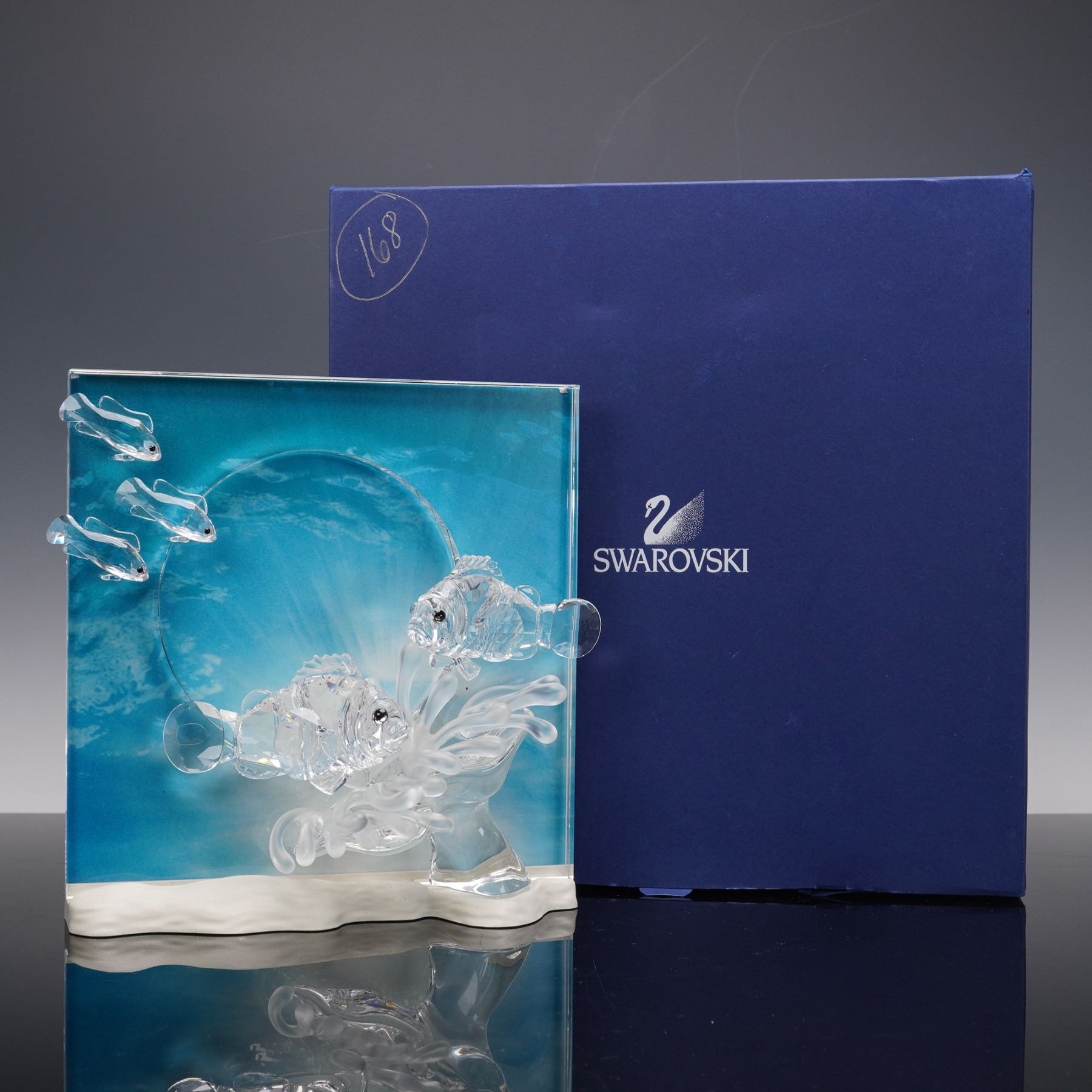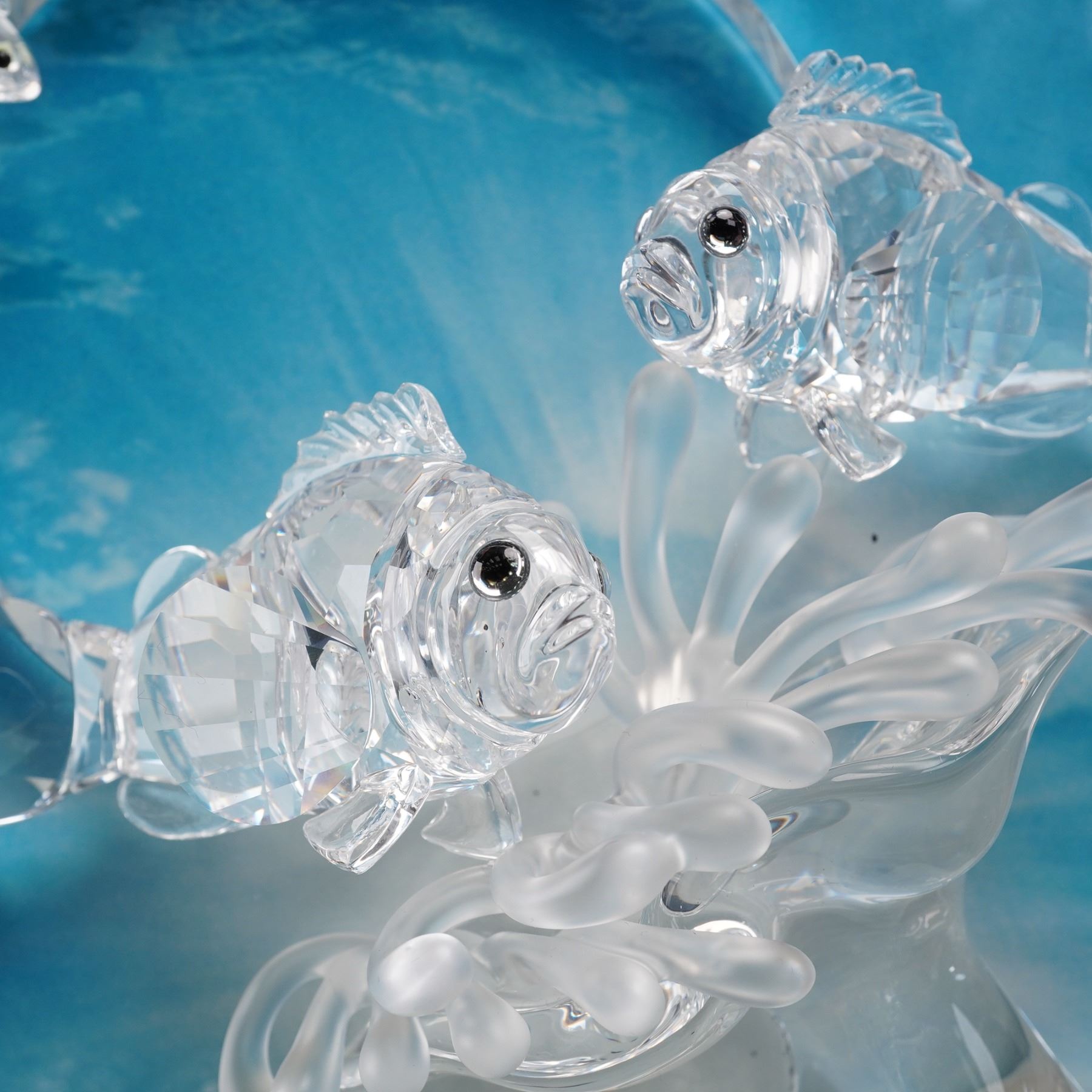 This crystal composition depicts a vivid underwater scene with two large fish swimming among frosted crystal coral and three smaller fish attached to a clear background panel. The display is complemented by a circular clear crystal backdrop evoking the ocean's depth. Included are loose clear and aqua crystal accents shaped as stylized shells or sea elements, adding further sparkle and dimensionality to the tableau. The base is designed to resemble sand, grounding the aquatic theme. This item has its original box.