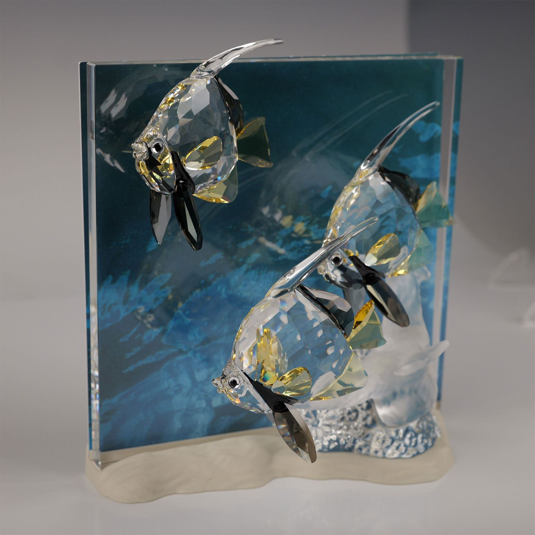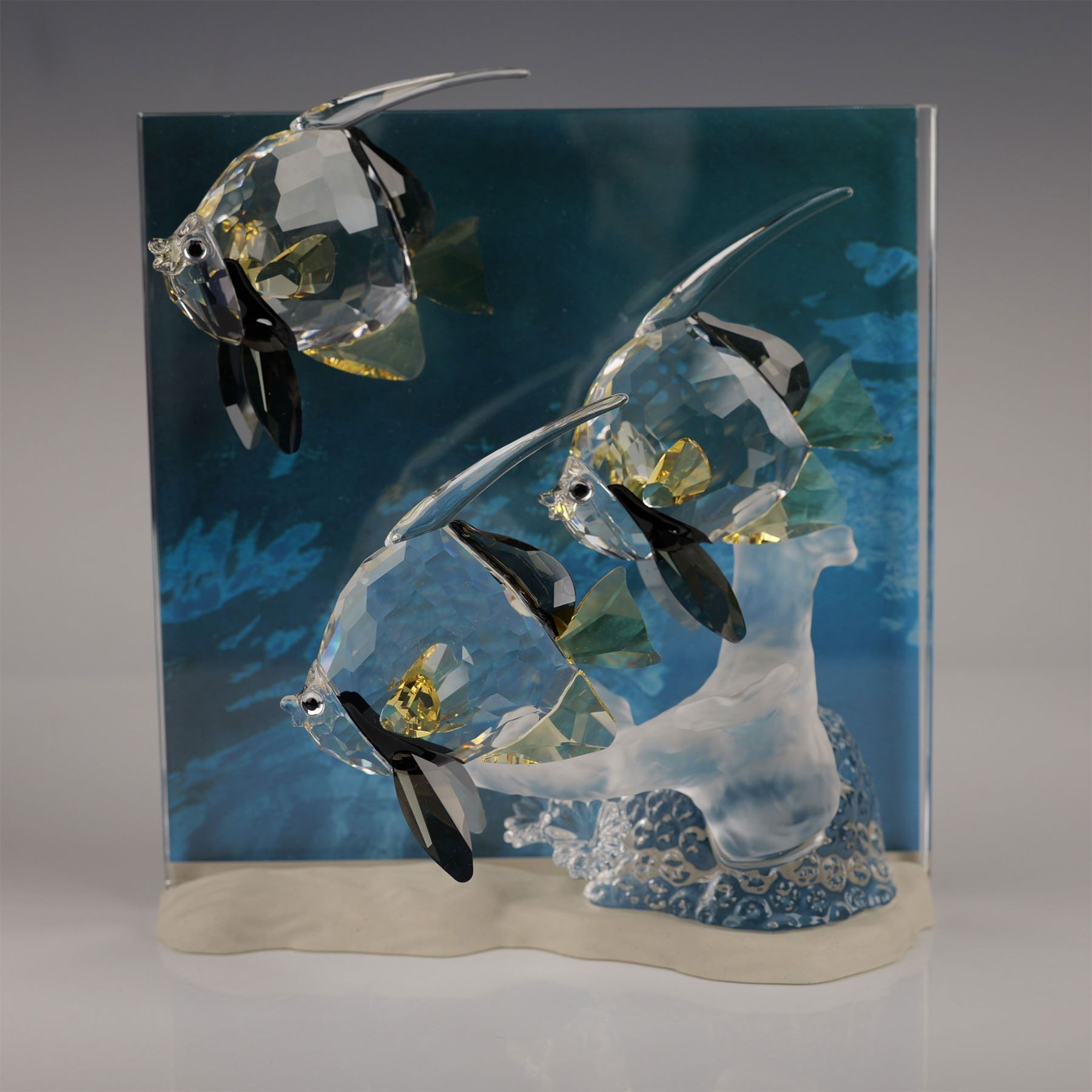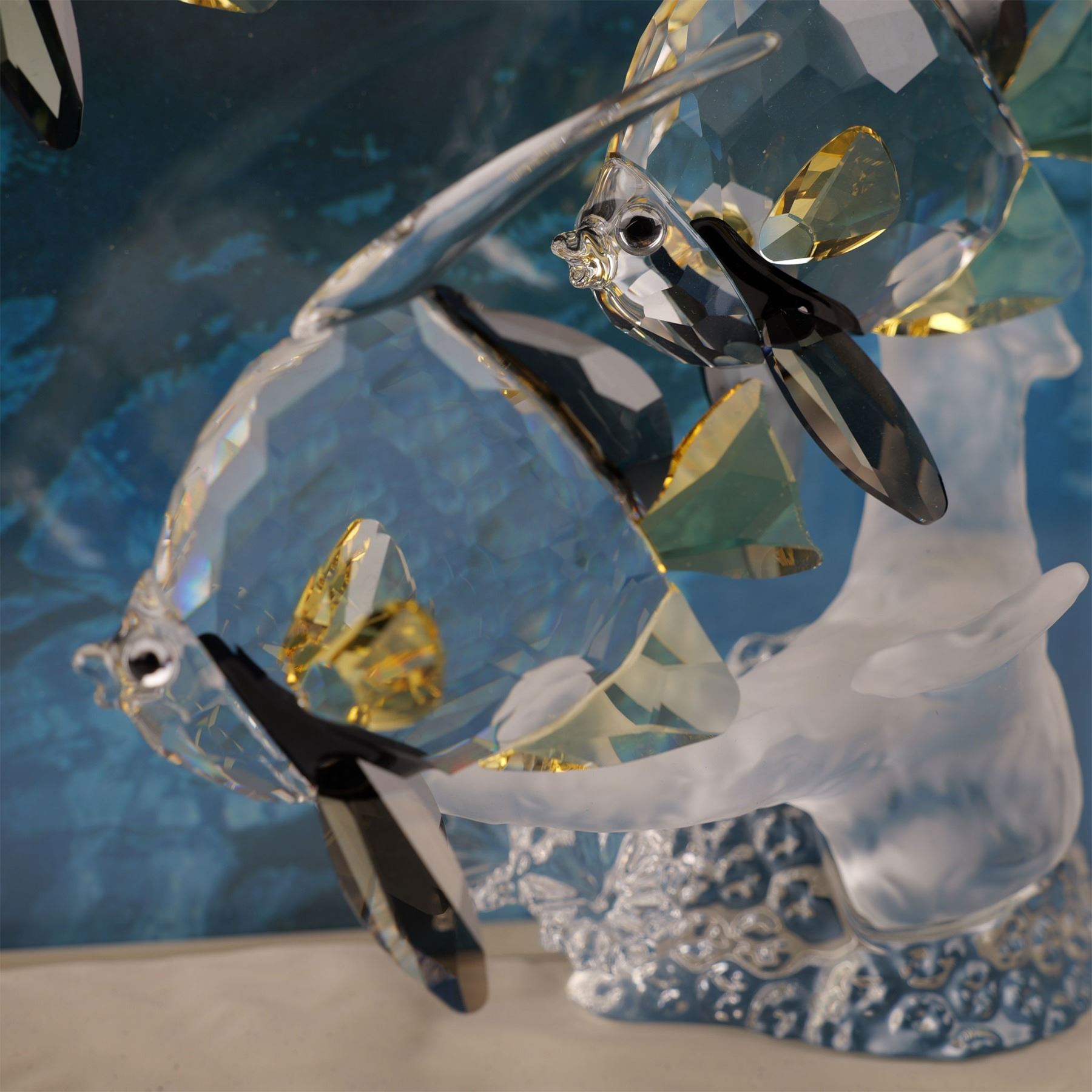 This exquisite Swarovski crystal sculpture, titled Wonders of the Sea: Community, was designed by the renowned artist Heinz Tabertshofer. Released as part of the Swarovski Wonders of the Sea trilogy collection, this masterpiece captures the intricate beauty of the marine world. The design features intricately faceted crystal fish swimming among waves of frosted and clear crystal coral. This piece is a stunning example of Swarovski's mastery in creating detailed, high-quality crystal art. This item has its original box.