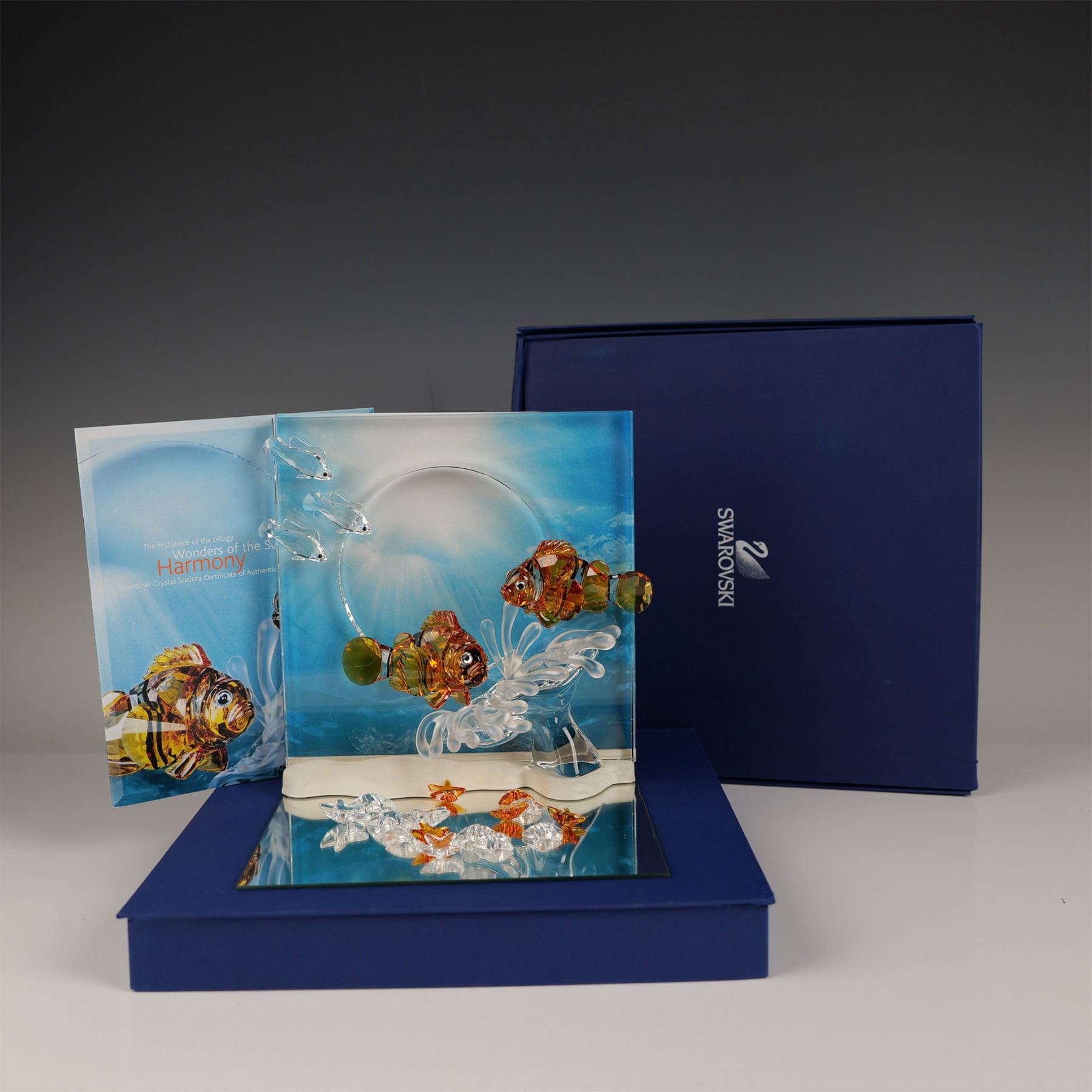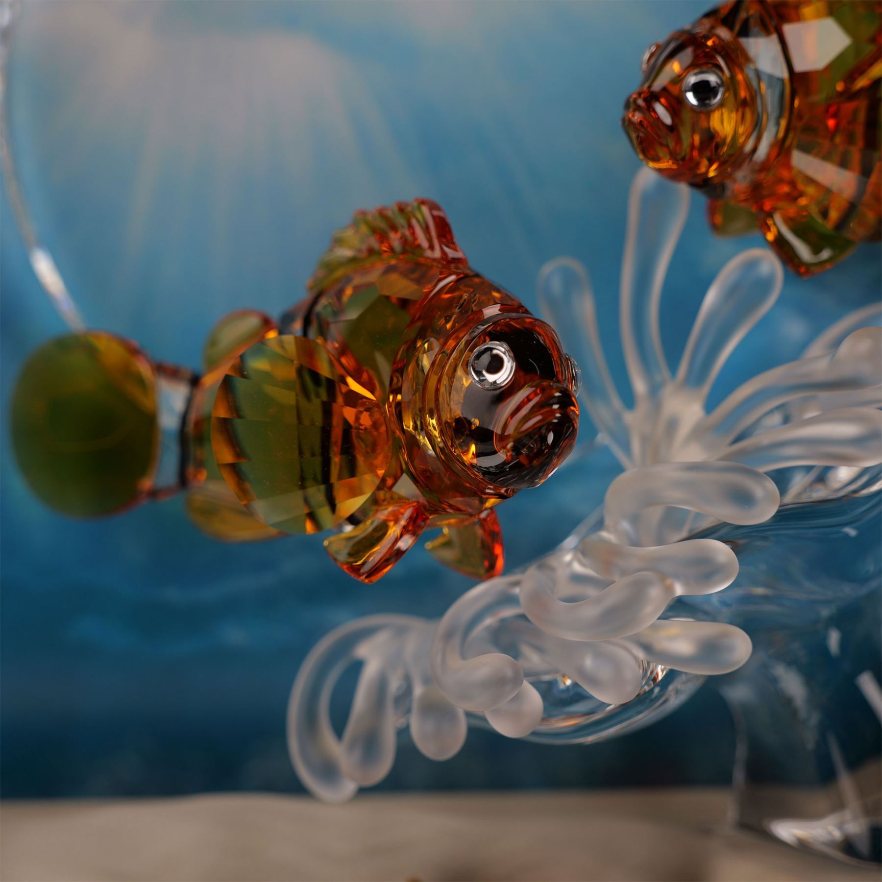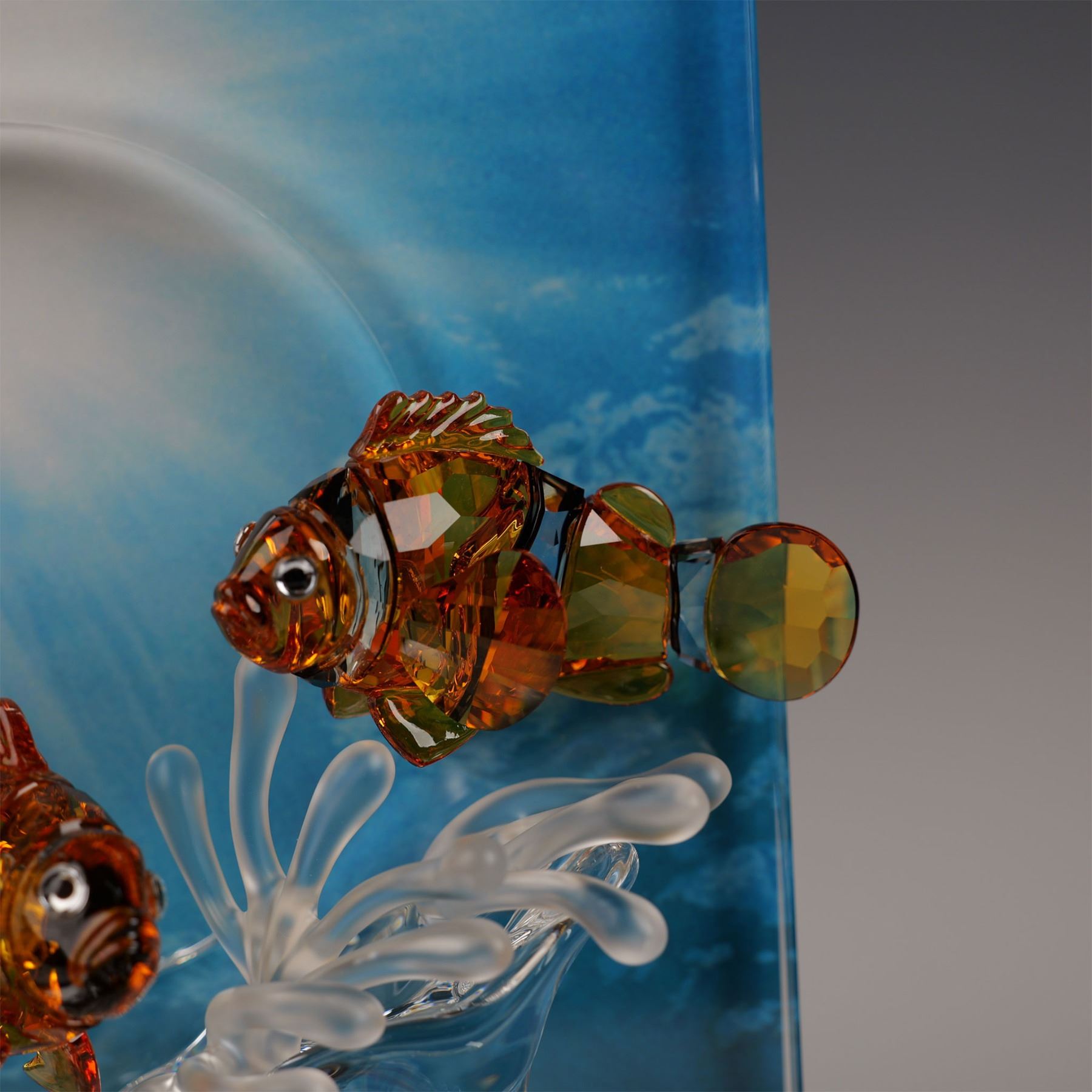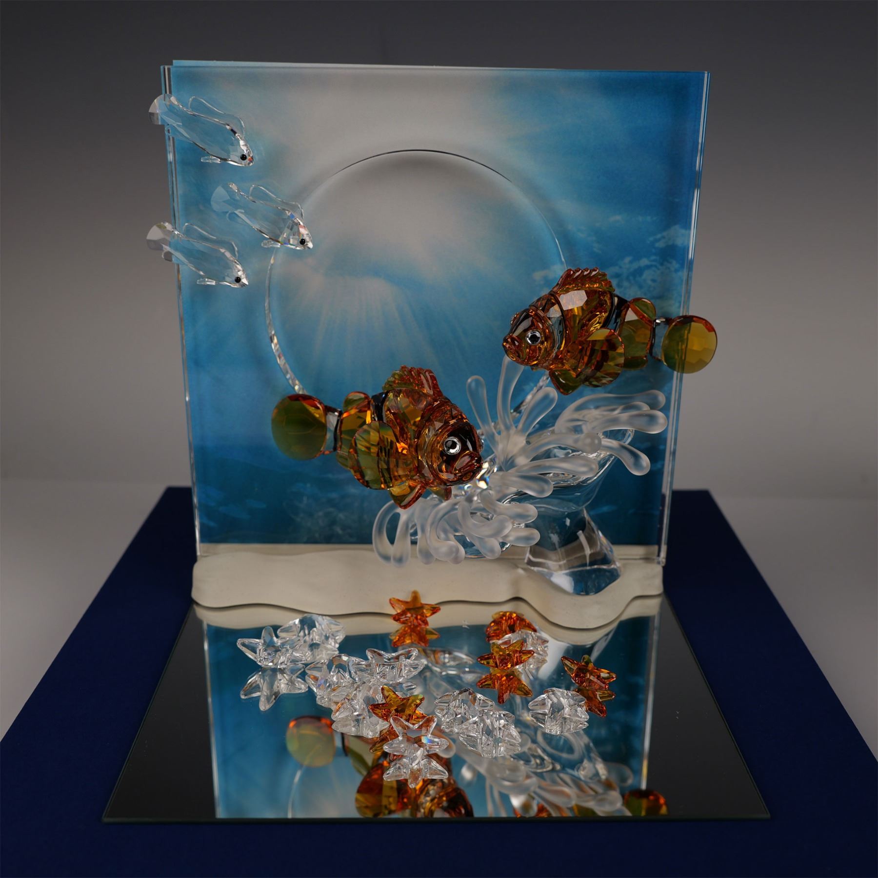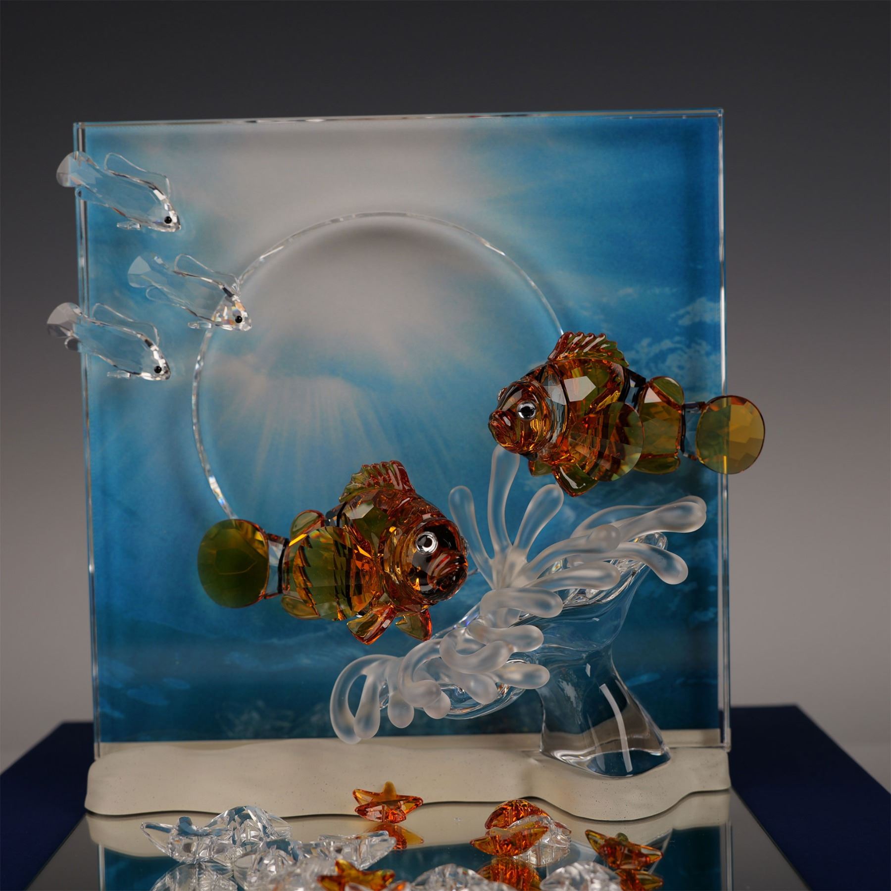 This exquisite Swarovski Crystal piece, is the first piece in the celebrated Wonders of the Sea trilogy. It showcases an intricate underwater scene featuring crystal fish, shimmering in golden hues, surrounded by frosted crystal coral and waves. Designed with meticulous craftsmanship, this piece exemplifies Swarovski's commitment to artistry and elegance. This item has its original box. 657120.