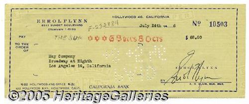 <B>Swashbuckler Actor Errol Flynn Signed 1946 Check</B></I> One of the biggest movie stars of the 1930s and 1940s, Errol Flynn (1909-1959) starred in such films as <I>Captain Blood,</B></I> <I>The Adventures of Robin Hood</B></I> and <I>The Adventures of Don Juan.</B></I> Stories of his exploits as a bad boy, boozer and womanizer filled Hollywood fan magazines of the day. Here is a fine signed item from this screen legend -- a check dated July 24, 1946 signed by Flynn, payable for $68.80 to May Company, drawn on the California Bank, Hollywood-Vine Office. <I>Accompanied by COA from PSA/DNA.</B></I>