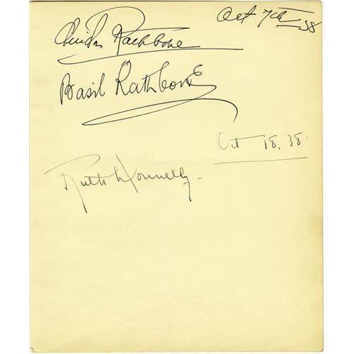 <B>Swashbuckler Basil Rathbone and His Screenwriter Wife.</B></I> Signing Clifton Webb's guest book on October 7, 1938 was English actor Basil Rathbone, just months before his first screen appearance as the legendary Sherlock Holmes. His wife, the former Ouida Bergere, a writer, signed also as "<I>Ouida Rathbone</B></I>." Actress Ruth Donnelly was Mr. Webb's guest a few days later on October 18th, signing on this same sheet. In very good condition with only very mild toning. <I>With COA from PSA/DNA.</B></I>