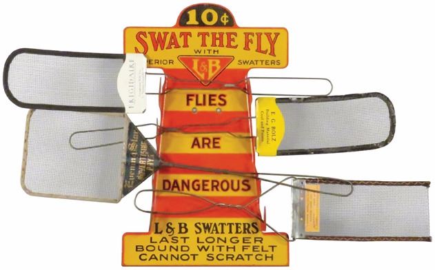 Swat the Fly Tin Litho Store Display. Comes with collection of advertising swatters. Normal crazing otherwise very good overall condition. 8 1/2 X 13 1/2 inches display only.