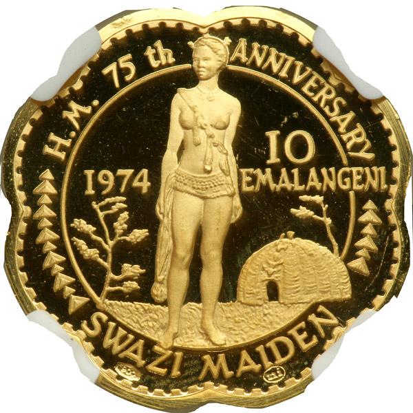 Swaziland. 10 Emalangeni, 1974. Fr-4; KM-17. Weight 0.3218 ounce. For the 75th Anniversary - Birth of King Sobhuza II. Reverse: Swazi Girl. NGC graded Proof 66 Ultra Cameo.