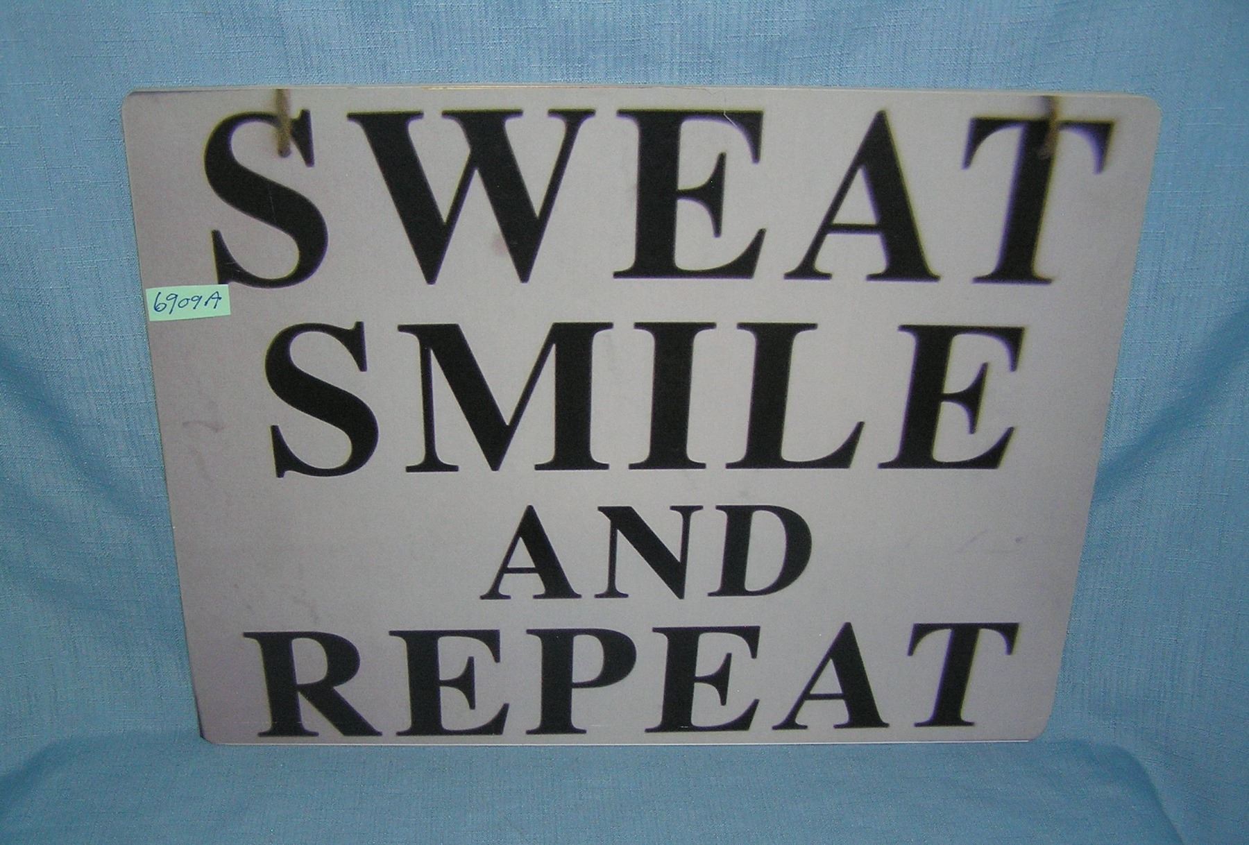 Sweat smile and repeat retro style advertising sign printed on PVC hardboard these signs are auctioned for their decorative and display purposes 12 inches by 16 inches est. value $40.00-$50.00
