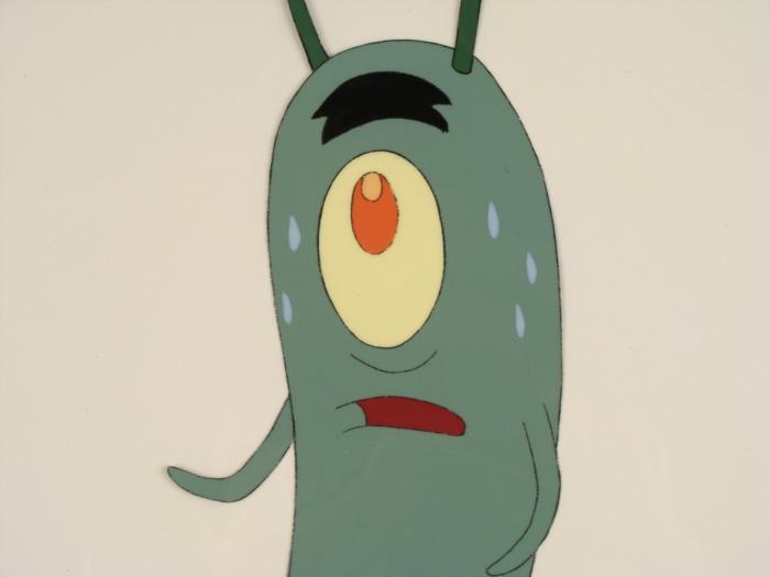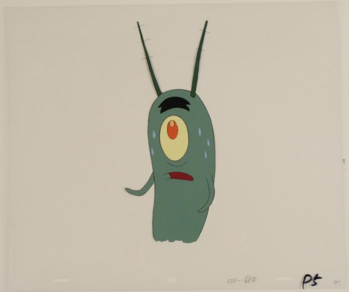 This original animation cel is from the Nickelodeon TV show SpongeBob Squarepants. The story takes place under the deep blue sea in Bikini Bottom, where SpongeBob resides. SpongeBob, who is a yellow, porous sponge, is your typical happy-go-lucky character, as he is always cheerful and enjoys making people laugh. Patrick Star, SpongeBob's neighbor who is a starfish, is your average children's show idiot, as he boasts knowing nothing and is often getting himself into ridiculous situations. Between the homes of these two lies the home of the miserable Squidward, a squid, who is known for being grouchy and playing tricks on SpongeBob and Patrick. Both SpongeBob and Squidward work at the Krusty Krab, a fast food business run by the greedy money-loving Mr. Krabs, a crab, the arch rival of the evil, possibly misunderstood, Plankton. Another neighbor, Sandy Cheeks, an athletic squirrel who normally wears an astronaut's space suit, was introduced in "Tea at the Treedome." She spends most of her time inventing and experimenting. Has Plankton finally been caught after numerous attempts to steal Mr. Krabs secret ingredients to his infamous Krabby Patties?Original Production Animated Cel Overall Size of Cel: 10 1/2" x 12 1/2" Excellent ConditionThis is an original hand-painted cel set-up used in the production of an episode of "SpongeBob SquarePants." Each one-of-a-kind set-up represents a slight change in position of the characters. When individually photographed and projected in rapid succession, the images appear to move.