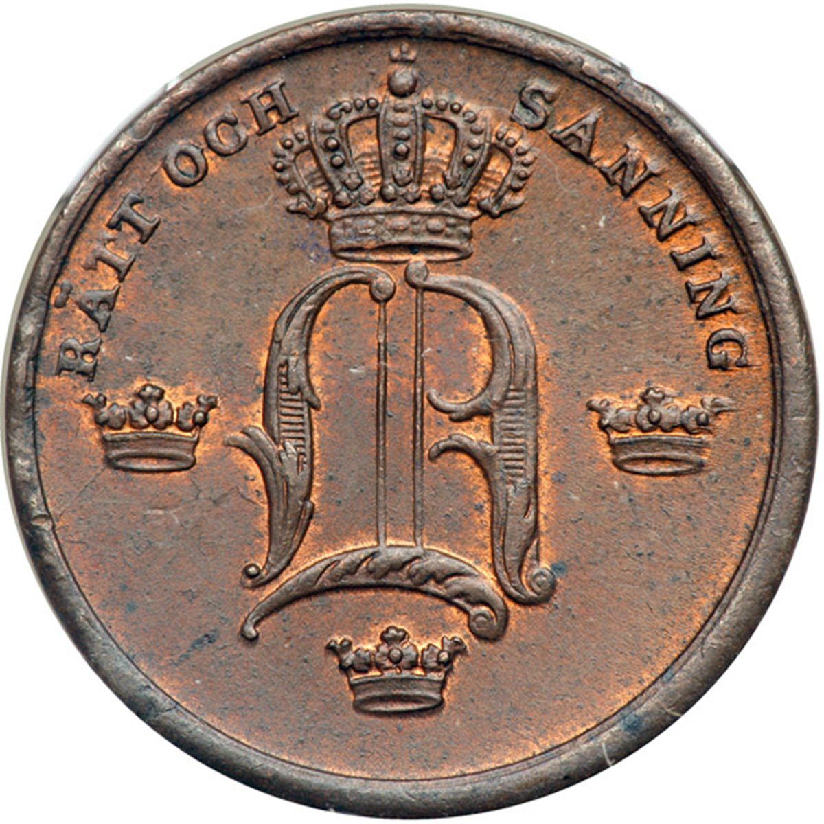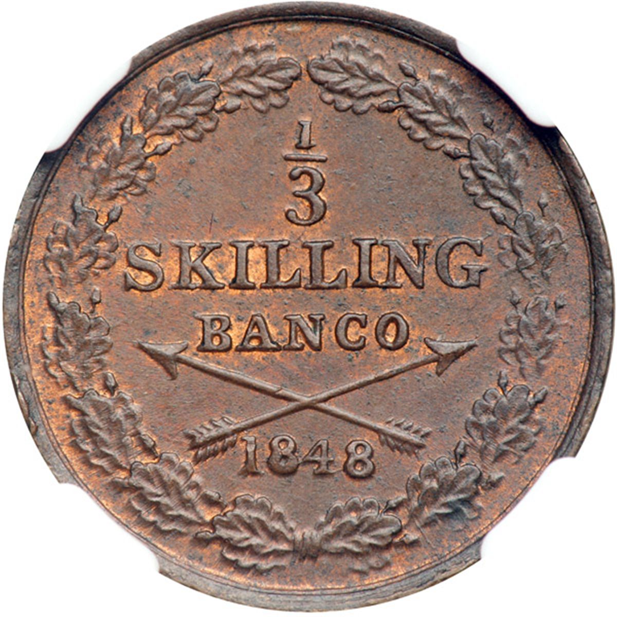 Sweden. 1/3 Skilling, 1848. SM-114a; KM-657. Oscar I. Trace of mint red. NGC graded MS-62 Brown.