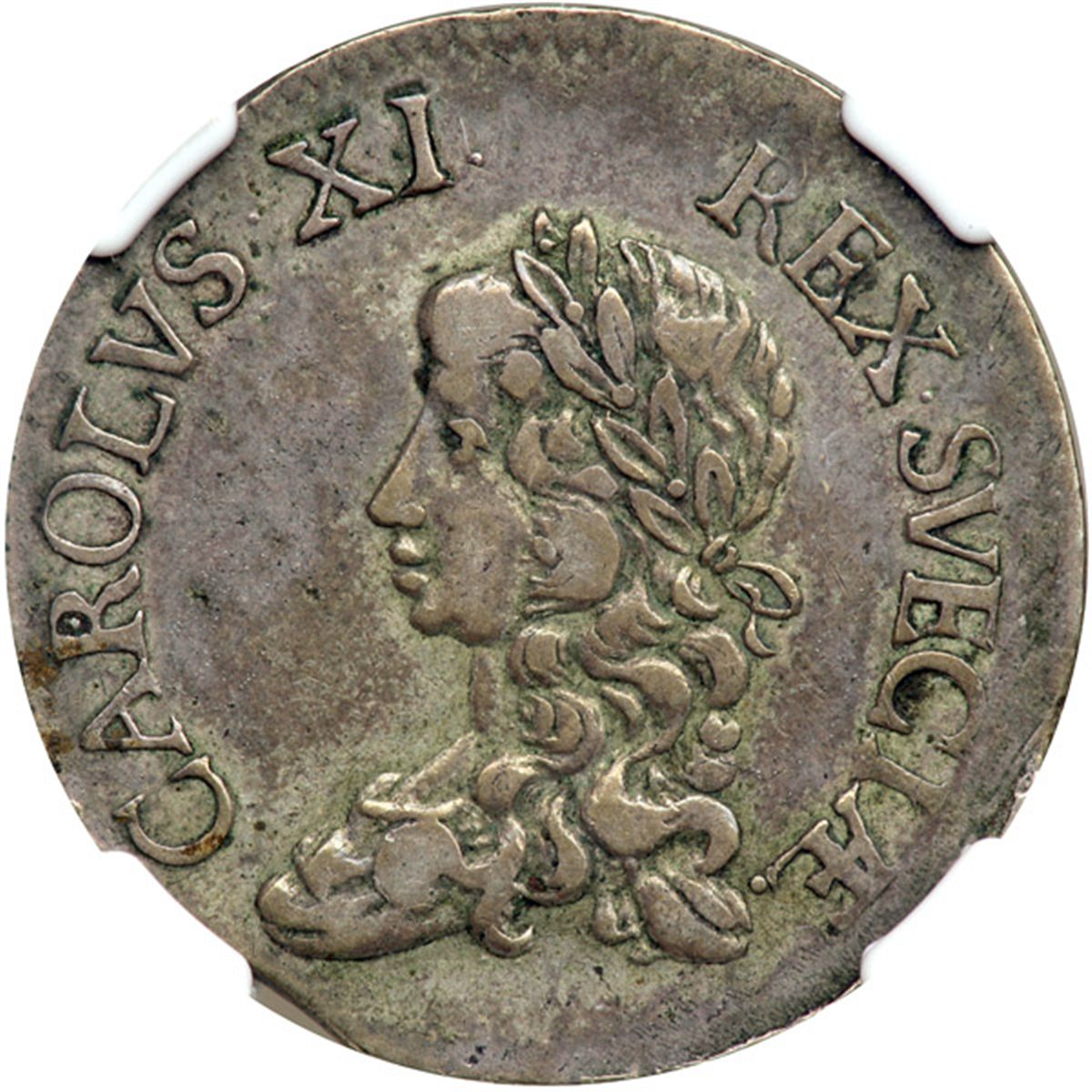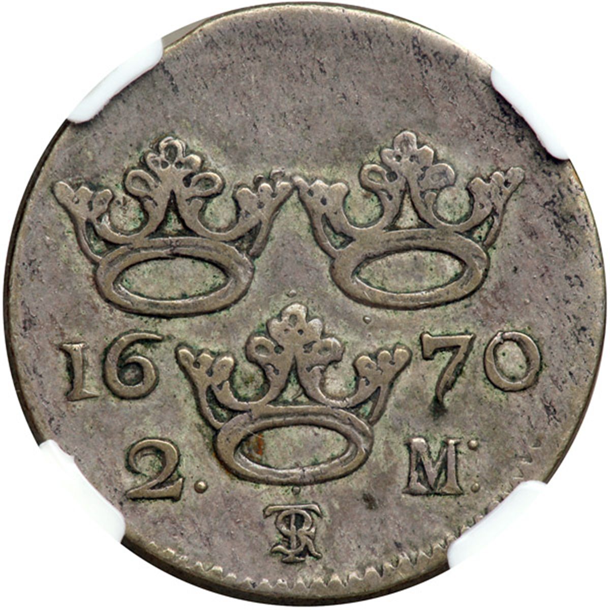 Sweden. 2 Mark, 1670. Ahl-121b; KM-242. Carl XI. Laureate head left. Reverse: Three crowns and date. Toned. NGC graded EF-40.