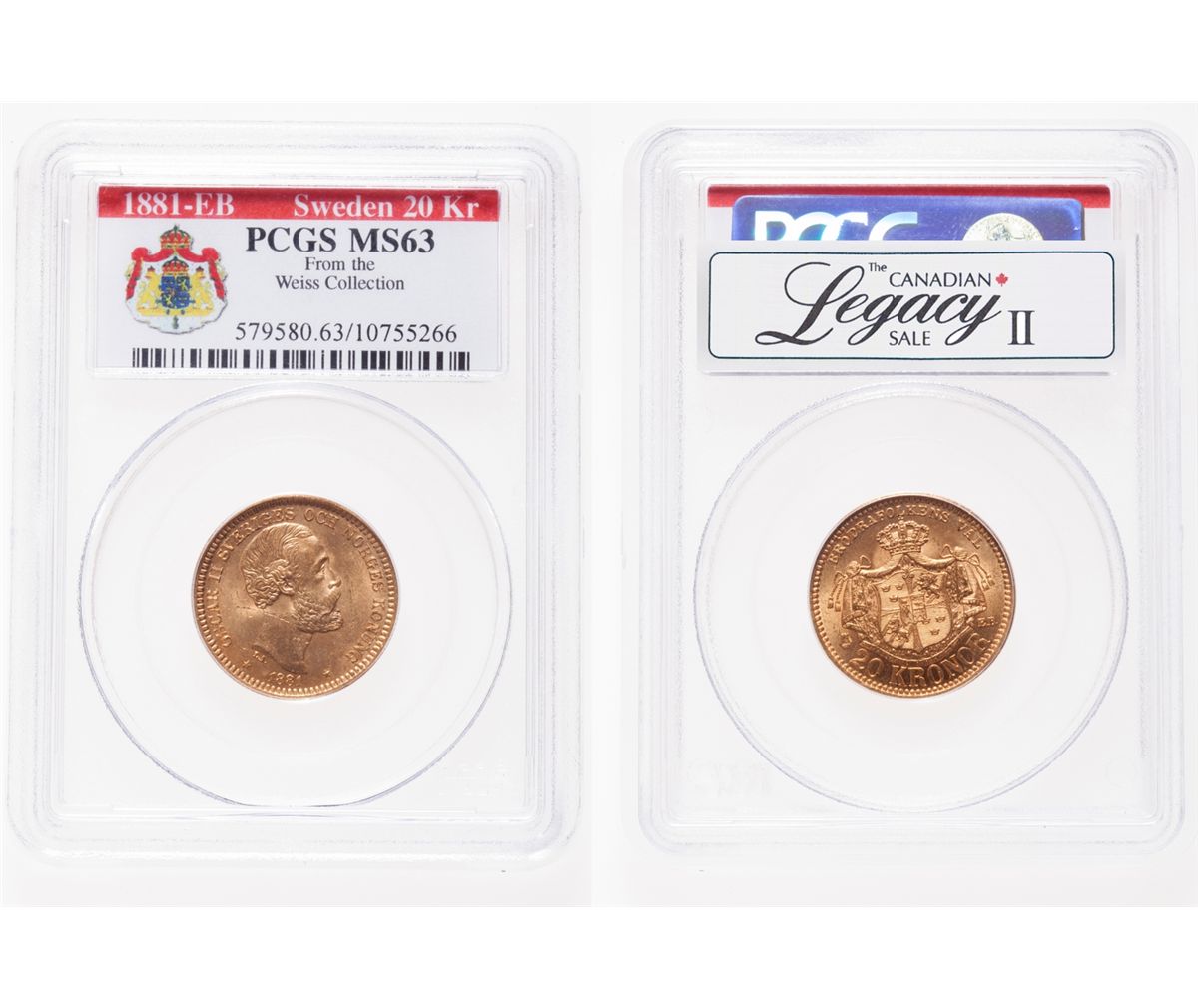 SWEDEN. 20 Kronor. 1881-EB. Weiss Collection. PCGS graded Choice Uncirculated-63. Gold .900, 8.9606g, 0.2593 oz AGW.
