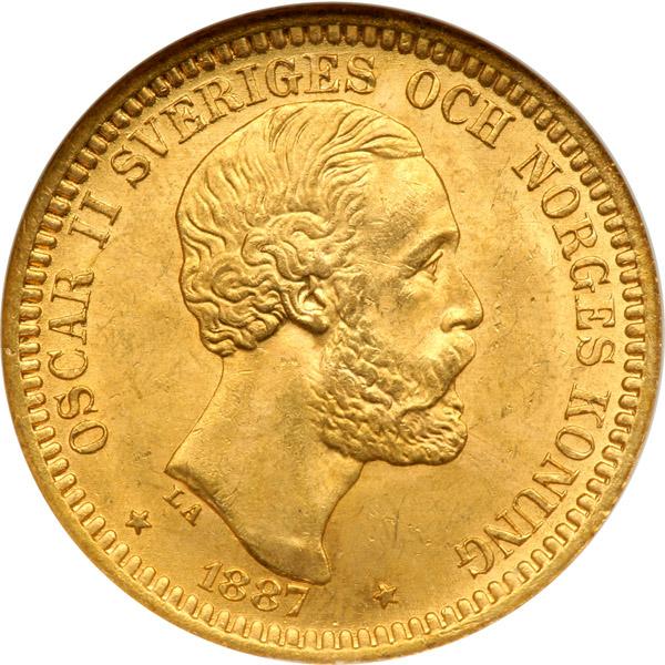Sweden. 20 Kronor, 1887-EB. Fr-93a; KM-748. Weight 0.2593. Oscar II. Scarce date in premium grade. NGC graded MS-65.