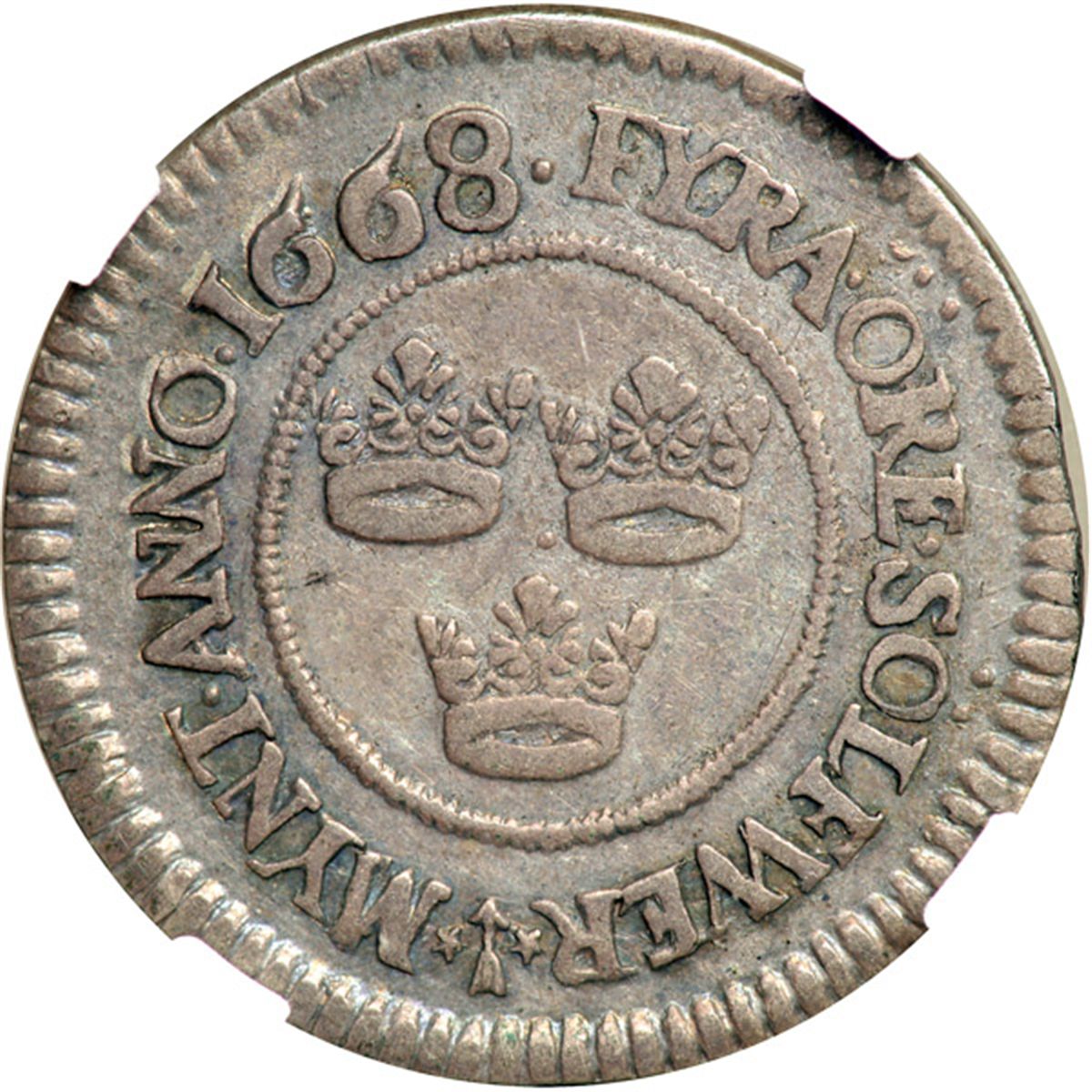 Sweden. 4 Ore, 1668. Ahl-191; KM-257. Karl XI. Crowned C. Reverse: Three crowns. Toned. NGC graded VF-35.