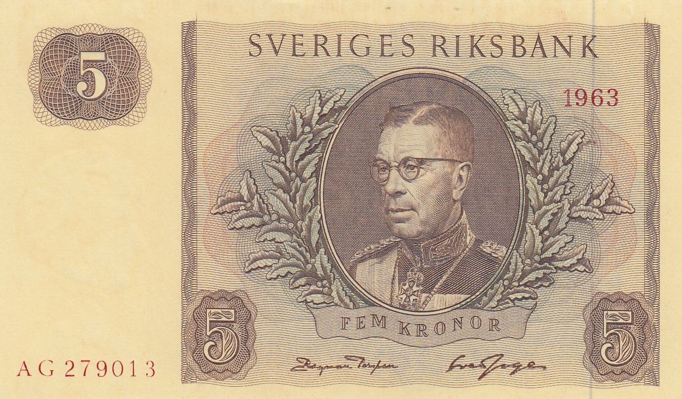 Sweden, 5 Kronor, 1963, UNC, p50bbr/serial number: AG 279013