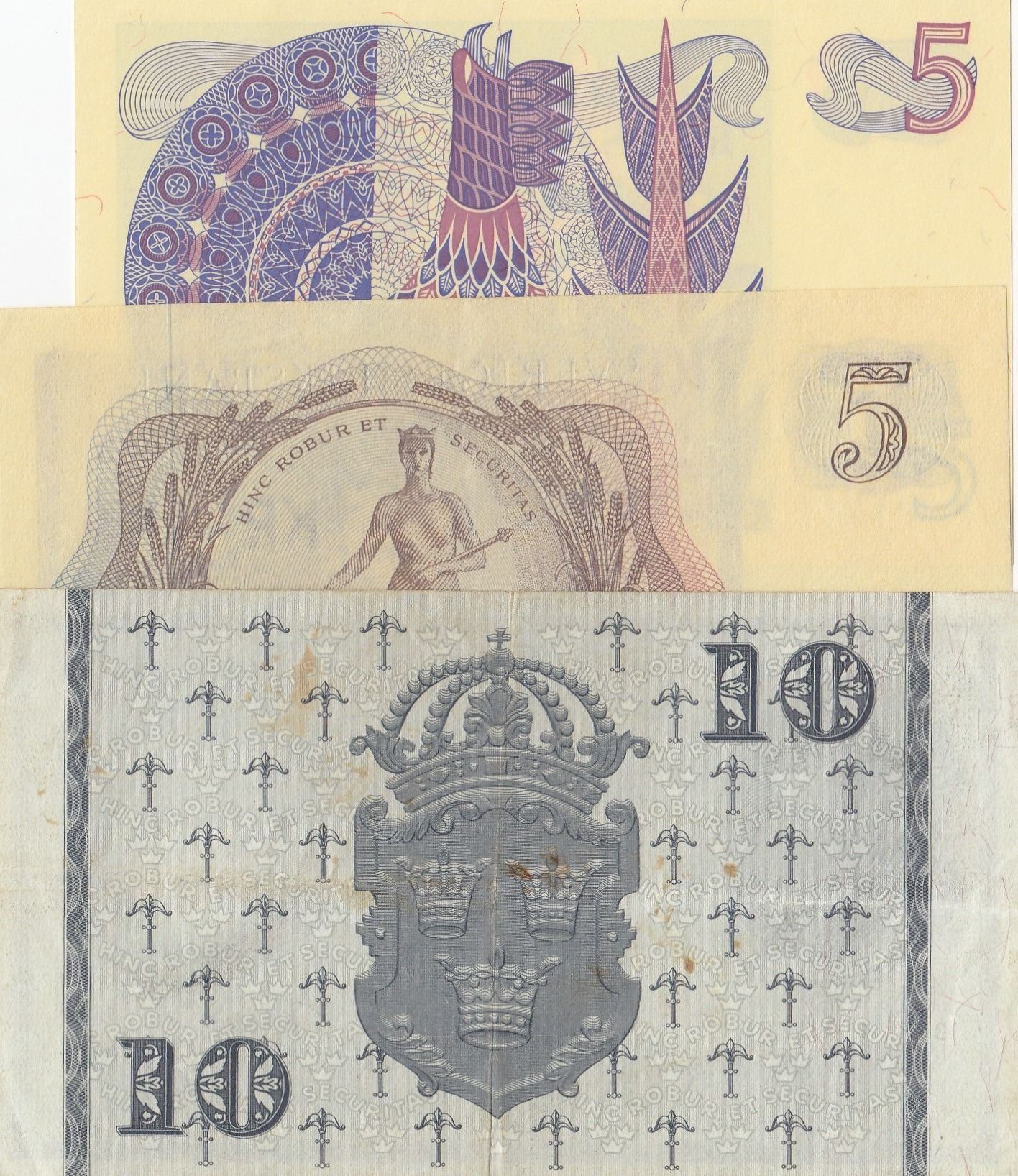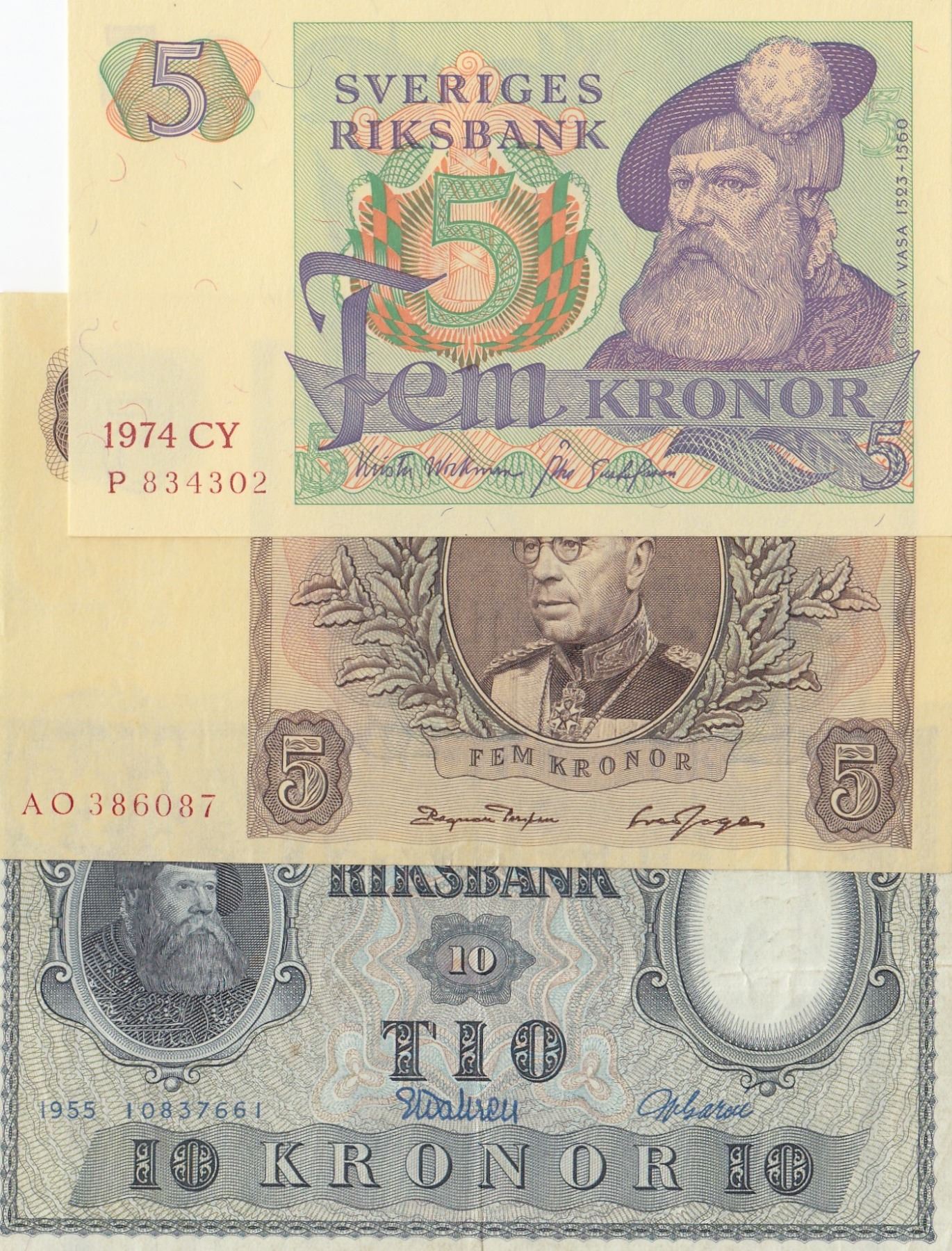 Sweden, 5 Kronor (2) and 10 Kronor, 1955/1963/1974, XF/ AUNC / UNC, p43b, p50b, p31r3, (Total 3 bank