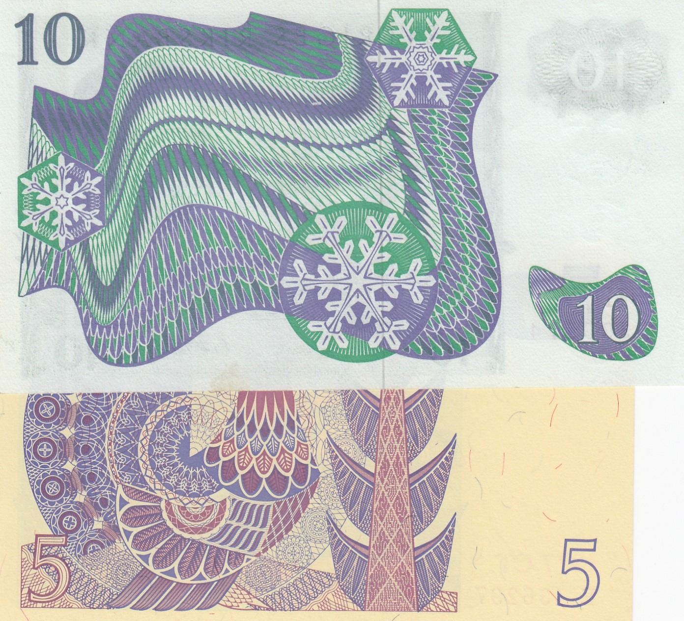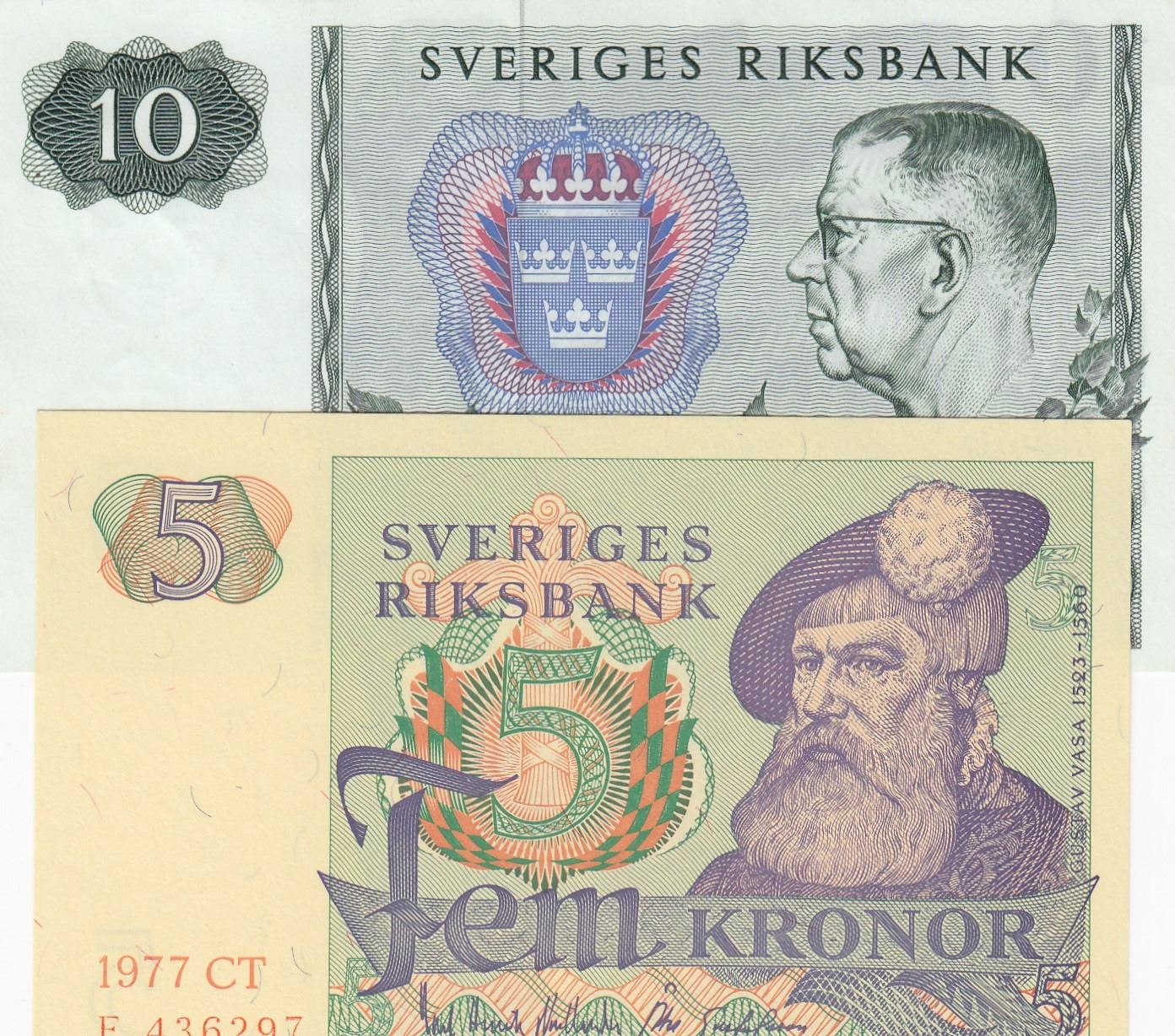 Sweden, 5 Kronor and 10 Kronor, 1971/1977, UNC, p51c, p52c, (Total 2 banknotes)br/serial numbers: E 436297 and E 390574, "10 Kronor" has a trail of bundle crush.