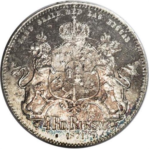 <B>Carl XV 4 Riksdaler Riksmynt 1871-ST, </B></I>KM726, sharply detailed AU-UNC, slightly prooflike surfaces with oldtime gray patina, very attractive type coin.<BR><BR><b>Shipping:</b> Coins & Currency (<a target="_blank" href="http://www.heritageauctions.com/common/shipping.php">view shipping information</a>)