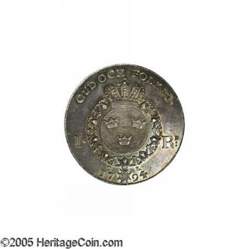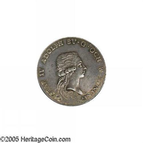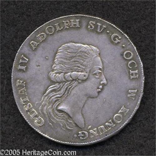 <B>Gustaf IV Adolph Riksdaler 1794-OL, </B></I>KM540.3, choice toned XF+, very bold and exceptionally attractive.