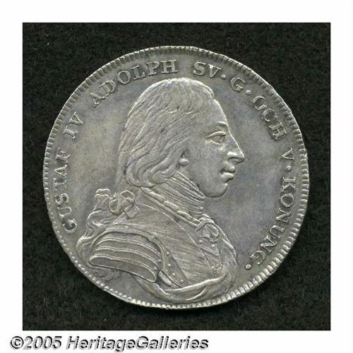 <B>Gustaf IV Adolph Riksdaler 1801-OL, </B></I>KM561, XF-AU, extremely sharp details but lightly cleaned. Still an appealing example of this crown-sized issue.
