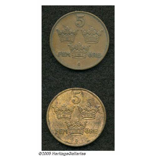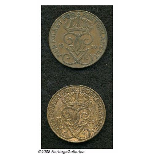 Sweden. Gustav V 5 Ore 1910 - Two Examples, KM779.2, rare d Gustav V 5 Ore 1910 - Two Examples,