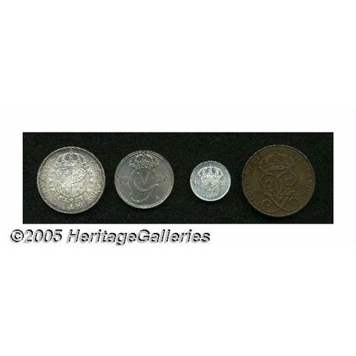 <B>Gustav V Assortment of Minors, </B></I>5 Ore 1927, rare date, VF with small adhesions on the reverse, 10 Ore 1937, prooflike BU, 50 Ore KM796 nickel type 1924, choice AU and very scarce, and Krona 1926, gem toned UNC. <B>Sold as is, no return lot.</B></I>