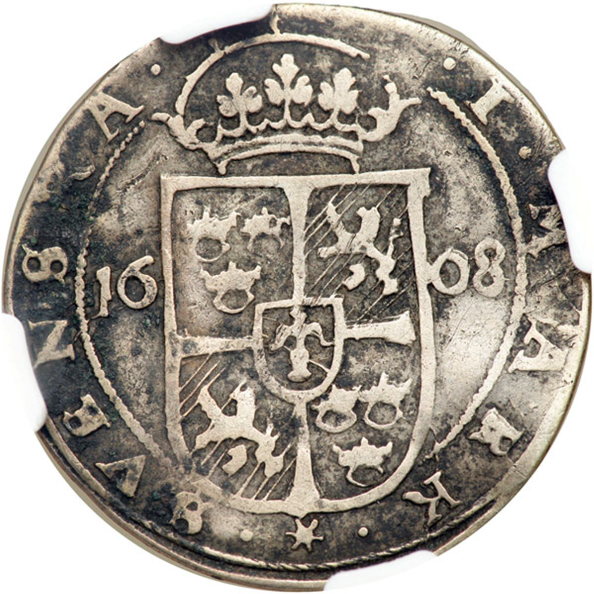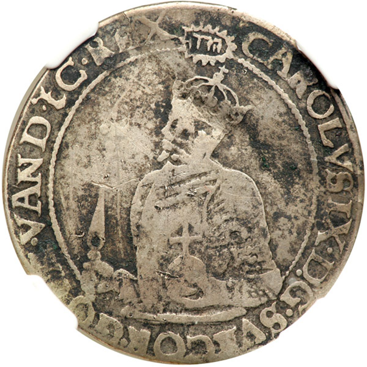 Sweden. Mark (8 Ore), 1608. KM-22. Carl IX. Hebrew 'Jehovah' above half-length crowned figure left. Reverse: Crowned arms. Surface corrosion. NGC graded Fine, Details (Bent, damaged).